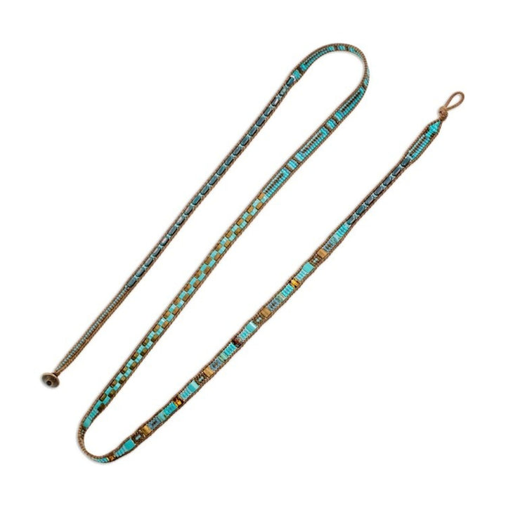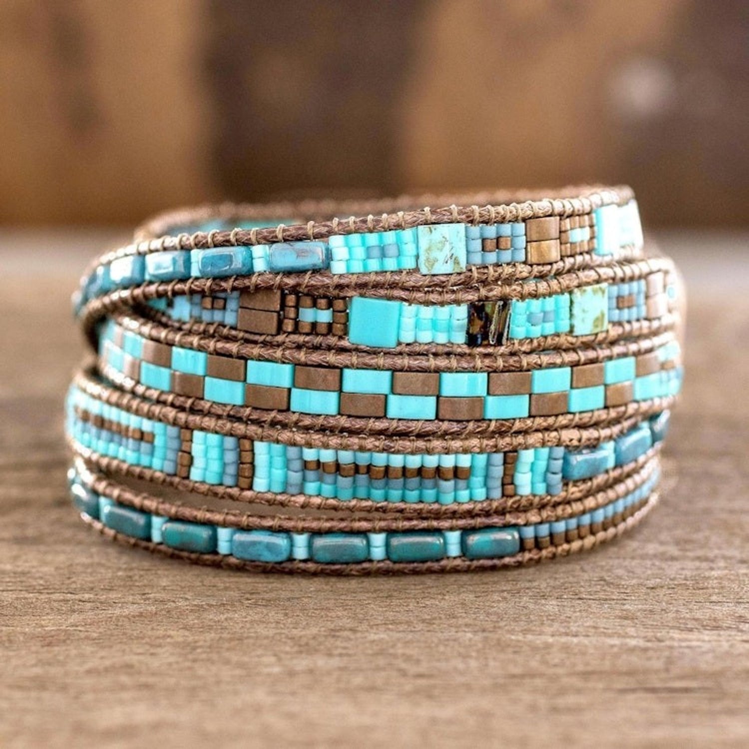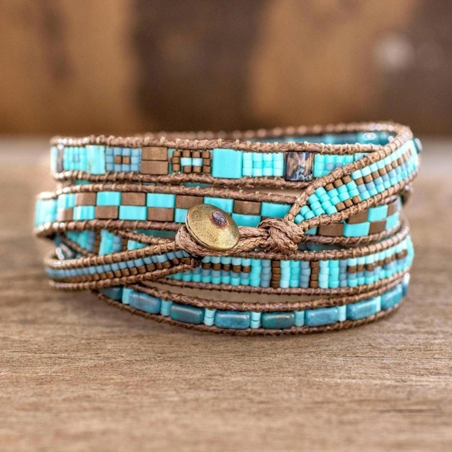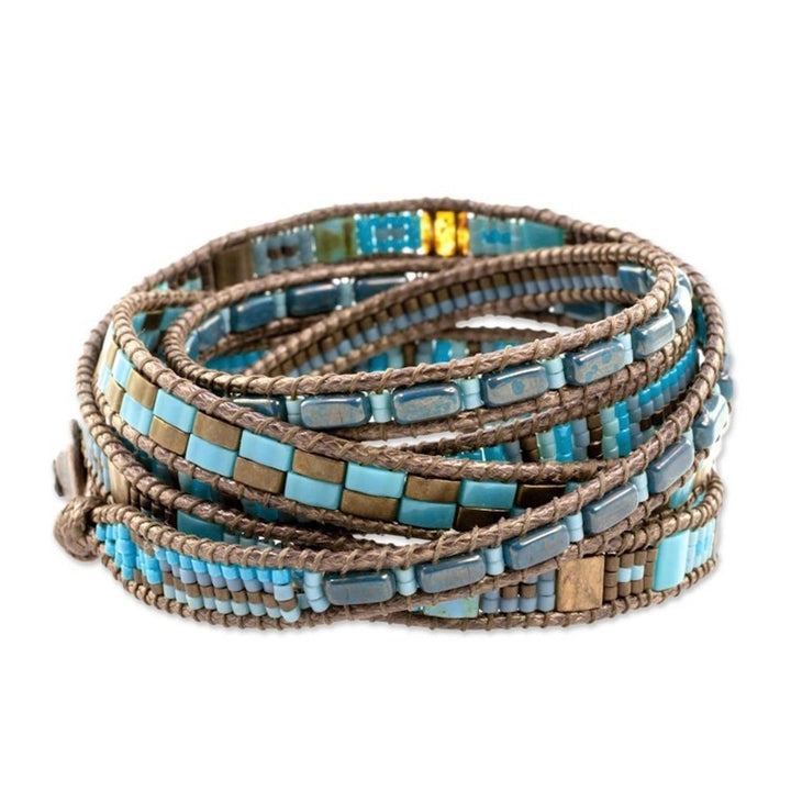 This Colorful Glass Beaded Wrap Bracelet from Guatemala 'Traditional Style' by Cristobal Ramirez is a stylish piece meticulously handcrafted with petite glass beads in different shapes. The beads are strung on nylon cord using a specialized loom, showcasing a traditional style. The bracelet features colors of turquoise blue and bronze and closes with an antiqued pewter button. This piece carries the spirit of freedom and cultural heritage, celebrating imagination and the enduring beauty of artisanal expression.
