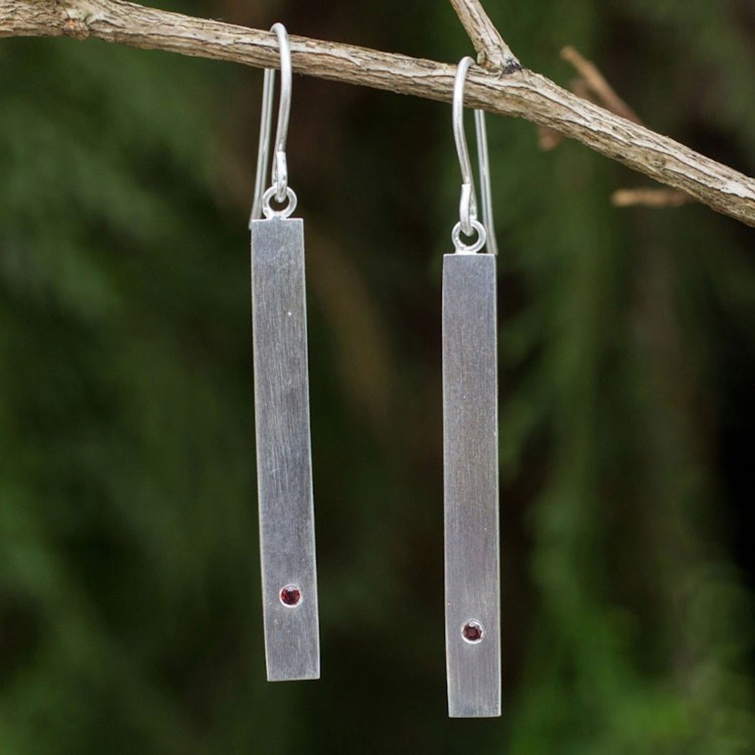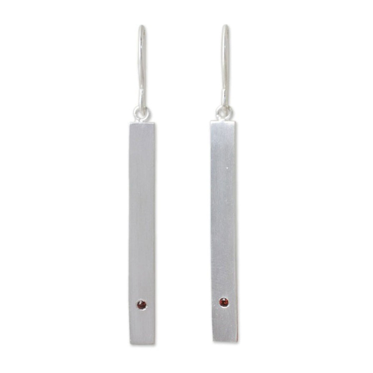 These Contemporary Brushed Silver Earrings with Genuine Garnets 'Simple Devotion' by Jantana are sleek and contemporary dangle earrings. Working in sterling silver with her signature brushed satin finish, she adds sparkling garnets, the gemstone of passionate devotion, to earrings of elegant simplicity. The artisan is proud to create opportunities for others, including artisans with disabilities, while preserving her parents’ legacy. Her collections balance delicacy and modern appeal.