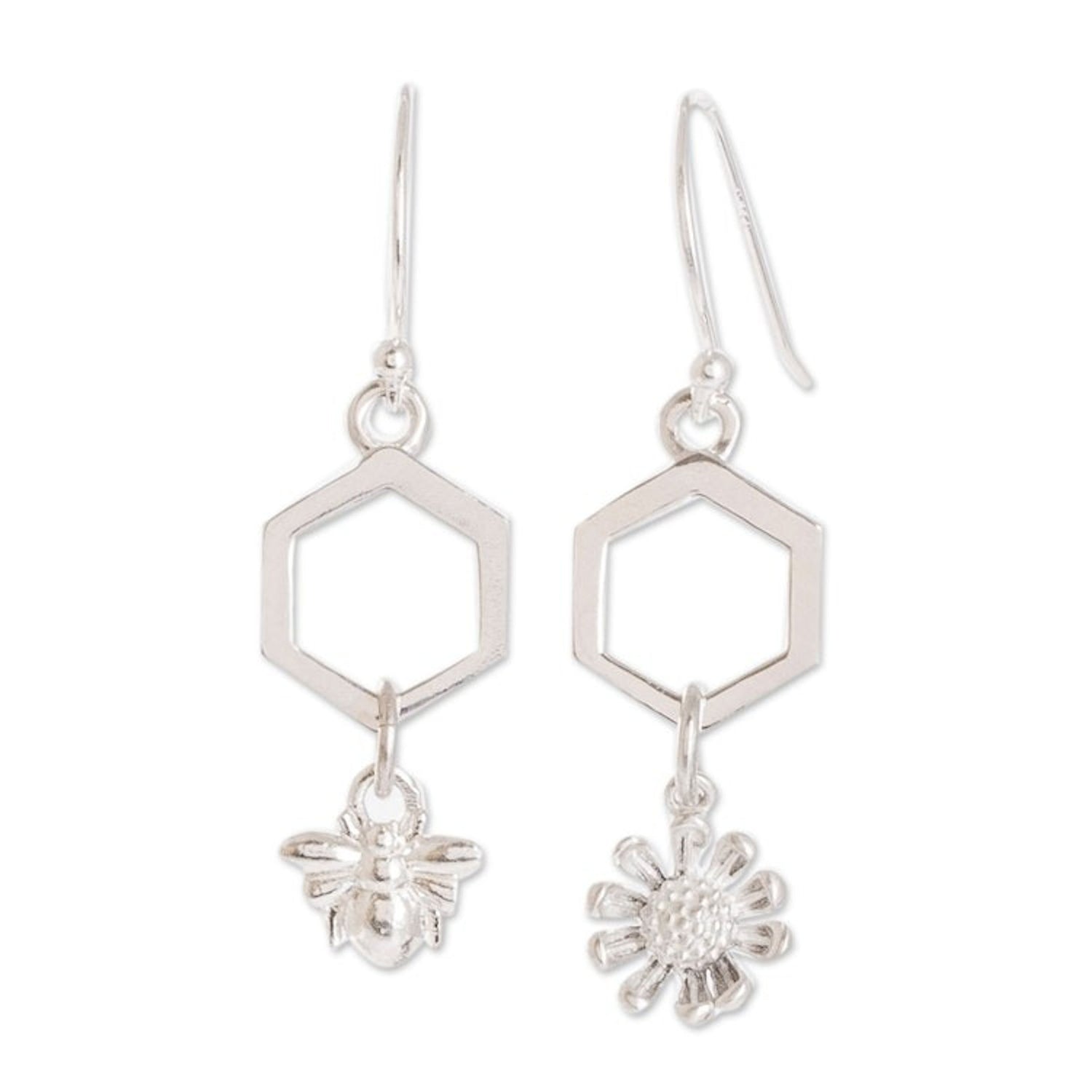 Costa Rican Sterling Silver Bee and Flower Dangle Earrings 'Honeycomb Flower'