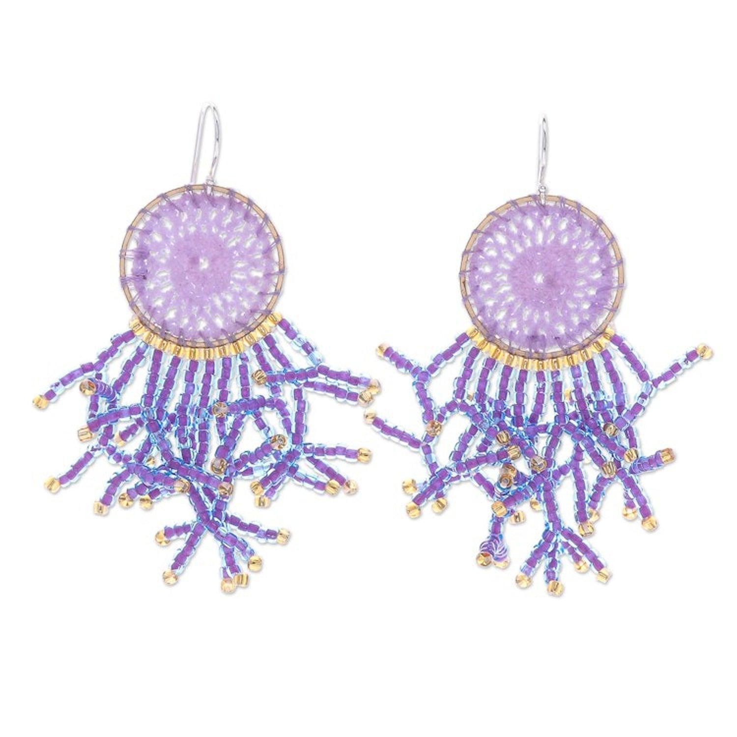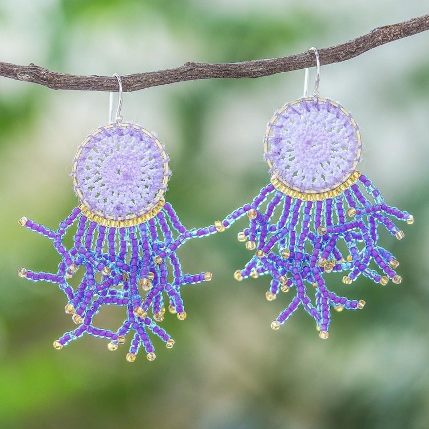 These Crocheted Dreamcatcher Earrings with Orchid Glass Beads 'Dreaming Tree in Orchid' by Nareerat are eye-catching dangle earrings in shades of green with golden accents. Hung from sterling silver ear hooks, brass rings are crocheted with light purple cotton thread to form a dreamcatcher, with strings of orchid glass beads hanging below. The artisan's mission is to keep the art of handmade jewelry alive for future generations by creating pieces with delicate manual techniques.