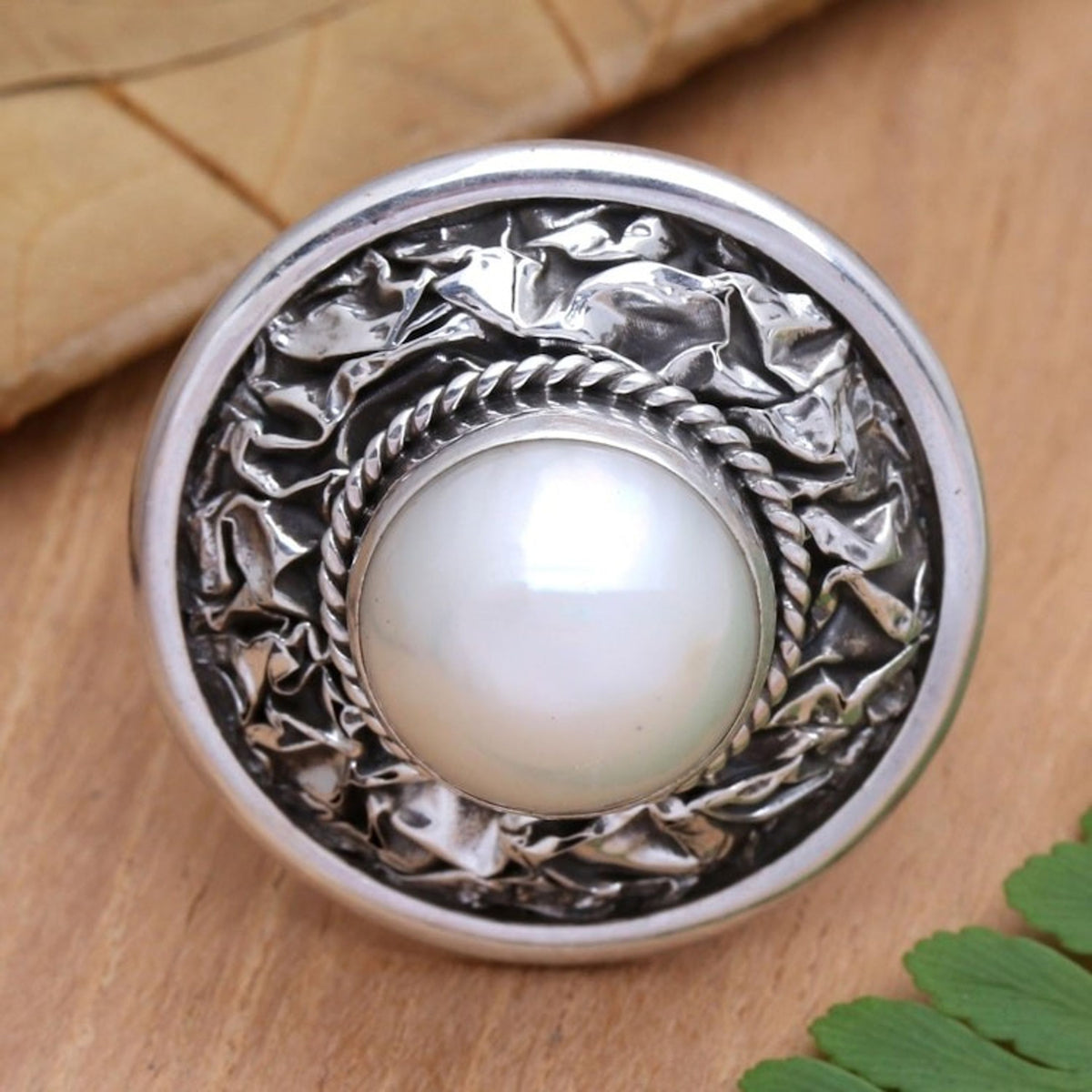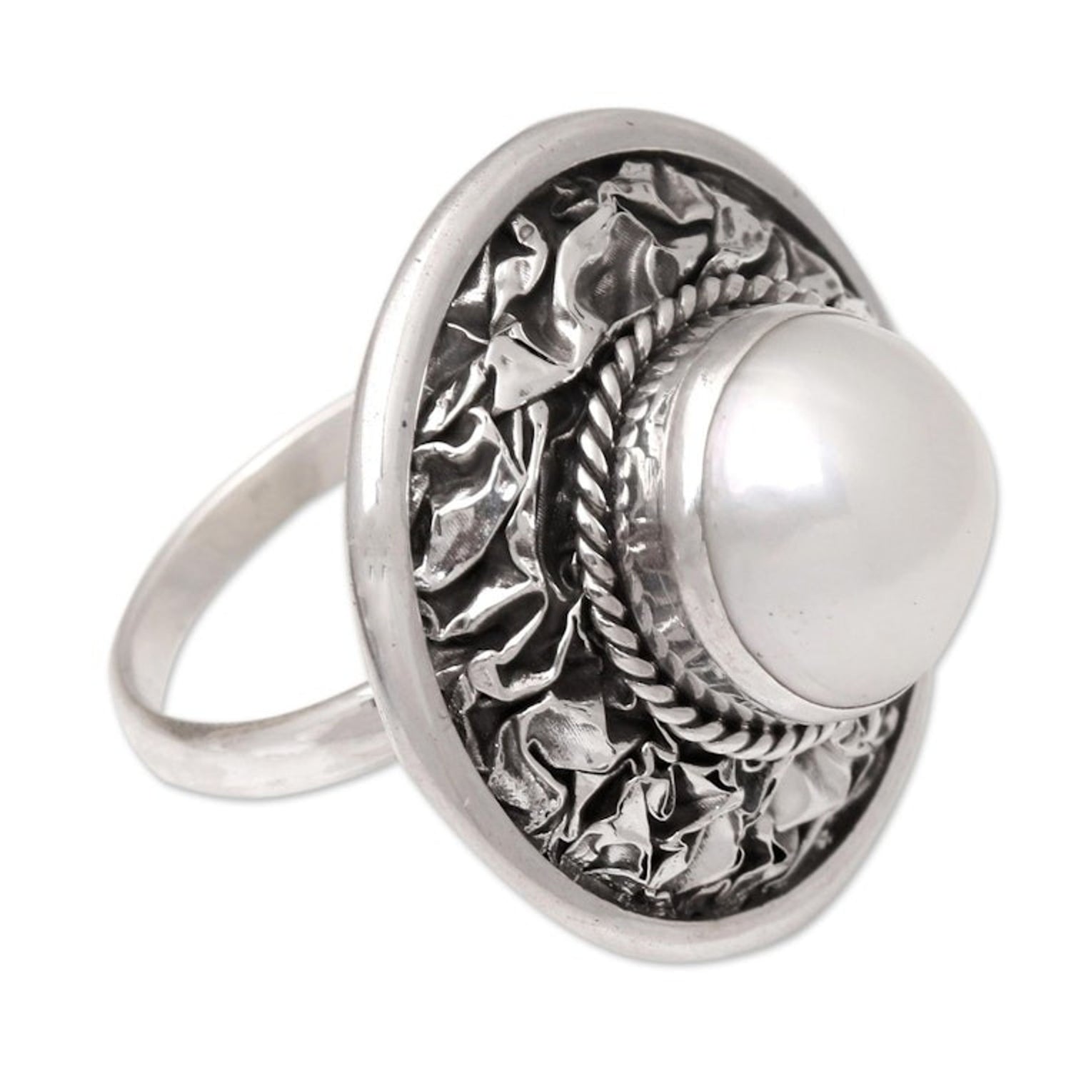 This Cultured Freshwater Pearl and Sterling Silver Cocktail Ring 'Lunar Plane' by Anya features a smooth pearl that radiates with ethereal light, surrounded by a crinkled paper motif. The Balinese artisan hand-crafts the ring from sterling silver, centering her creation with a large cultured freshwater pearl. He mentors a team of ten silversmiths, encouraging innovation while preserving cultural heritage.