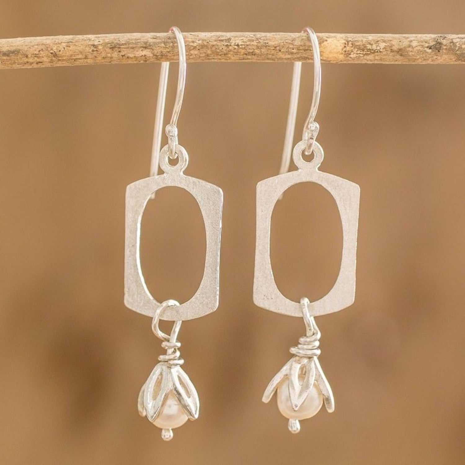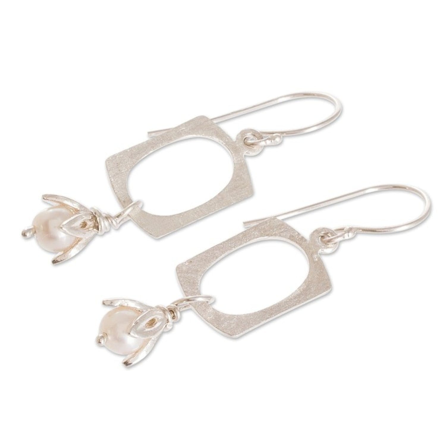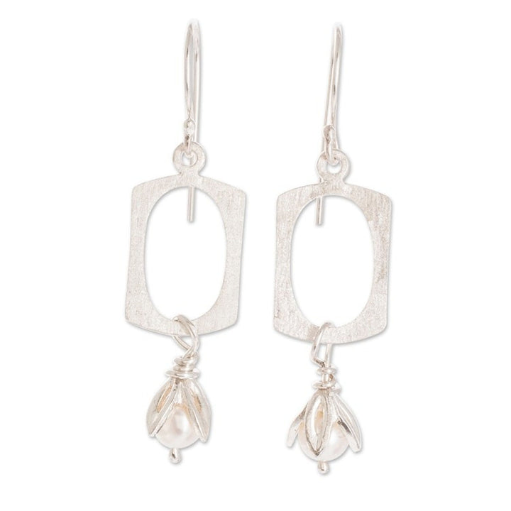 These Cultured Pearl and 925 Sterling Silver Dangle Earrings 'Pearl Awakening' by Guisselle Mora are sterling silver dangle earrings with cultured pearl-accented flowers. The artisan crafts pieces inspired by the beauty of nature and sees her work as a creative expression infused with faith, perseverance, and care.