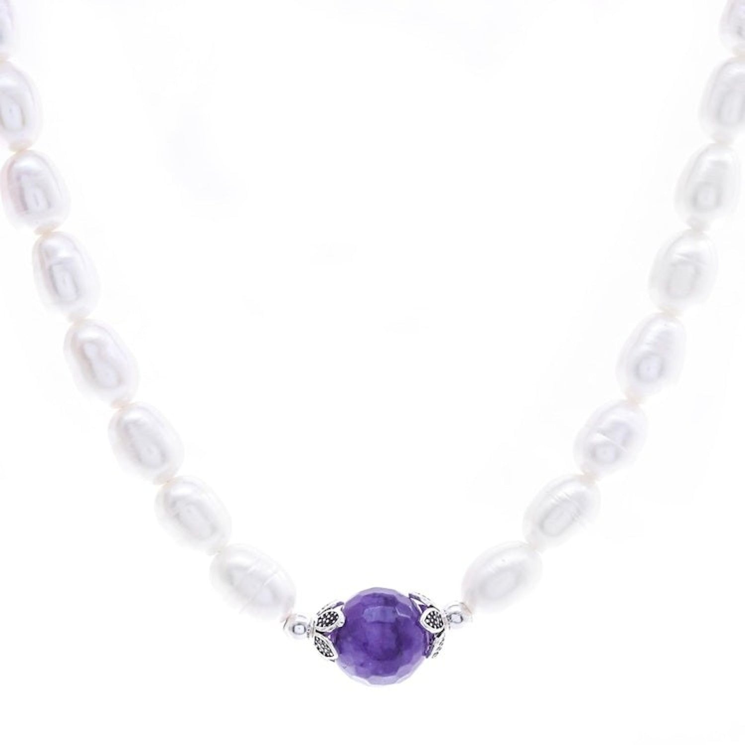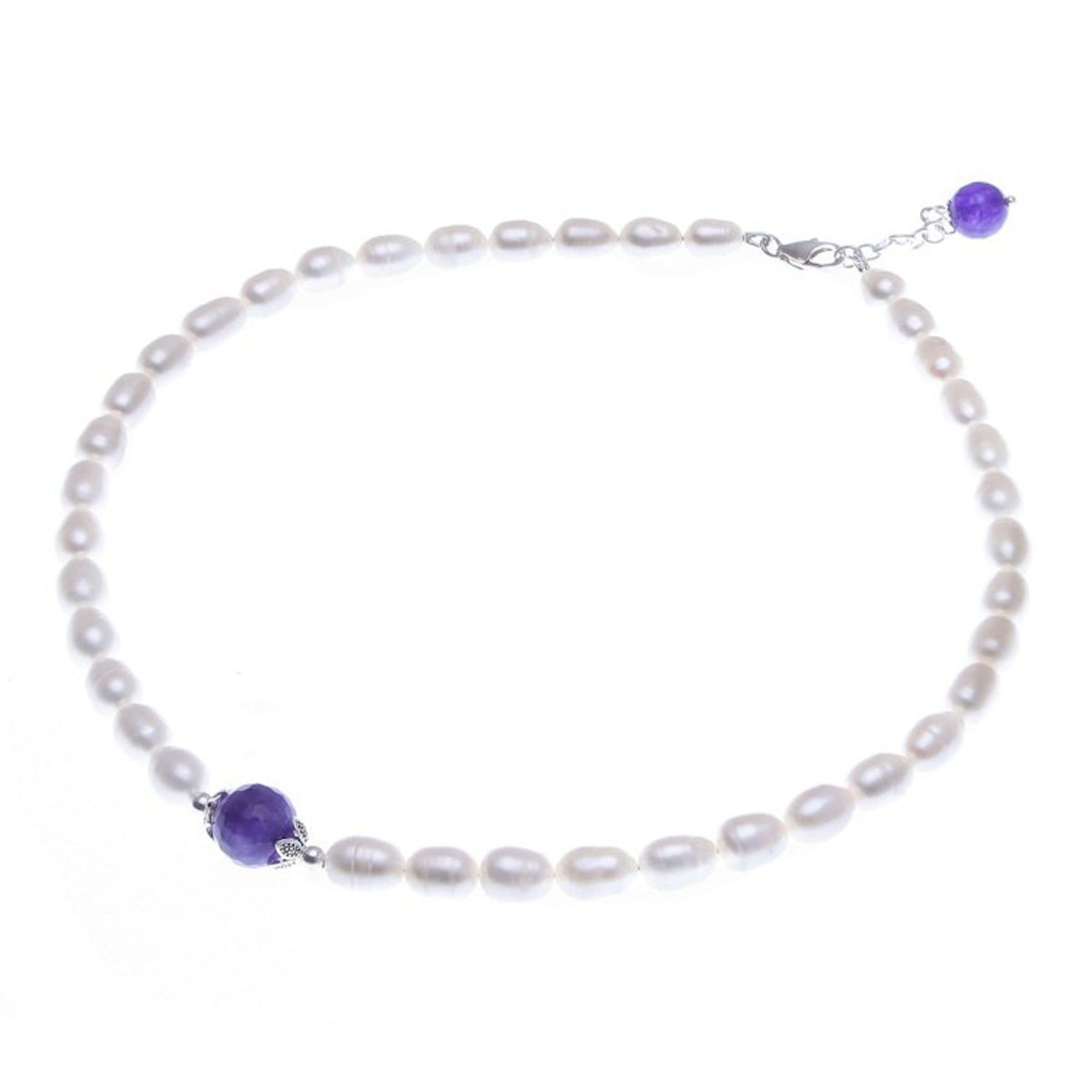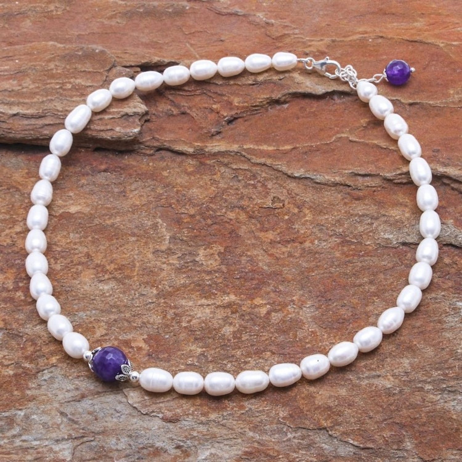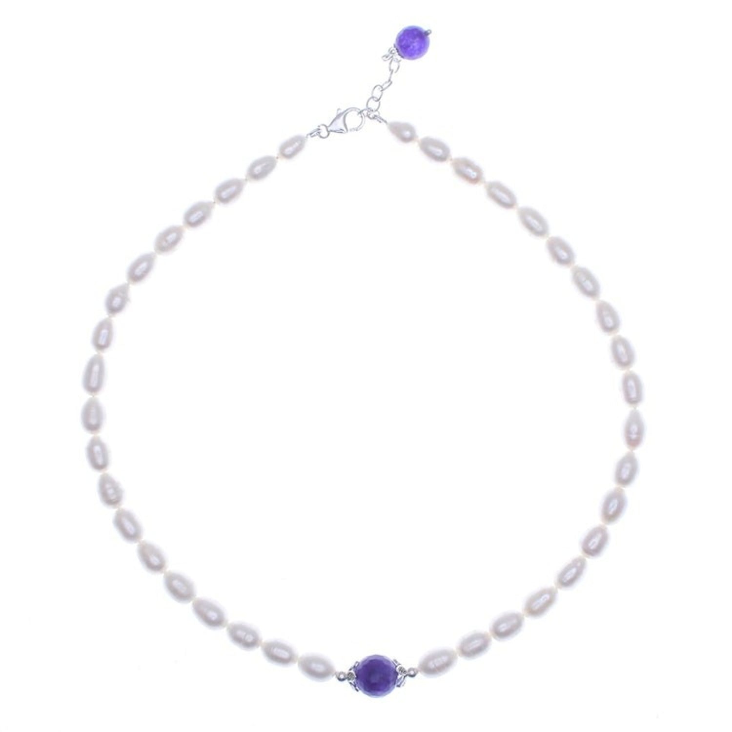 Handcrafted from cultured freshwater pearl, amethyst, and 925 sterling silver with a combination finish, this necklace weighs 1.54 oz. The necklace is 18 inches L and 8 mm W, with a 1.2-inch extender. The pendant measures 0.5 inches L x 1 inch W and has a lobster claw clasp. The natural stone's color and variegation will vary.