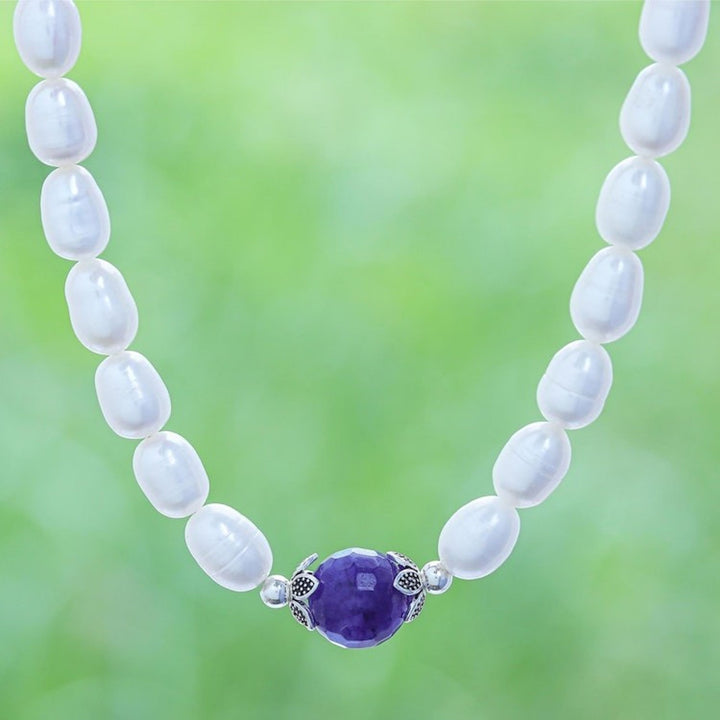 This Cultured Pearl and Amethyst Pendant Necklace 'Sea Throne' by Tipa is a lovely necklace that is an easy way to look effortlessly elegant. The Thai artisan centers a strand of cultured freshwater pearls with a single purple amethyst, held in place by sterling silver flower beads. The collection celebrates the artistry of silver while reflecting his journey from small-town origins to international horizons.