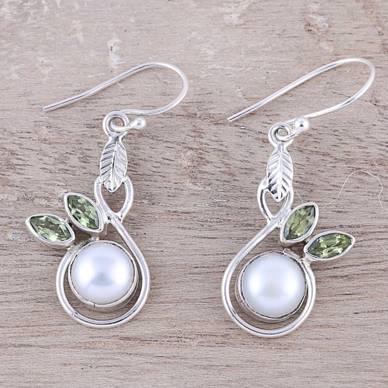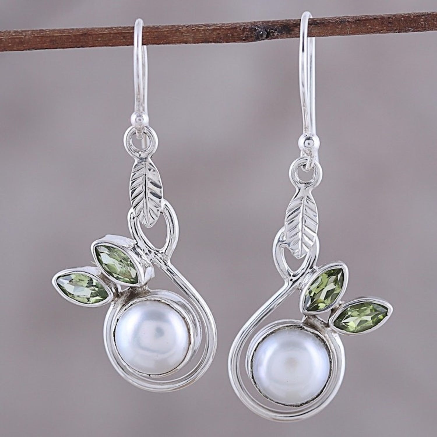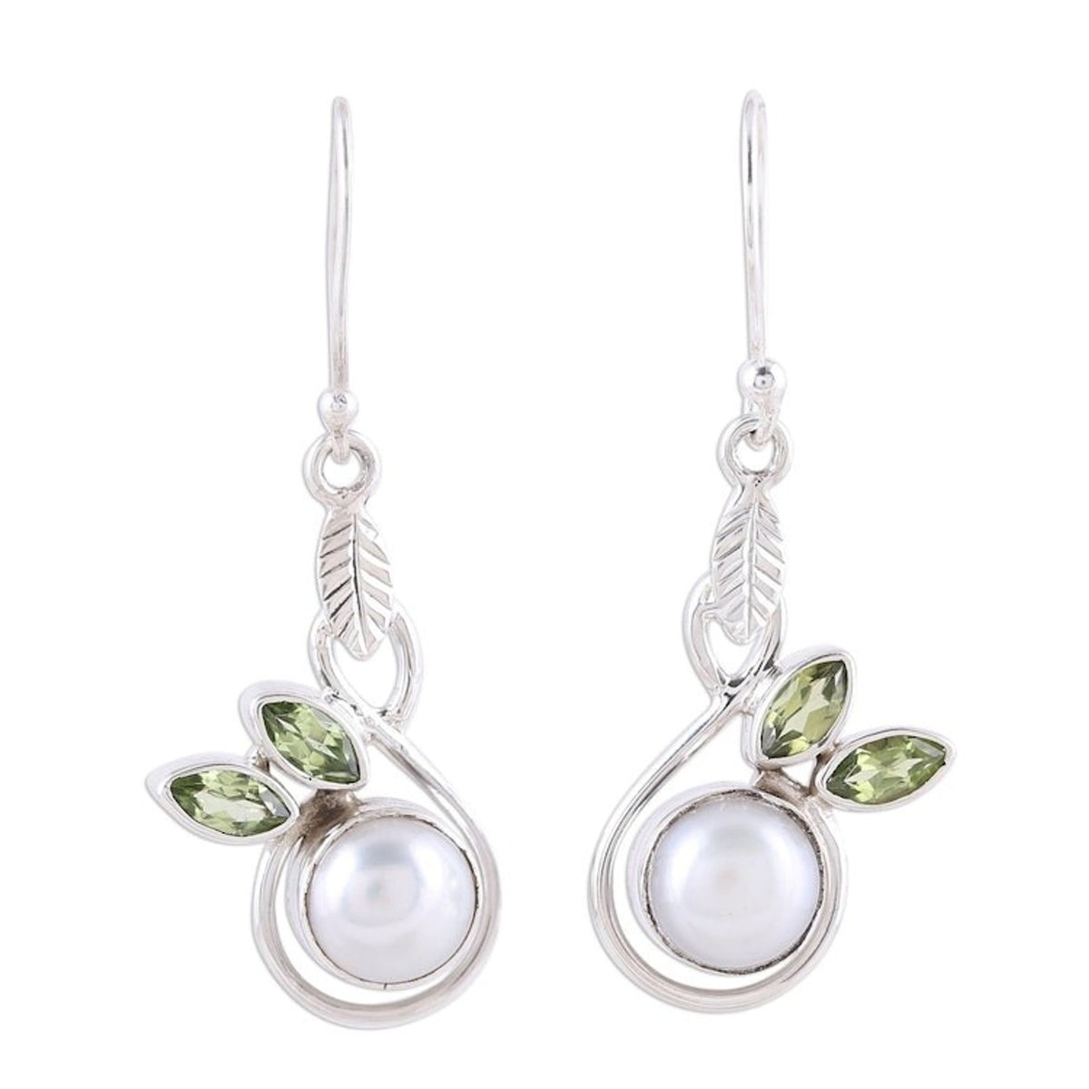 These Cultured Pearl and Faceted Peridot Dangle Earrings 'Spring Beauty' by Shanker evoke the beautiful verdure of springtime. Within the sterling silver earrings, leaf-shaped peridots rest atop glowing cultured pearls. Each piece represents the artisan's perseverance, tradition, and passion for his craft.