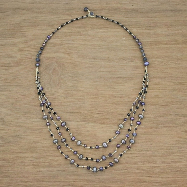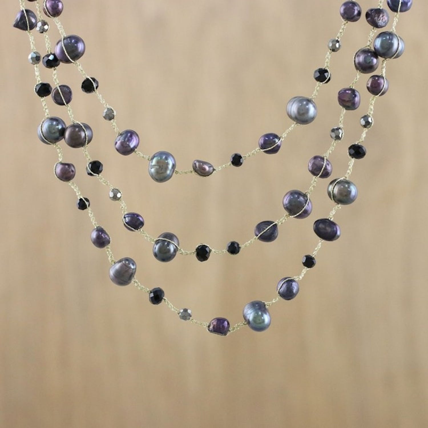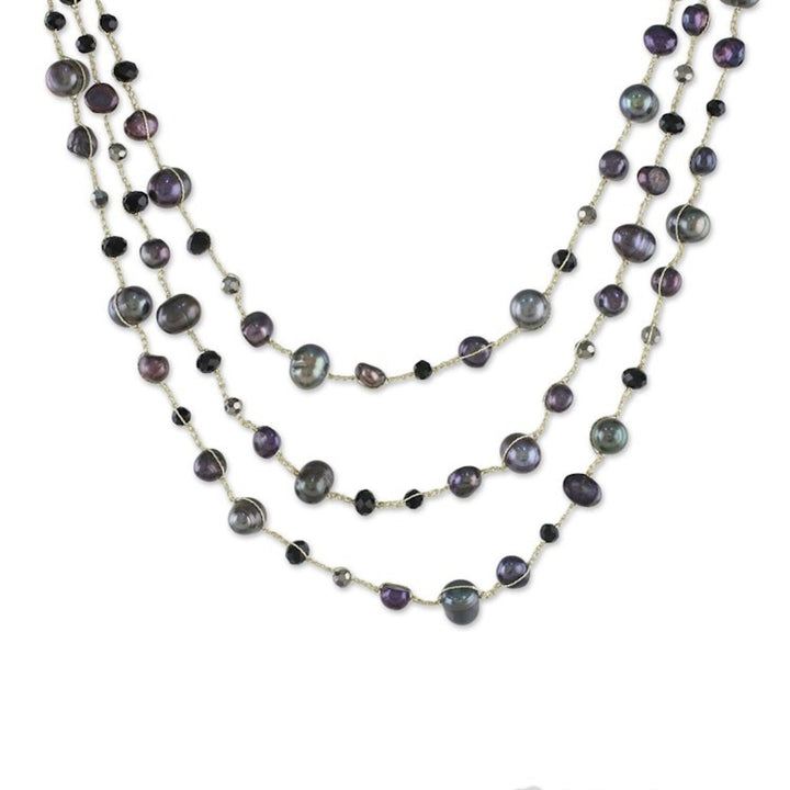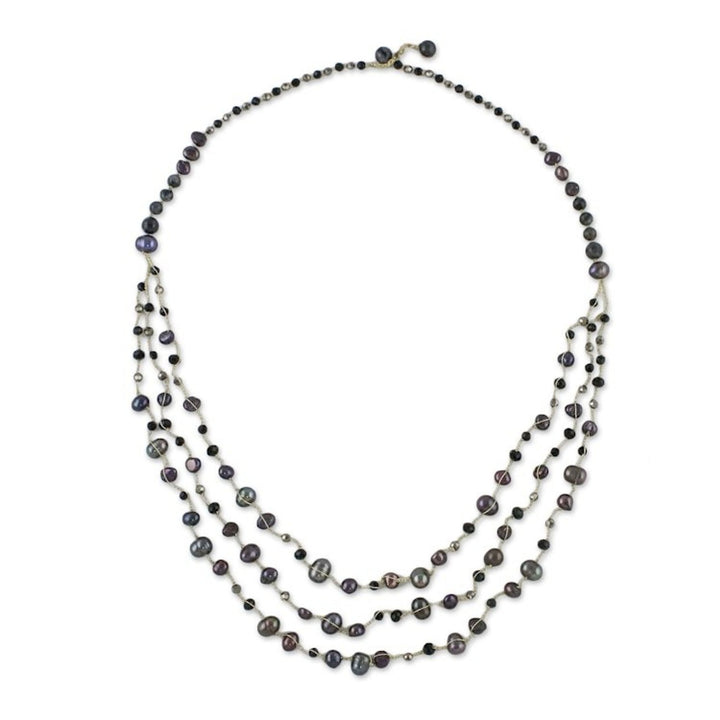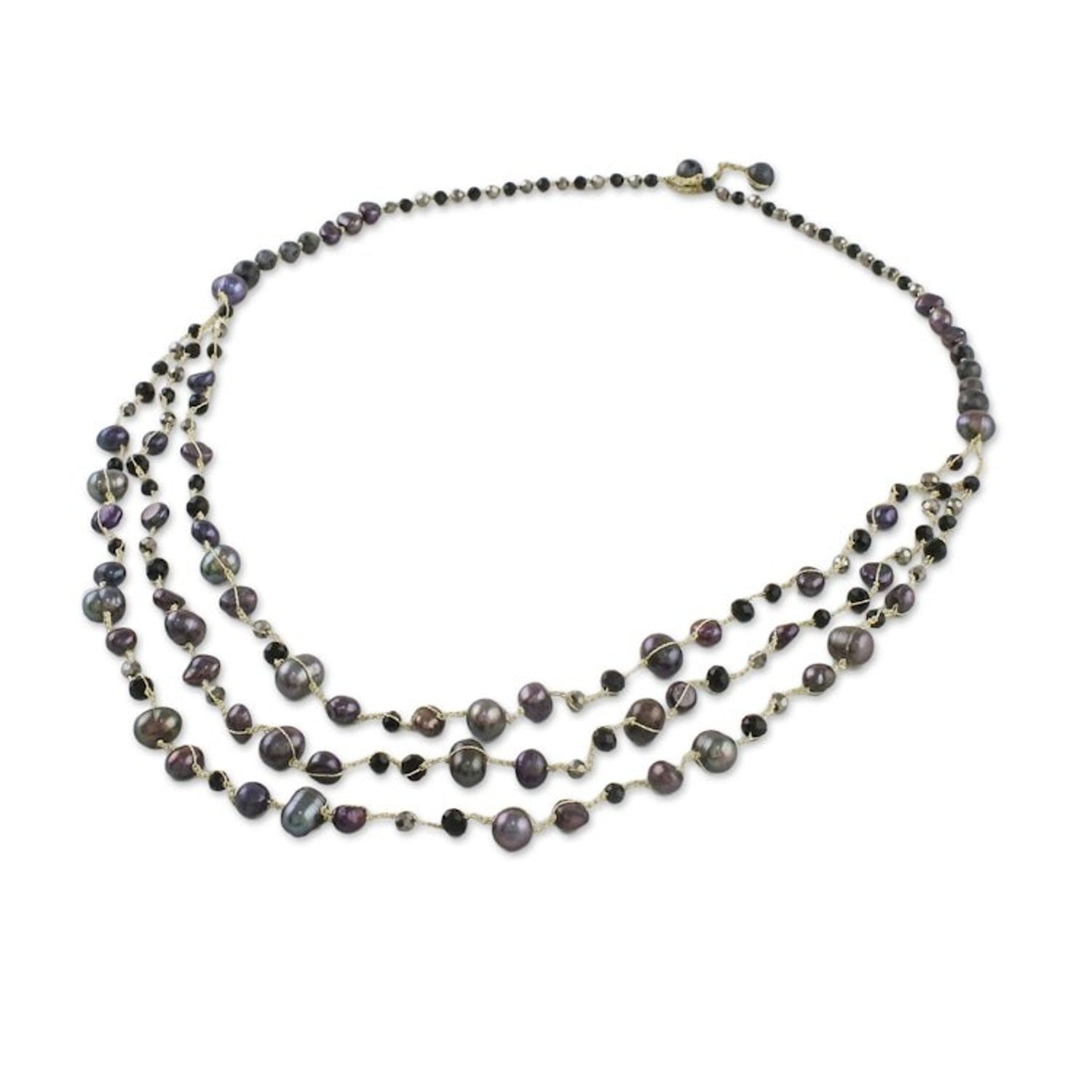 This Cultured Pearl and Quartz Beaded Necklace from Thailand 'Festive Holiday in Black' by Nareerat is a festive necklace where the tantalizing beauty of black and grey cultured pearls combines with tourmalinated quartz gemstones and glass beads. The necklace is strung on silk thread and features three beaded strands at the front. Her mission is to keep the art of handmade jewelry alive for future generations.