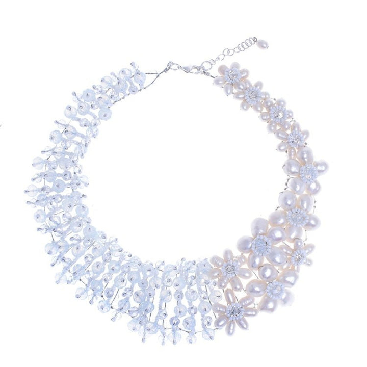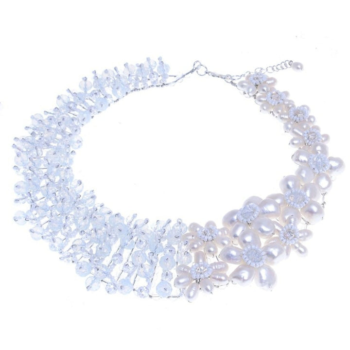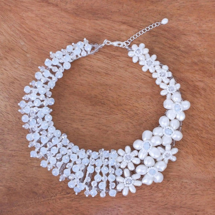 This Cultured Pearl and Rainbow Moonstone Choker Necklace 'Heavenly Song' by Nareerat is an ethereal necklace with a floral motif created by hand-threading cultured freshwater pearls along a wire frame. Rainbow moonstones, clear quartz, and glass beads add texture and depth. For the artisan, each piece is a celebration of skill, heritage, and community empowerment.
