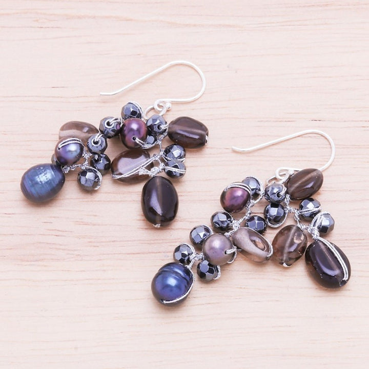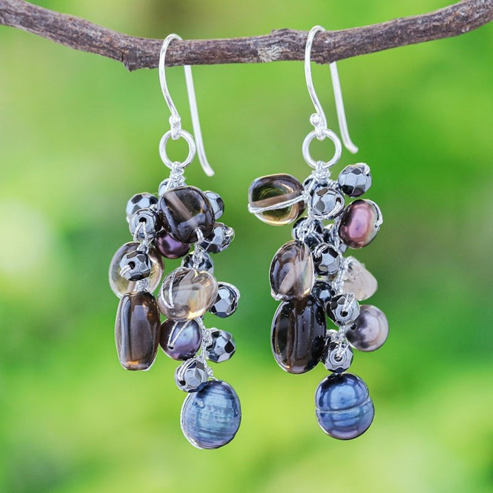 These Cultured Pearl and Smoky Quartz Dangle Earrings 'Wishing Pool' by Nareerat are a darkly elegant pair of dangle earrings. The artisan hand-knots shimmering silk thread around clusters of faceted hematite, iridescent black pearls, and smoky quartz beads. Elegant sterling silver hooks finish the pair with a touch of cool shine. The artisan's mission is to keep the art of handmade jewelry alive for future generations.
