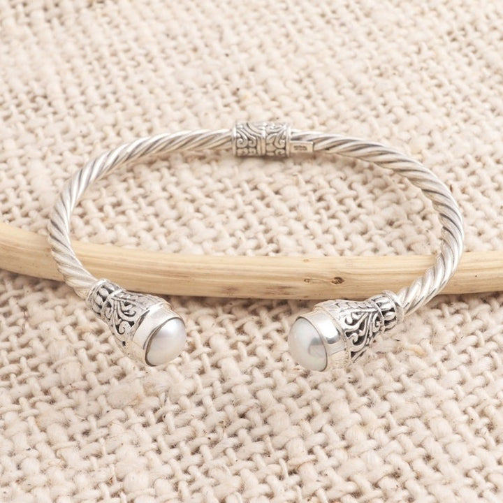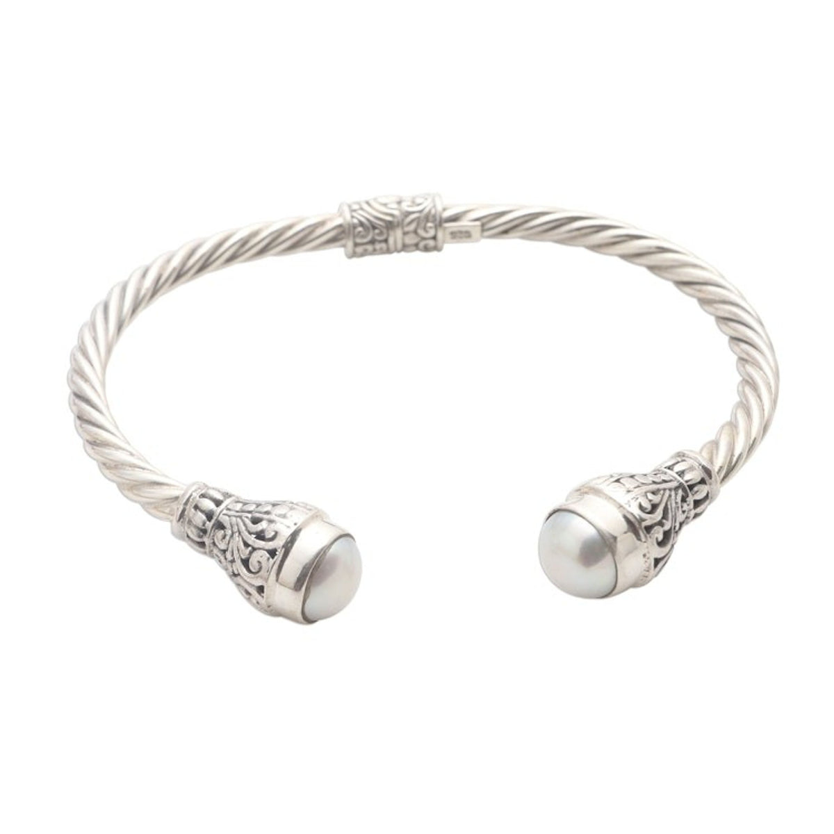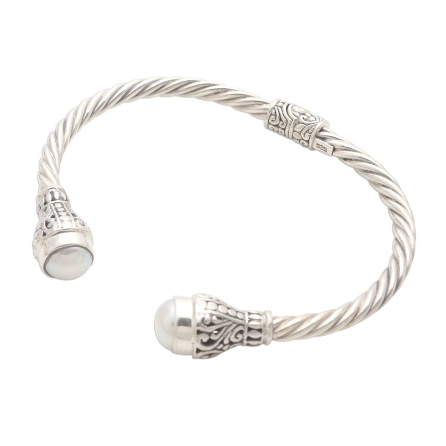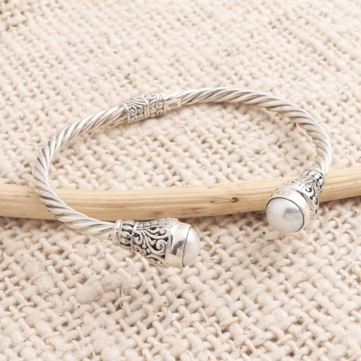This Cultured Pearl and Sterling Silver Cuff Bracelet 'Royal Torch' by Giri Tasmana is a cuff bracelet that is the epitome of elegance, terminating in ornate, torch-like ends. The Balinese artisan sets the sterling silver cuff with cultured white pearls at both ends. The artisan's work emphasizes animal and floral motifs, a reflection of his commitment to preserving nature’s beauty through design.
