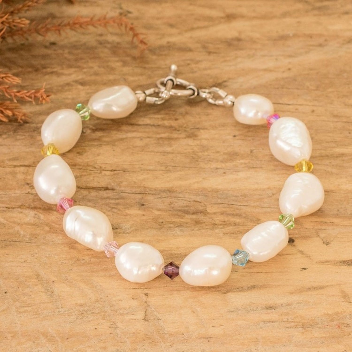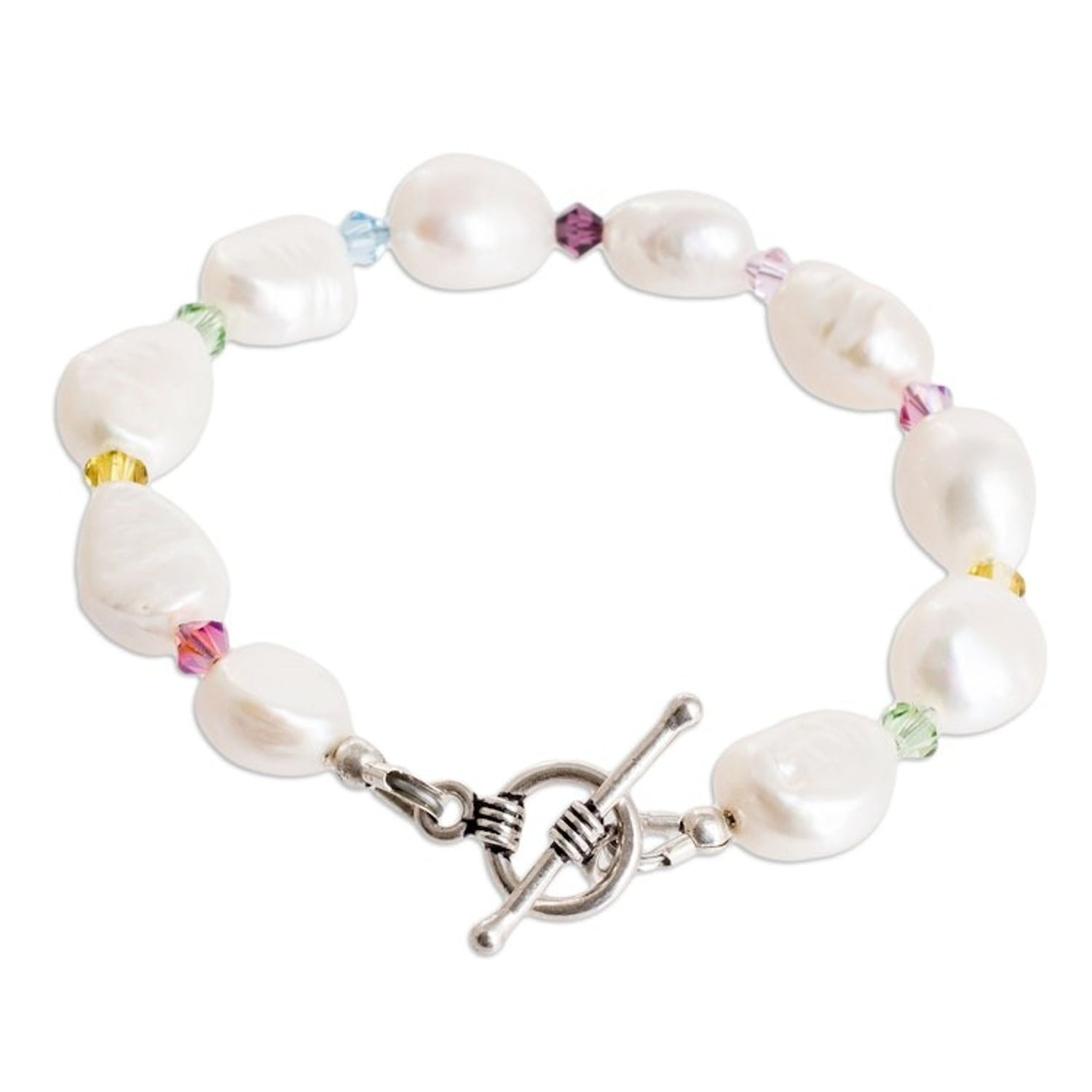 This Cultured Pearl Crystal Beaded Bracelet with Silver Clasp 'Colors on White' by Miriam Bruten is a wristband bracelet meticulously made with natural white cultured baroque pearls, each boasting a uniquely captivating form. Dainty crystal beads in vibrant hues are interspersed amongst the pearls. It secures with a gleaming sterling silver toggle clasp. The artisan ensures that each piece is crafted to last a lifetime.