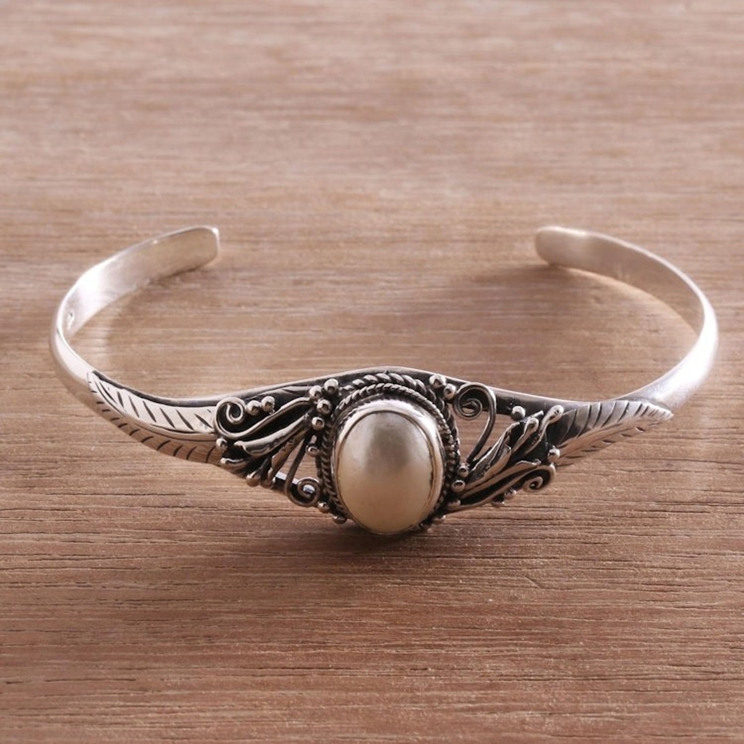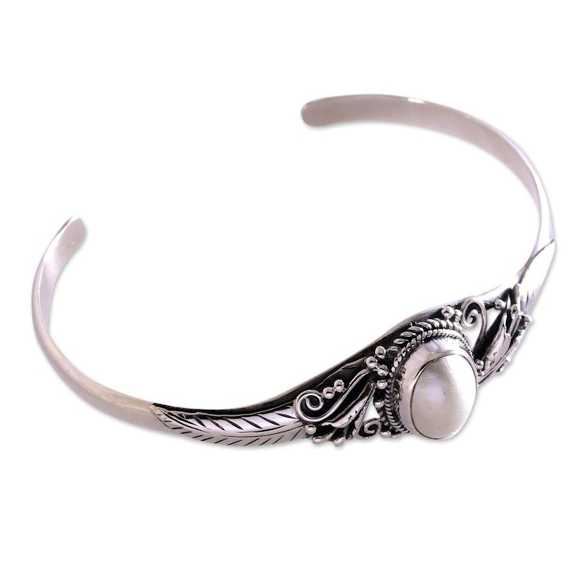 This Cultured Pearl Pendant Cuff Bracelet from Bali 'Moonlight Shade' by Giri Tasmana is an elegant cuff bracelet with a combination finish. It circles the wrist with a simple cuff, featuring designs that add a pool of shade around an oval cultured pearl. The artisan's work emphasizes animal and floral motifs, a reflection of his commitment to preserving nature’s beauty through design.