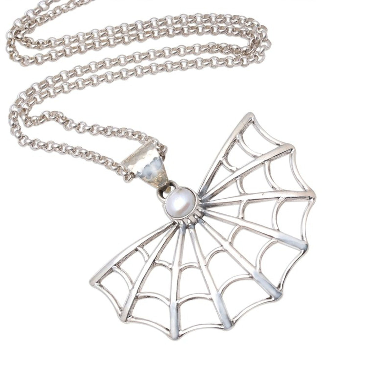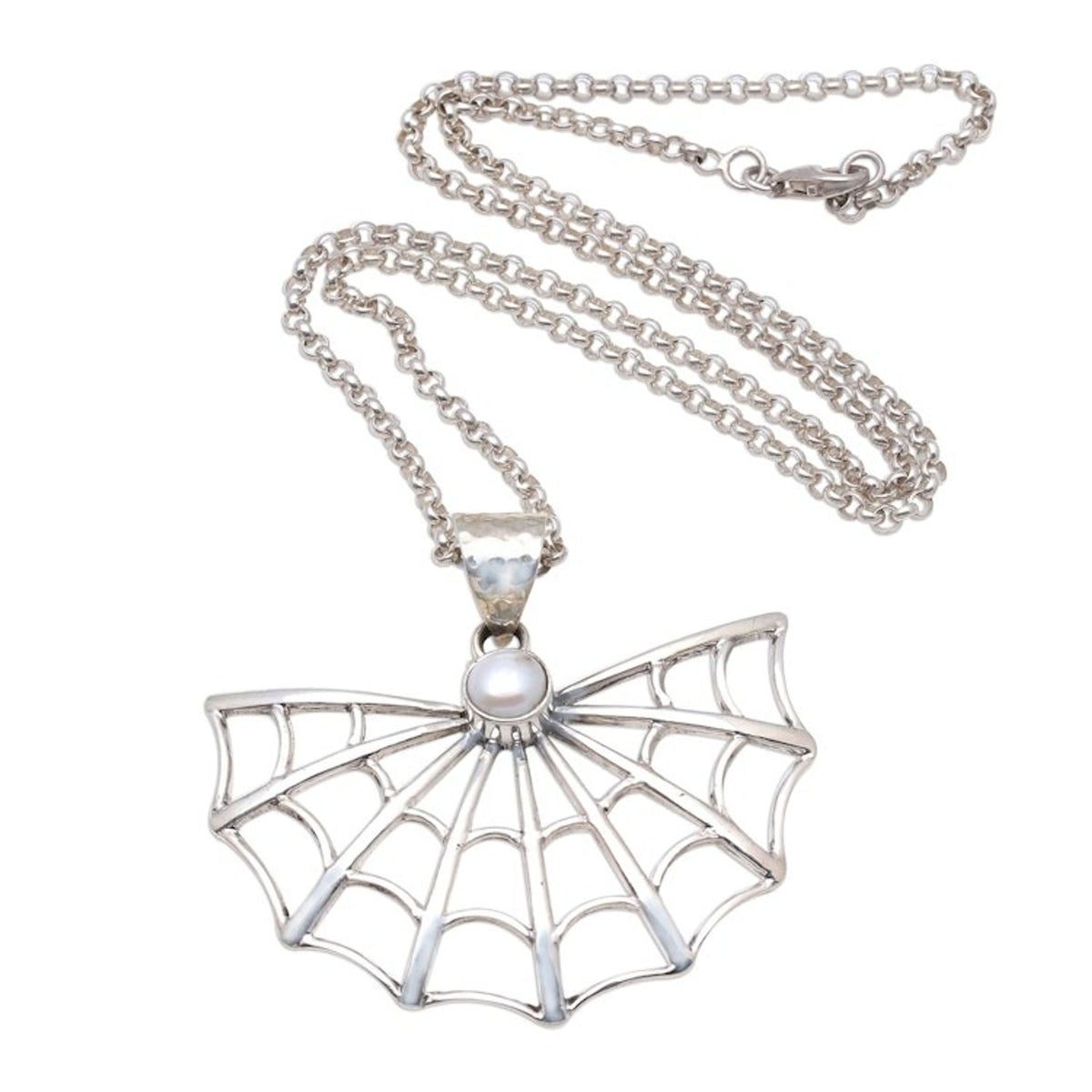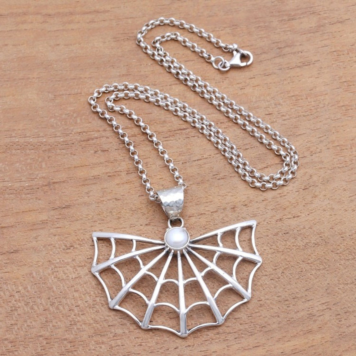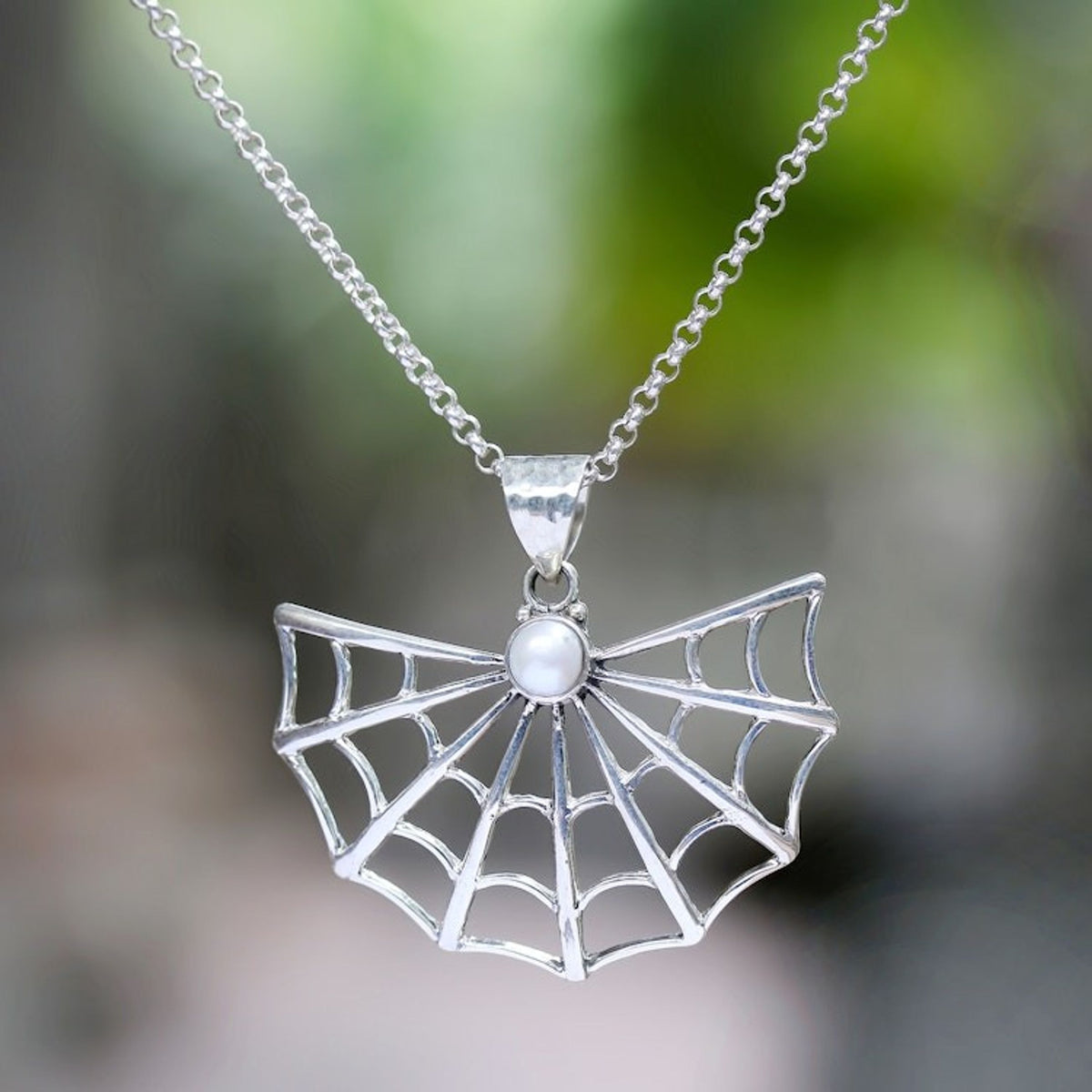 This Cultured Pearl Spider Web Pendant Necklace from Bali 'Glowing Web' by Rosalia Tarigan is a necklace with a petite glowing cultured pearl featured in the pendant, framed by a spider web crafted from sterling silver. The design is perfect for Halloween. The workshop sustains families in East Java, with each design celebrating resilience, collaboration, and the enduring soul of silver jewelry.