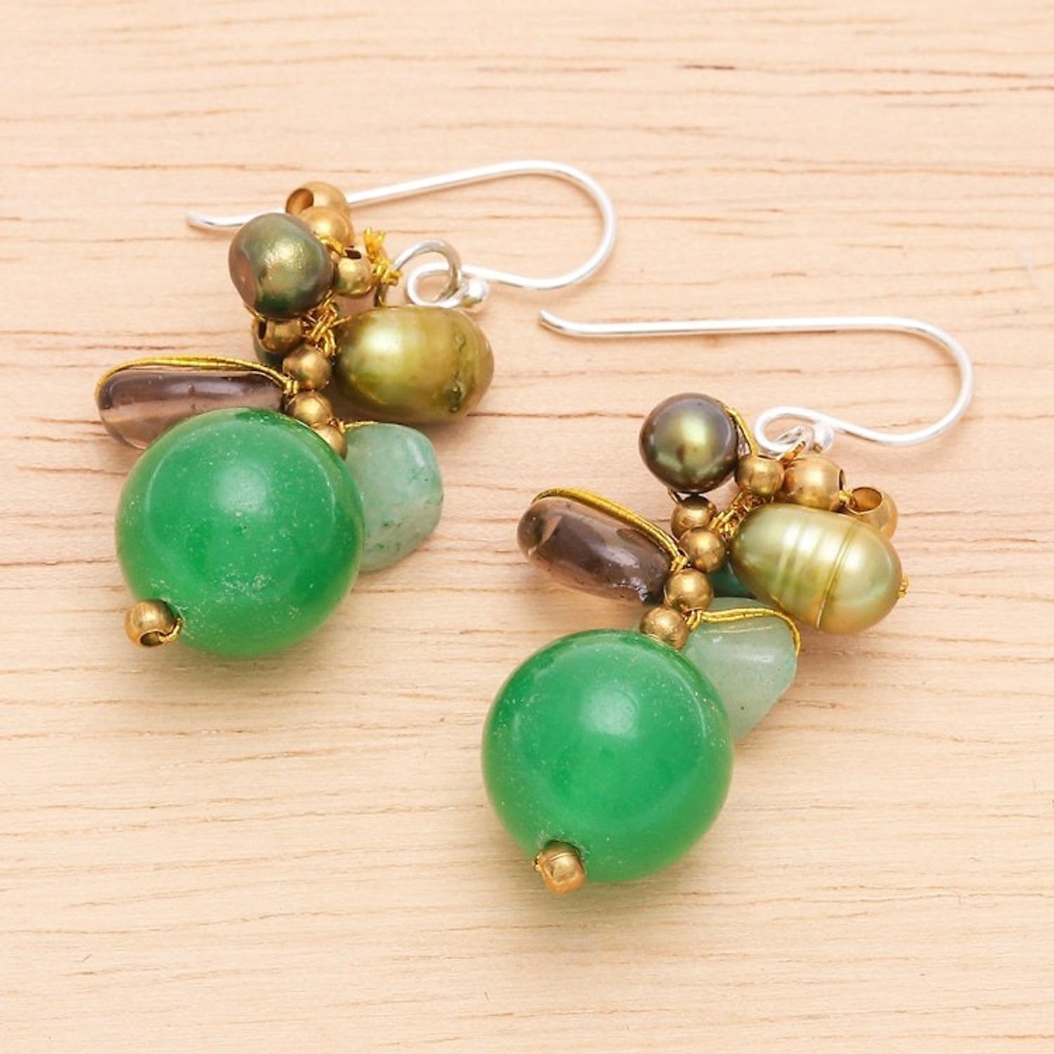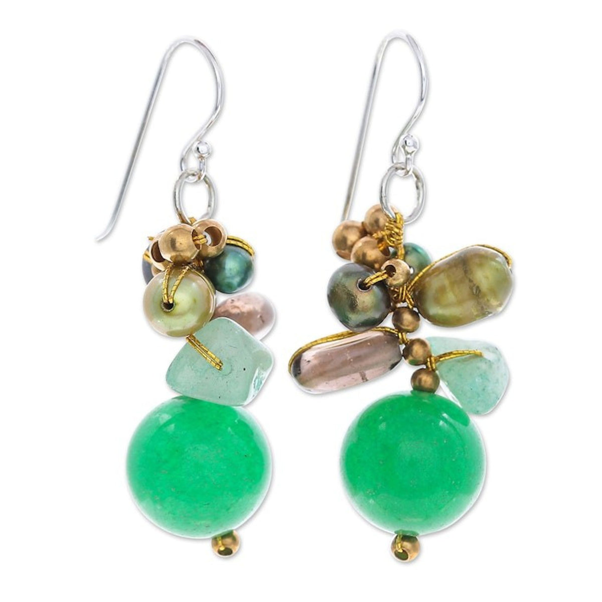 These Dangle Earrings with Quartz Cultured Pearl and Smoky Quartz 'Spring Splendor' by Nareerat are an utterly impressive pair of dangle earrings that exude irresistible allure thanks to an array of enchanting green quartz, smoky quartz, cultured pearls, and brass beads that are meticulously hand-knotted with golden metallic cords. The lovely earrings are finished with polished sterling silver hooks. Her mission is to keep the art of handmade jewelry alive for future generations.