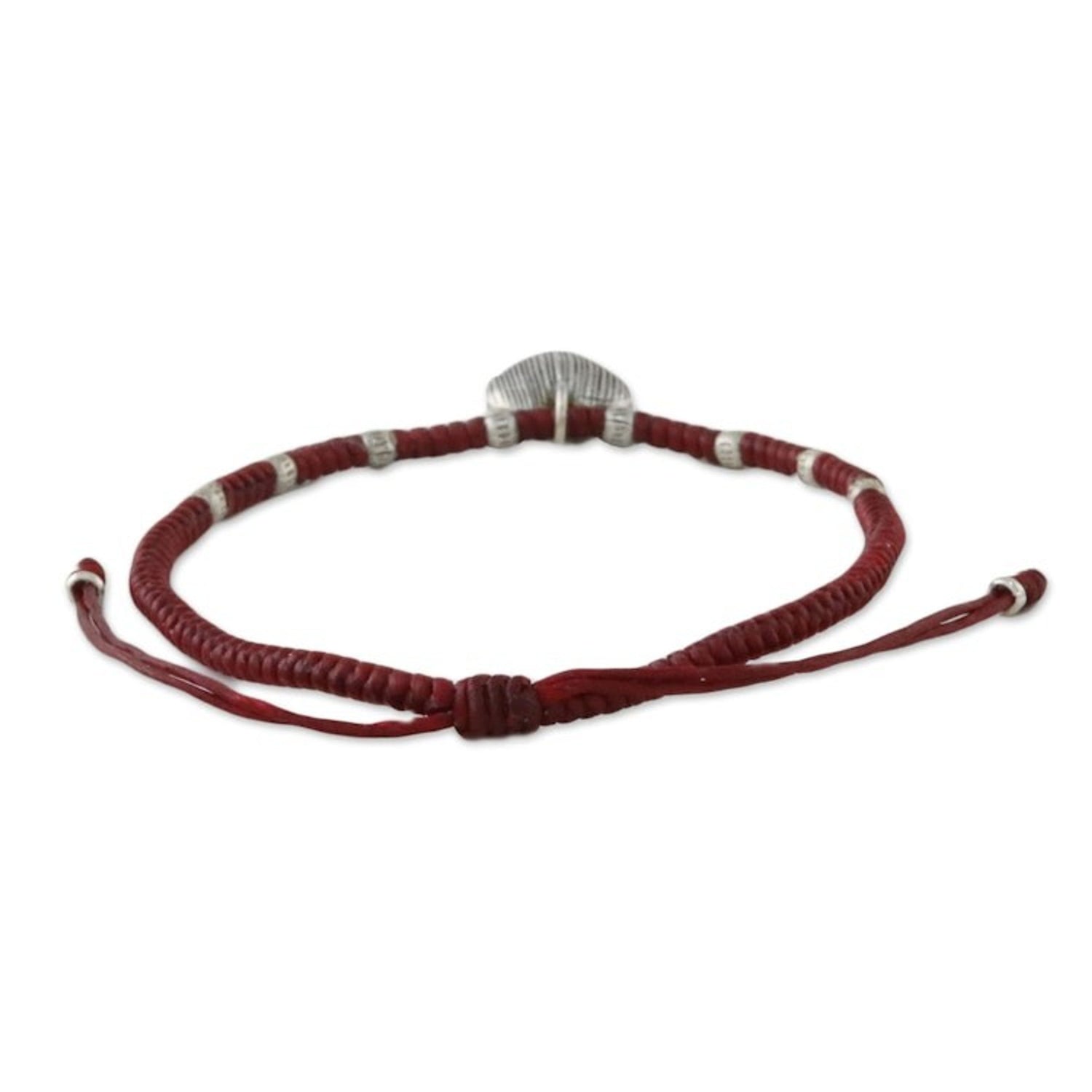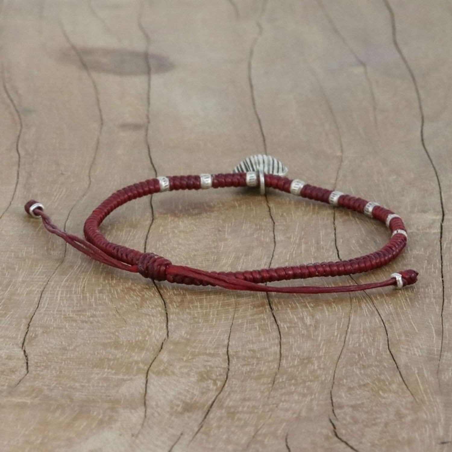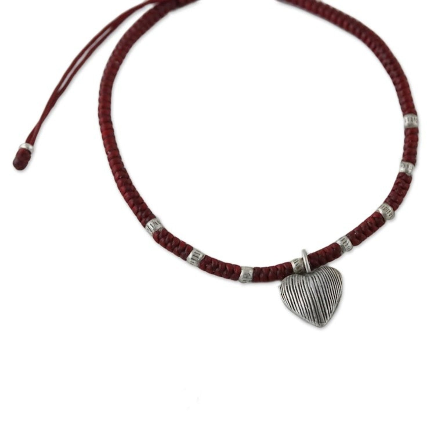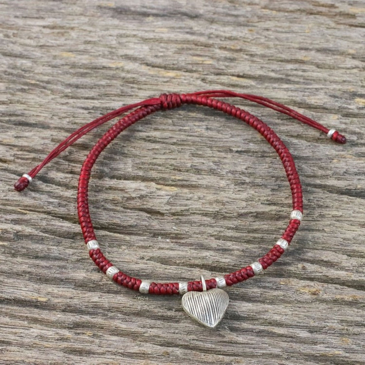 This Dark Red Braided Cord Bracelet with Hill Tribe Silver 'Ancient Heart in Red' by Napapat is a stylish bracelet where the artisan braids dark red waxed cords and punctuates them with Karen hill tribe silver beads. An oxidized 950 silver heart charm delivers the artisan's message. The bracelet's sliding knot allows it to be adjusted for a comfortable fit.