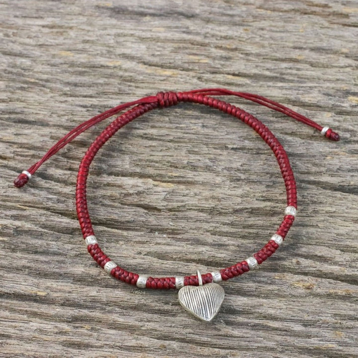 Dark Red Braided Cord Bracelet with Hill Tribe Silver 'Ancient Heart in Red'