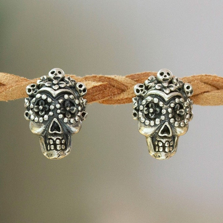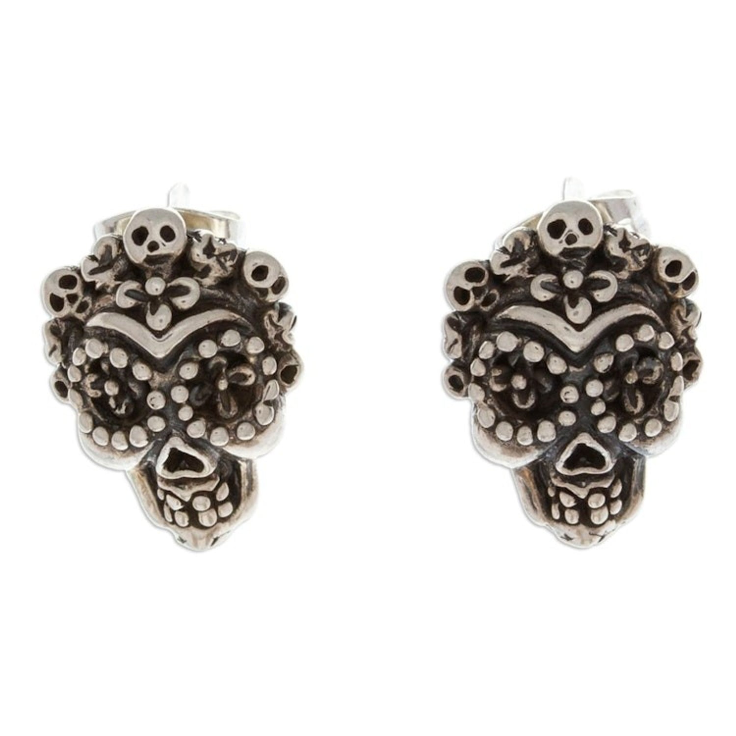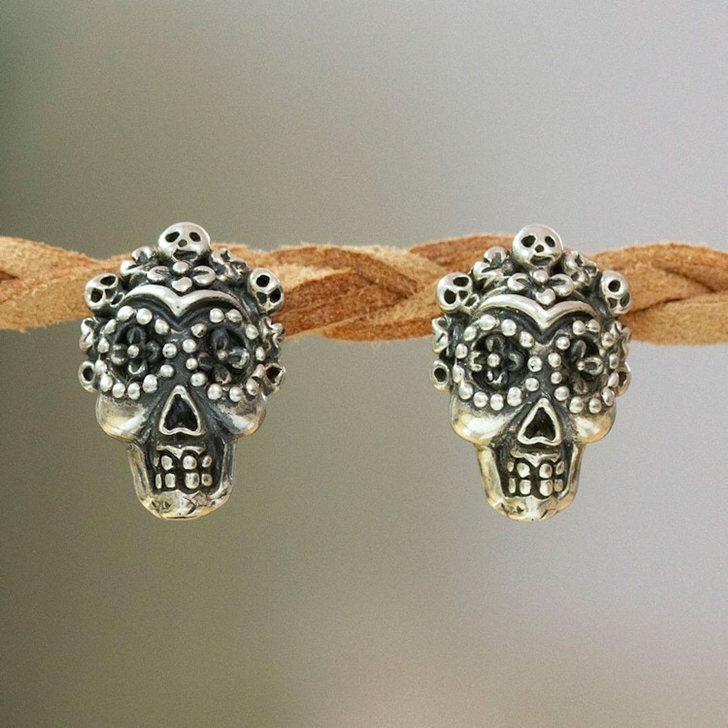 These Day of the Dead Folk Art Godmother Button Earrings 'Godmother Skull' by Ángel Ortiz are button earrings that celebrate the festive side of the underworld. They infuse the ambiance with the loving spirit of the traditional Godmother Death—a gentle lady dressed in flowers. The artisan crafts them in an oxidized finish to enrich their classic look. For him, jewelry is both a cultural legacy and a call to action.