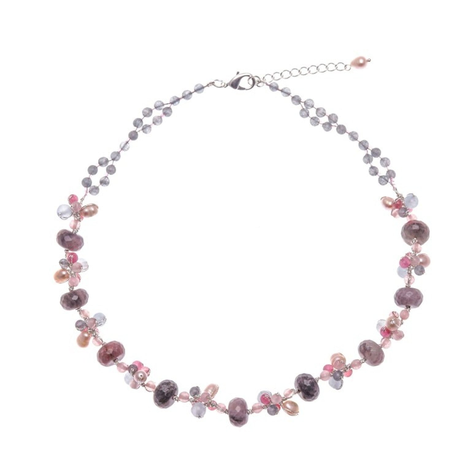 Handcrafted from rhodonite, freshwater cultured pearl, quartz, and glass beads with a 925 sterling silver-plated brass clasp, this necklace weighs 1.38 oz. The necklace measures 18 inches L x 0.6 inches W, with a 1.6-inch extender. The color may vary slightly.