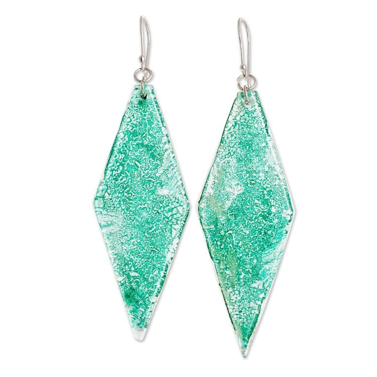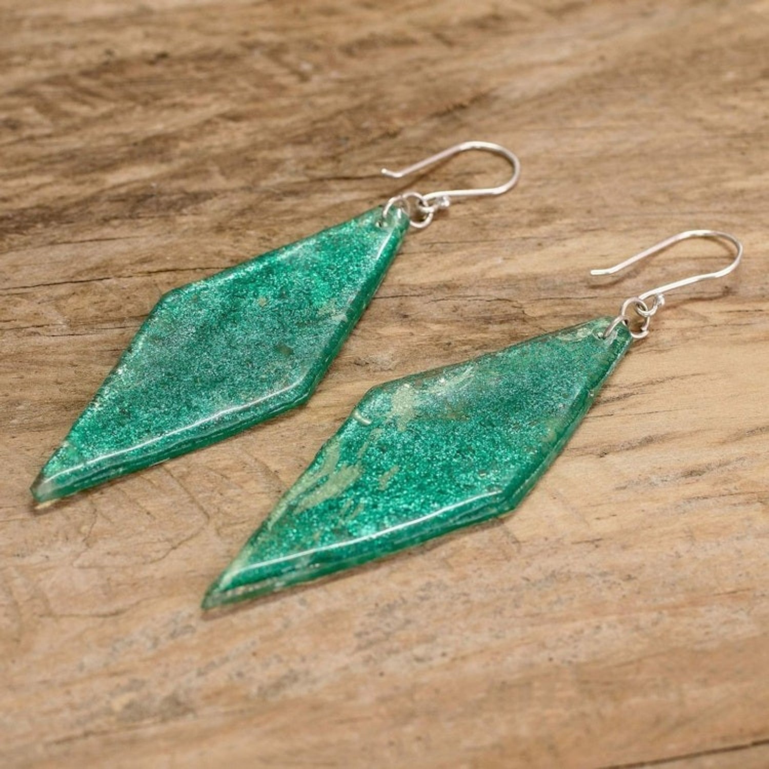 These Diamond-Shaped Green Recycled CD Dangle Earrings 'My Green Elegance' by Rosario Leiva are diamond-shaped dangle earrings whose intense green hue adds a natural vibe. The artisan works with recycled CDs to create them, helping the environment recover from pollution. Her jewelry invites wearers to see beauty in the unexpected and embrace the possibilities of reimagined materials.