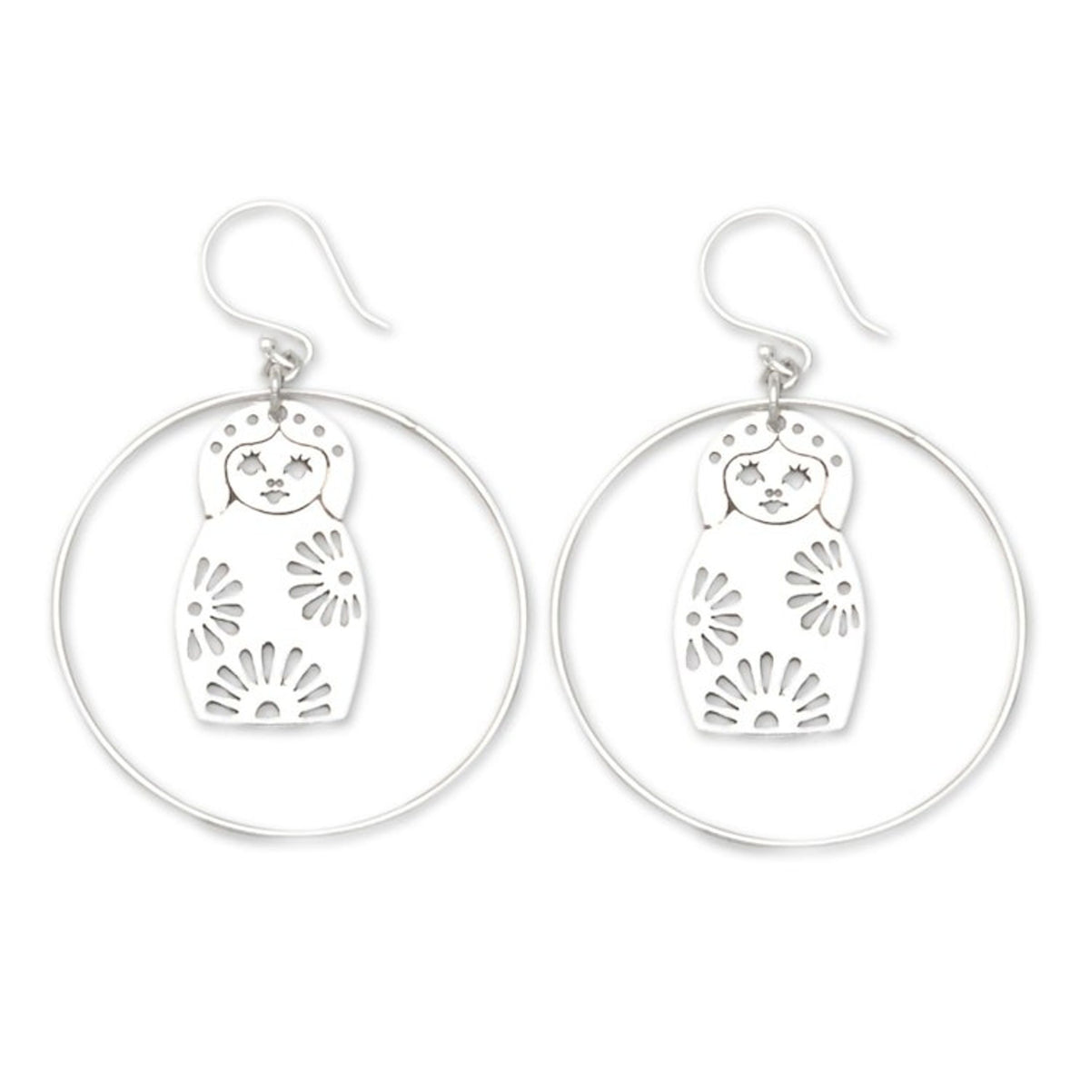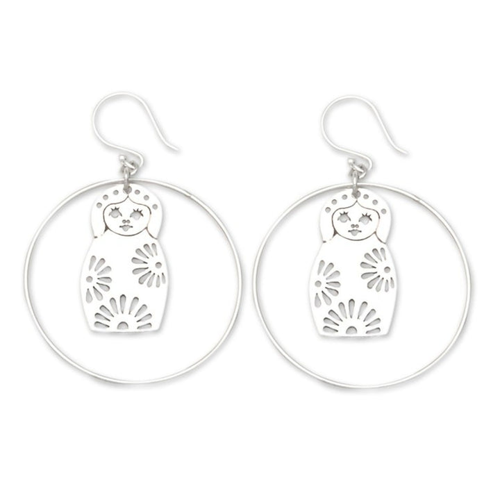 These Doll-Themed Whimsical Sterling Silver Dangle Earrings 'Snowy Dolly' by Griya Suarningsih are round dangle earrings whose polished finish enhances the sweet beauty of two little doll pendants dancing at the center of the earrings, each decorated with snowflake details. The artisan’s signature style incorporates wirework and jawan motifs.