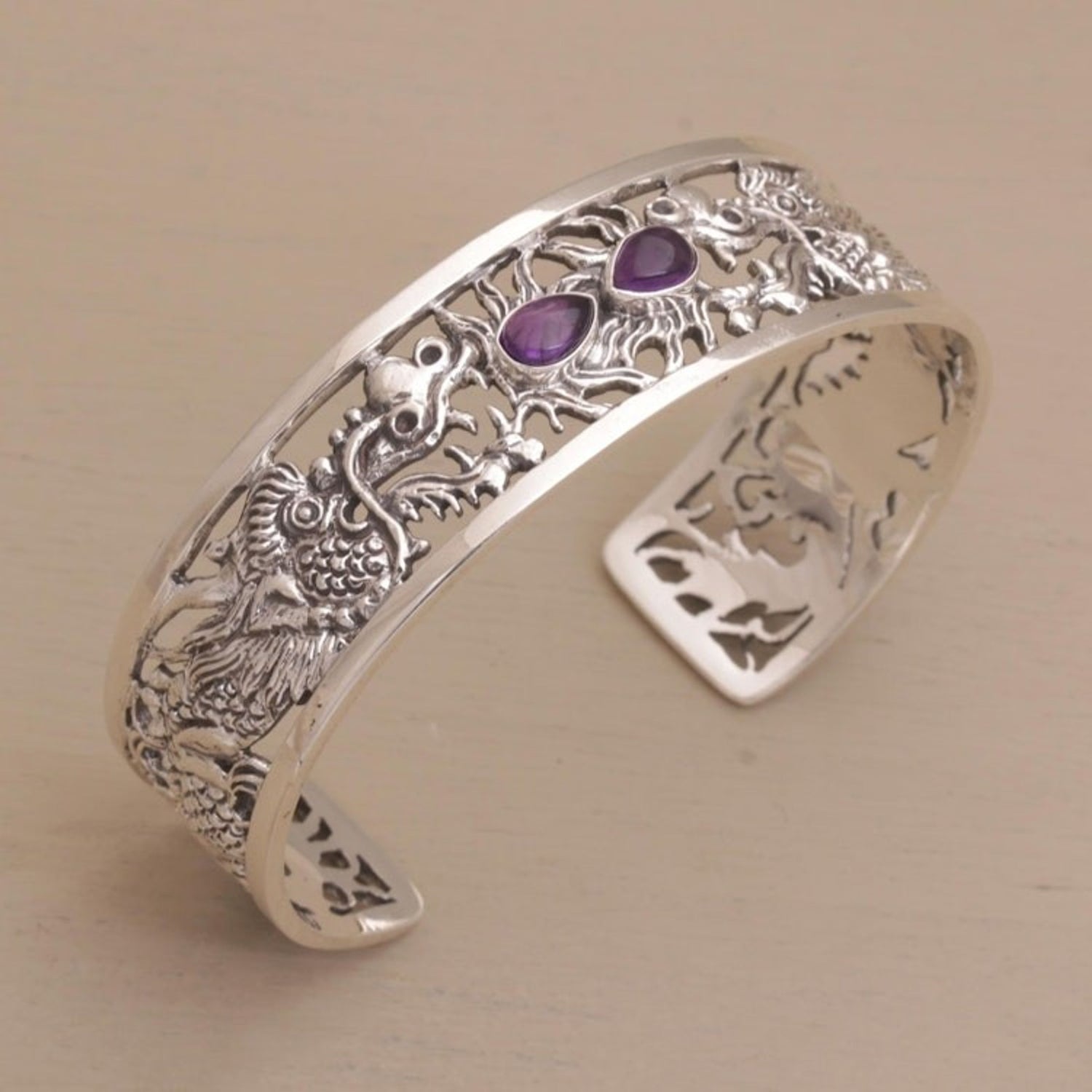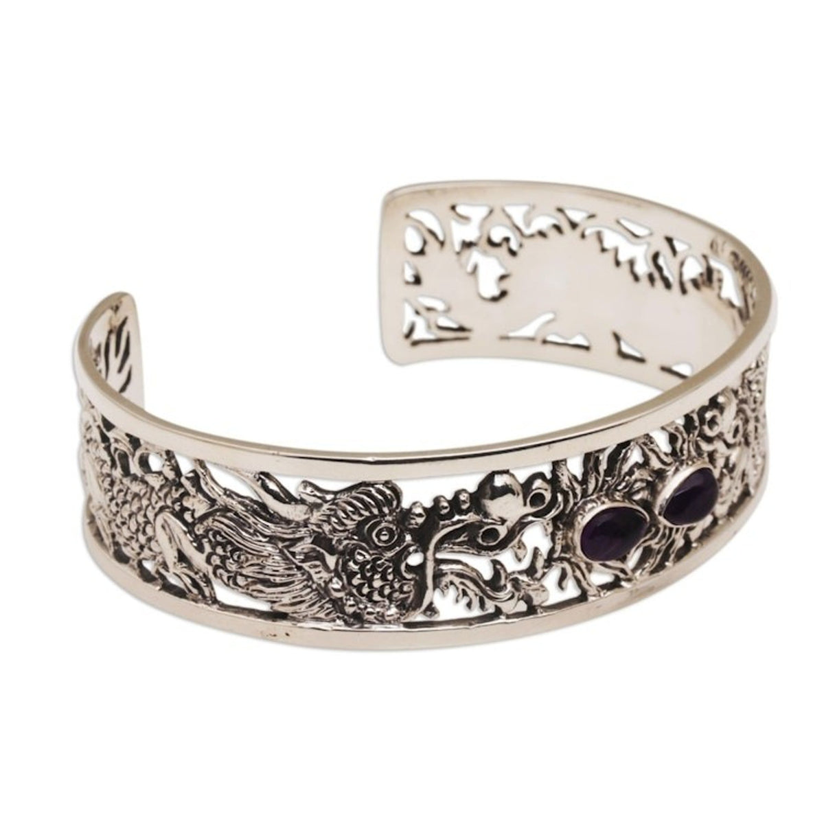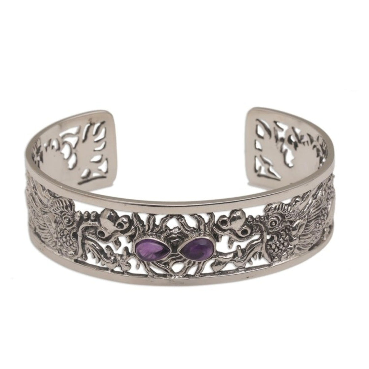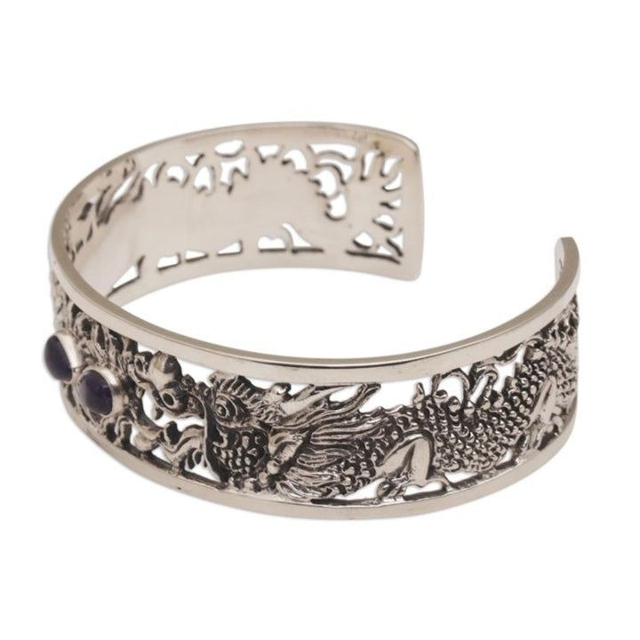 This Dragon Themed Sterling Silver and Amethyst Cuff Bracelet 'Dragon Duel' by Nyoman Rena is a handcrafted sterling silver cuff bracelet where two fierce dragons square off, their enormous jaws spewing fire. Centering the cuff are two pear-shaped stones of faceted amethyst, like a dragon's glowing eyes. The artisan's jewelry is handcrafted using traditional tools and is attuned to modern fashion trends.