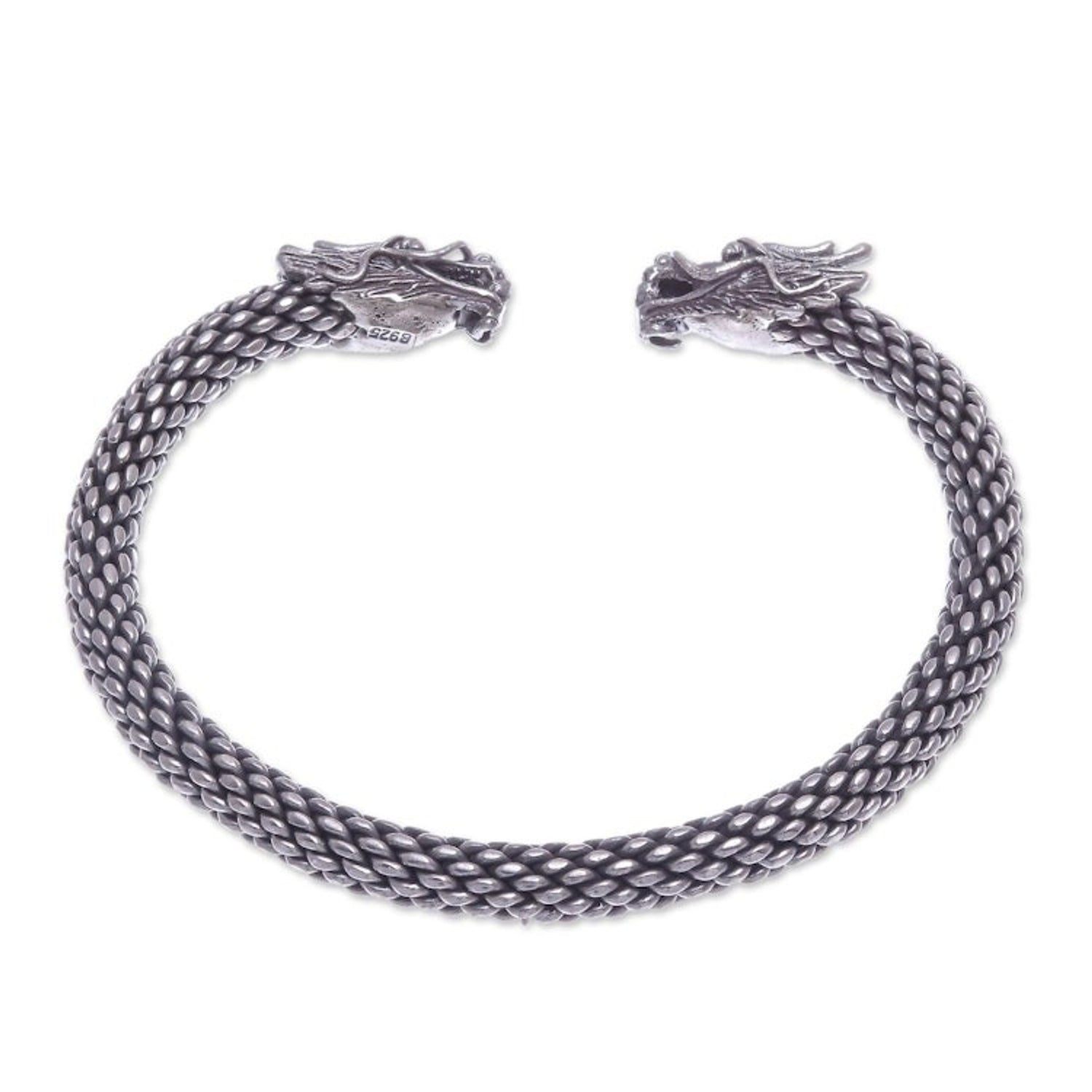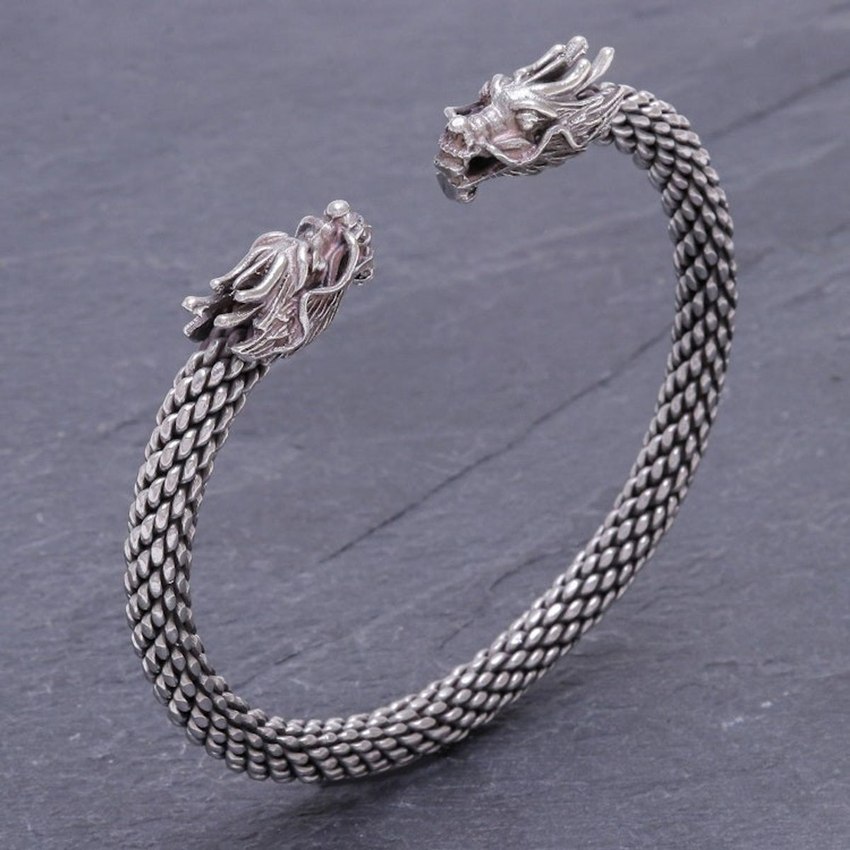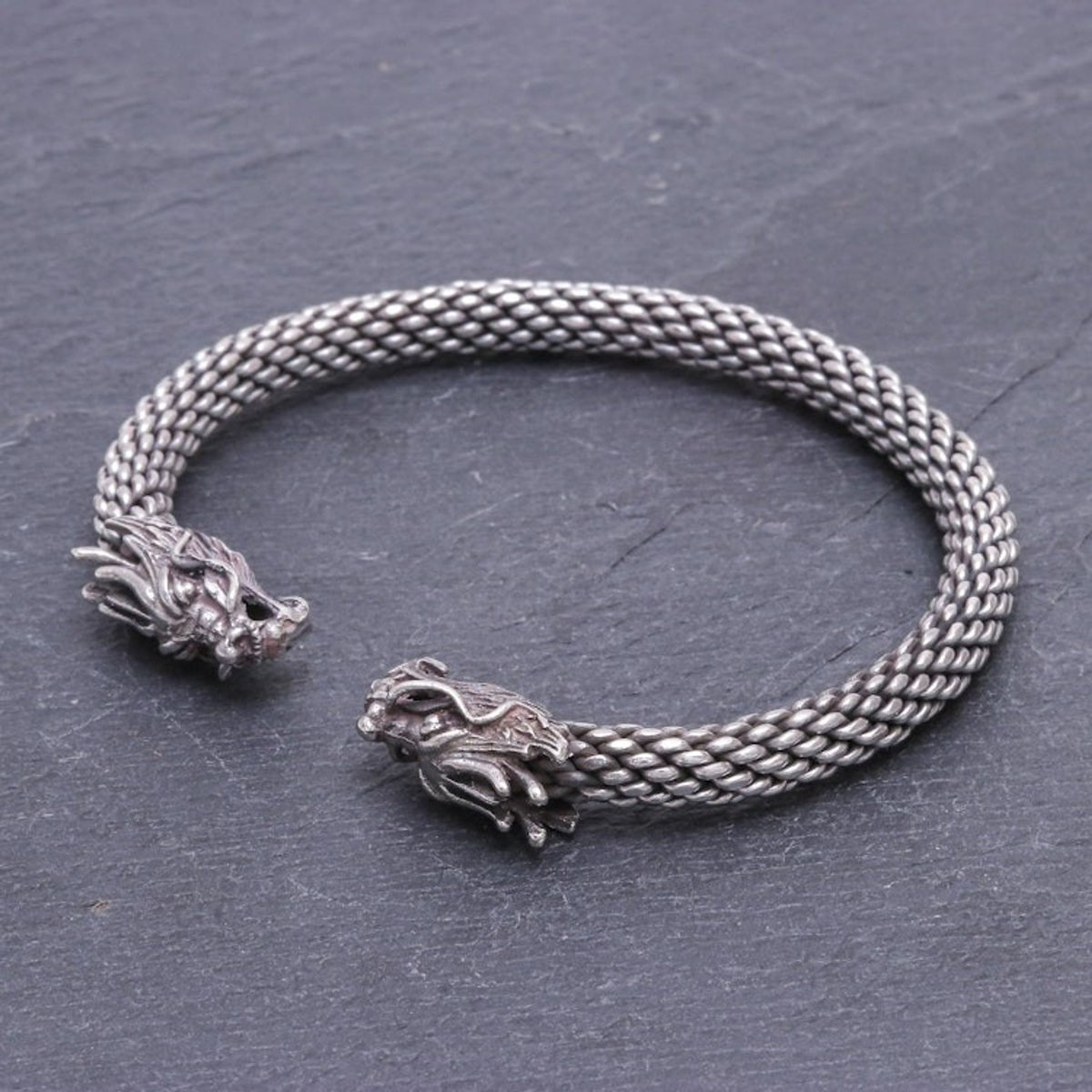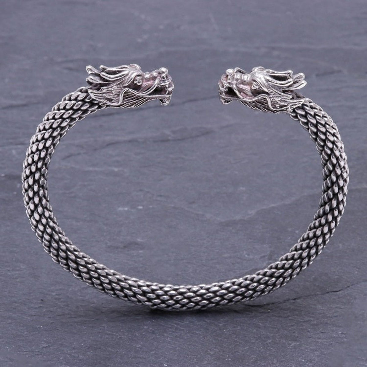 Dragon Themed Unisex Sterling Silver Cuff Bracelet 'Double Dragons'
