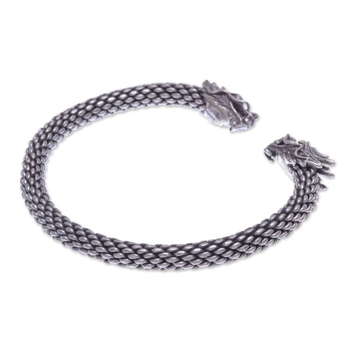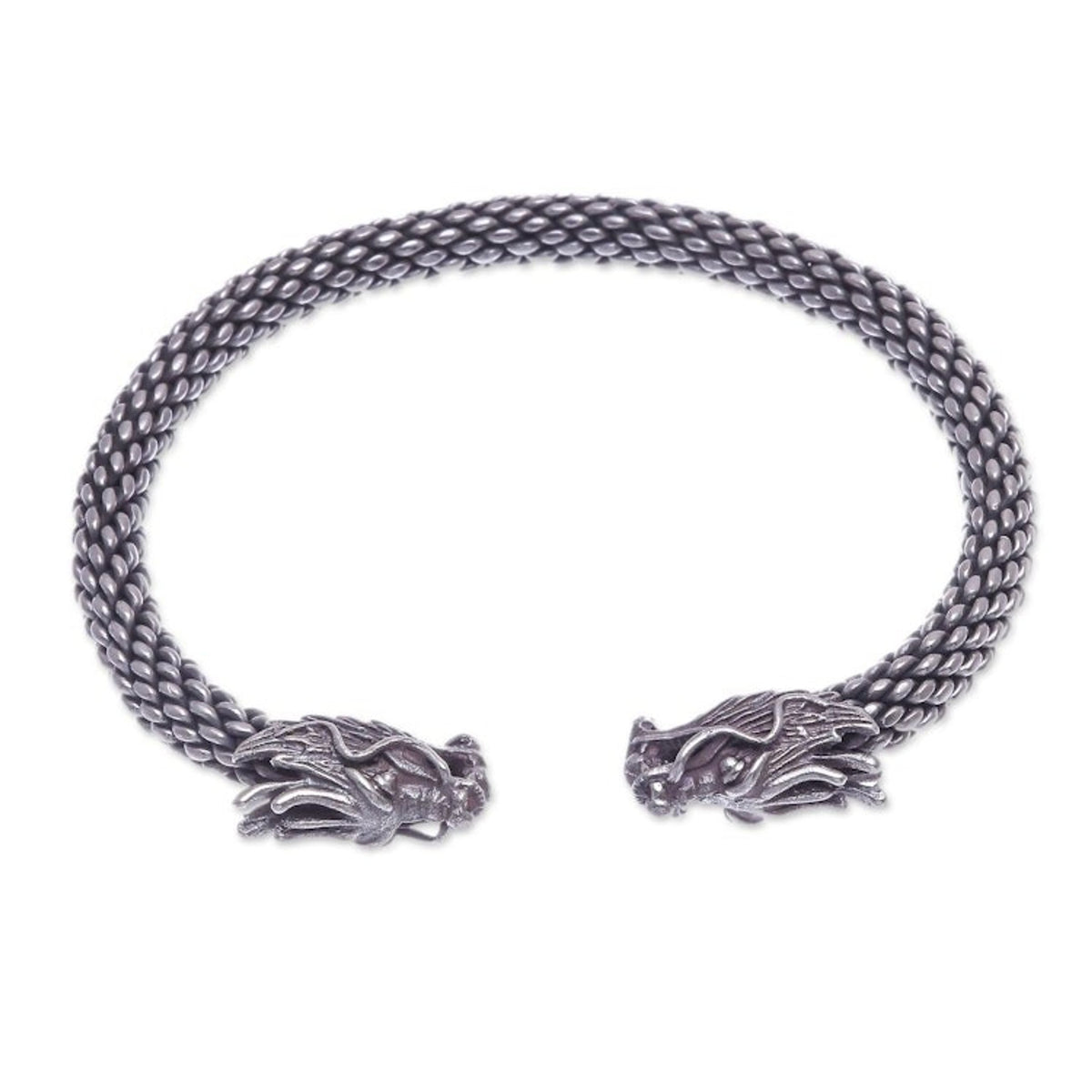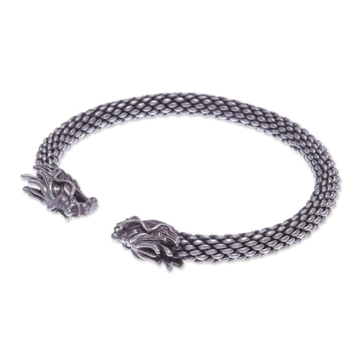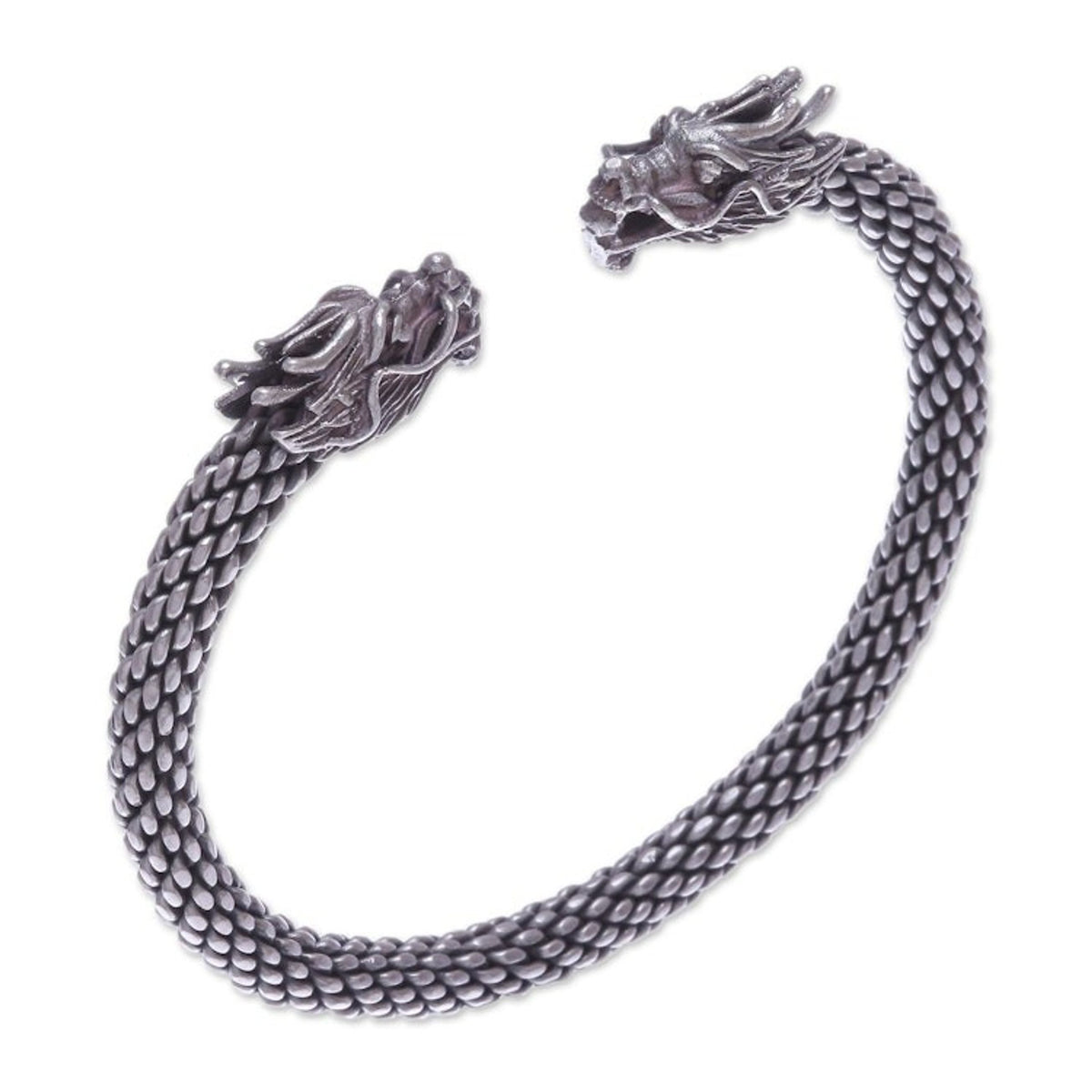Dragon Themed Unisex Sterling Silver Cuff Bracelet 'Double Dragons'