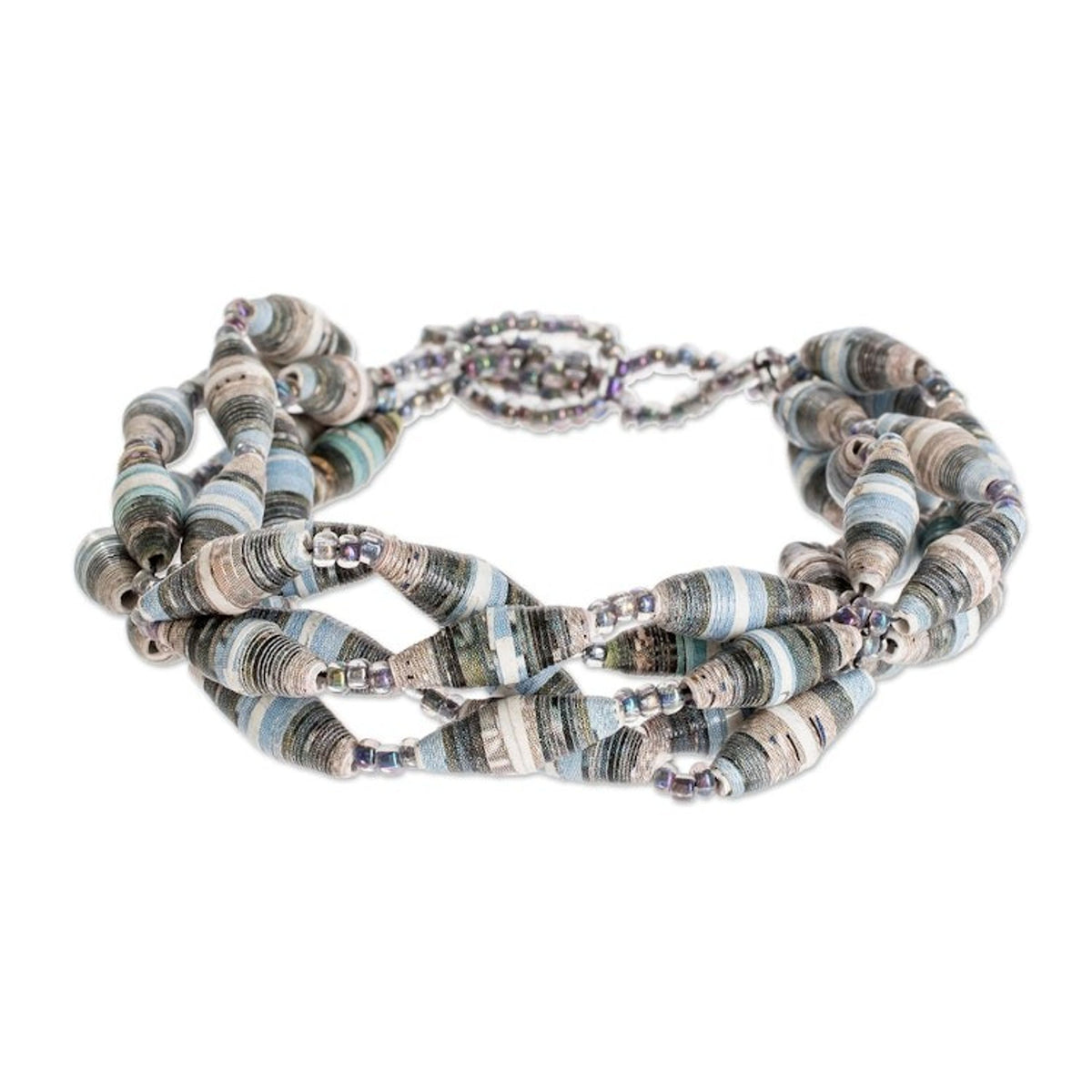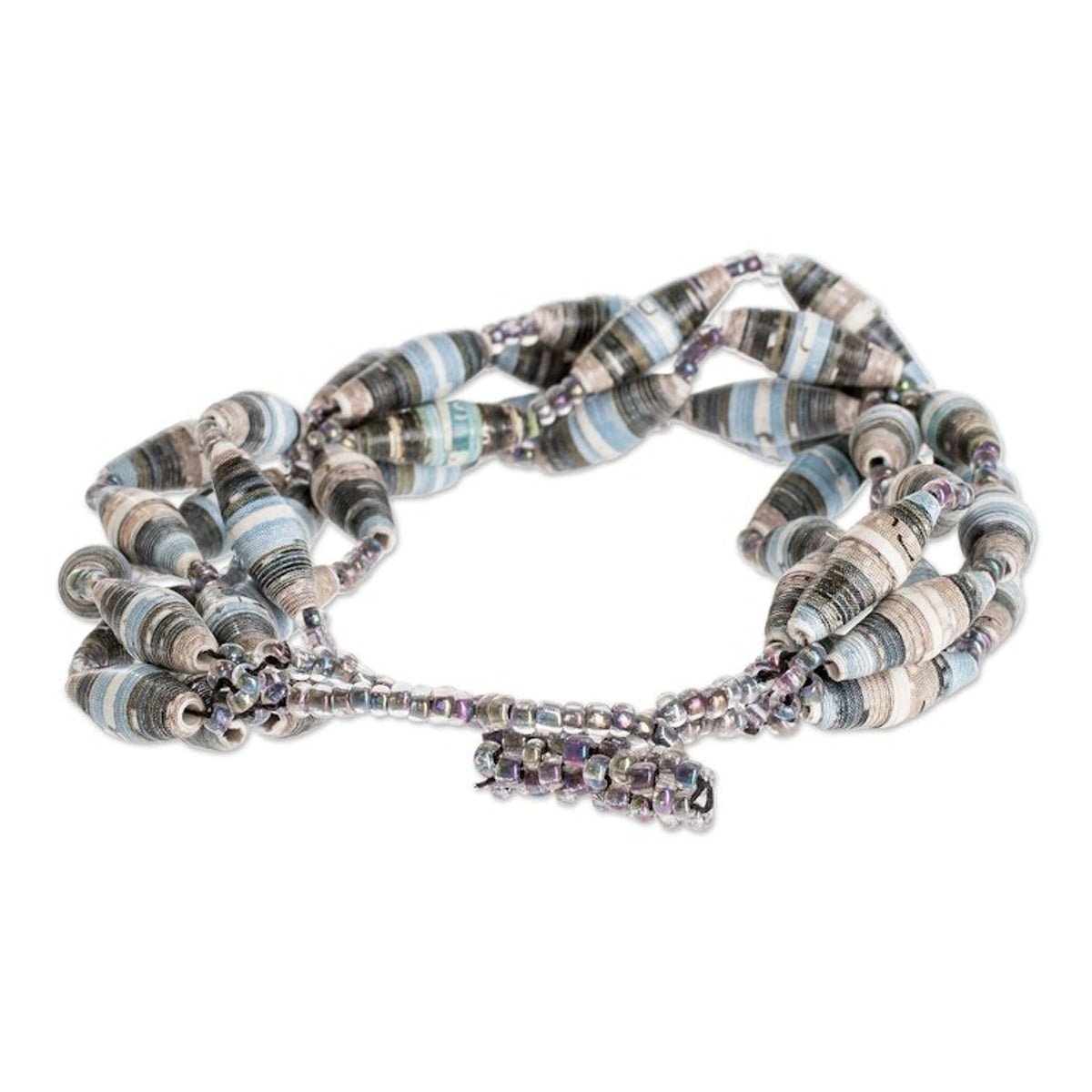 This bracelet is handcrafted from recycled paper, glass beads, and cotton thread with a toggle clasp. The piece measures 7.5 to 8 inches in adjustable length with a 1 inch width. The piece weighs 0.39 oz. Please note that as a hand-crafted item, the color, size, and/or motif may vary slightly. The recycled materials may also vary slightly in color and/or pattern. Made in Guatemala.