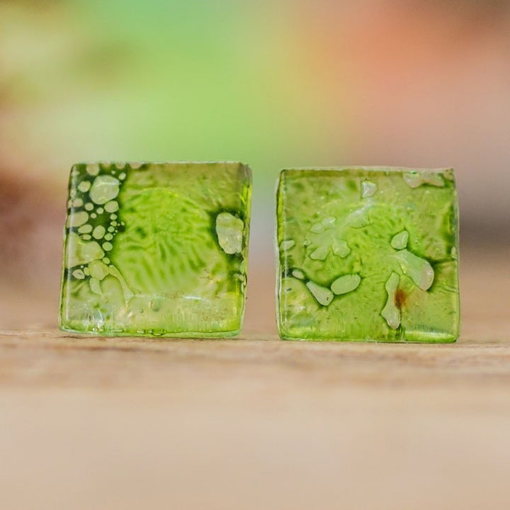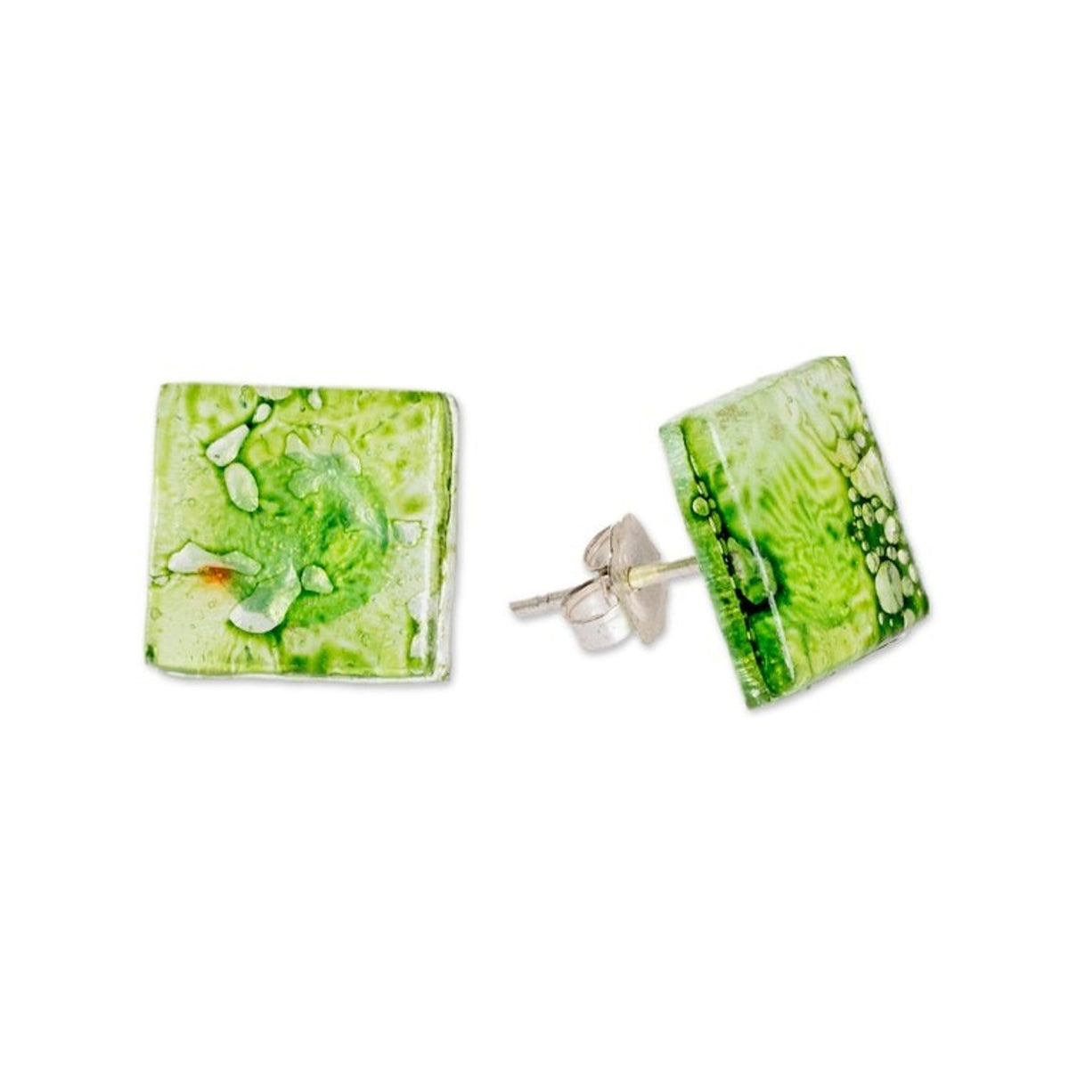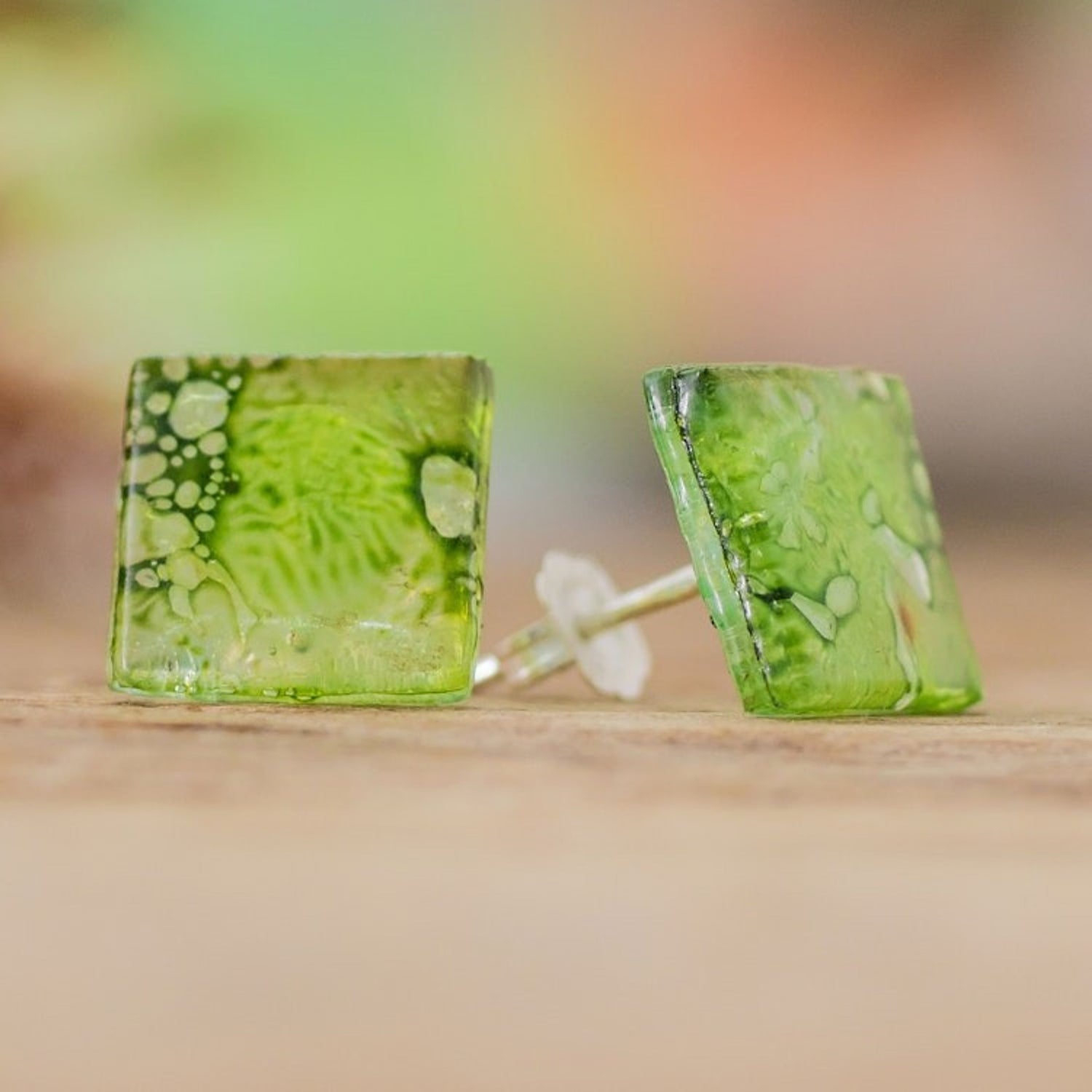 These 'Bubble Vision in Green' earrings by Independent Artisans are a unique and playful accessory with a powerful message. Designed by Guatemalan artisan Rosario Leiva, these button earrings are crafted from recycled CDs that have been transformed into perfect squares. The intense green hue symbolizes renewal and vitality, inviting you to support the environmental cause with every wear. The high-polish finish gives the surface a mesmerizing, bubbly appearance, while the sterling silver posts ensure a comfortable fit. Each pair is a celebration of the artisan’s creative spontaneity and her commitment to turning waste into whimsical, geometric art.