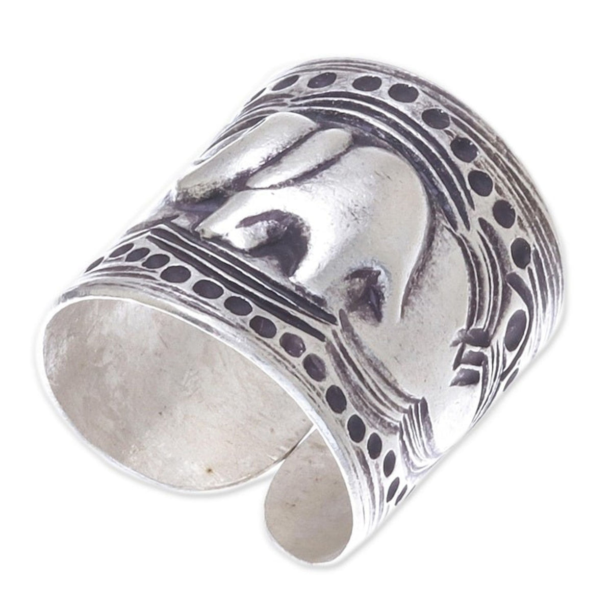 Handcrafted in 950 silver, this ring features a 15 mm W band and an oxidized finish. The piece weighs 0.28 oz. For rings of this width, it is recommended to order one size larger than usual for a comfortable fit. Made in Thailand.