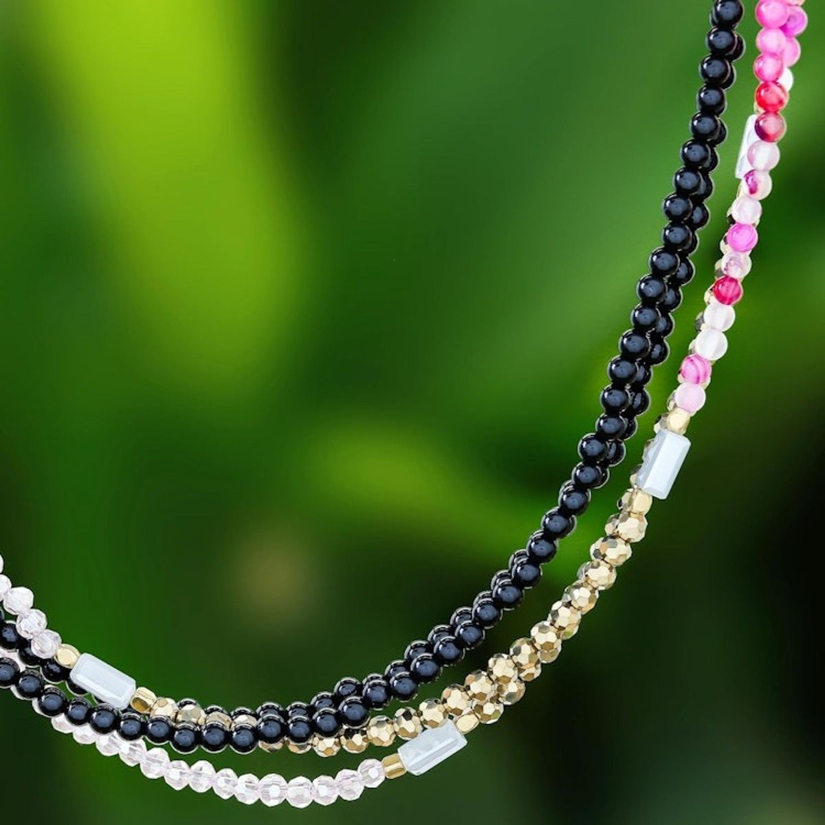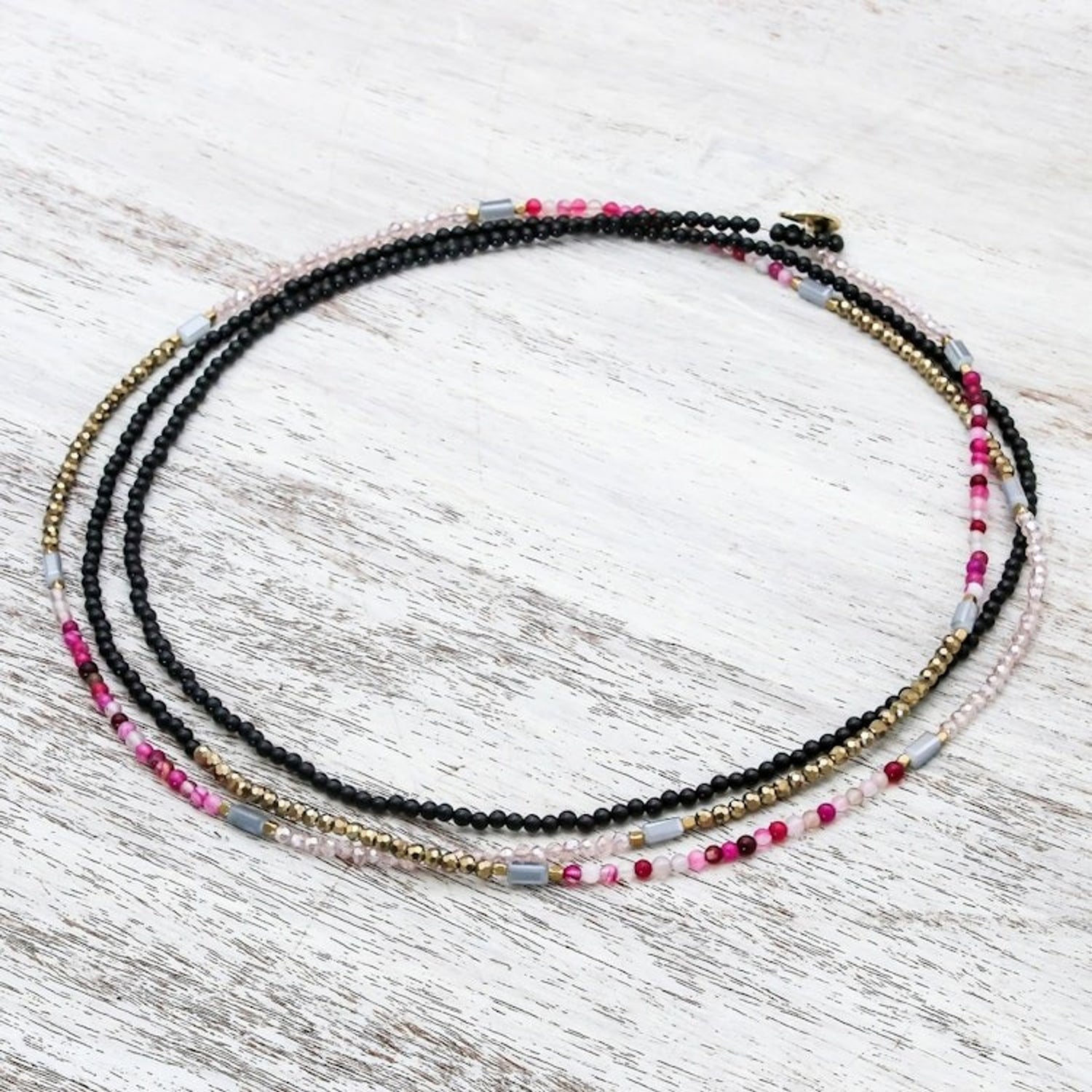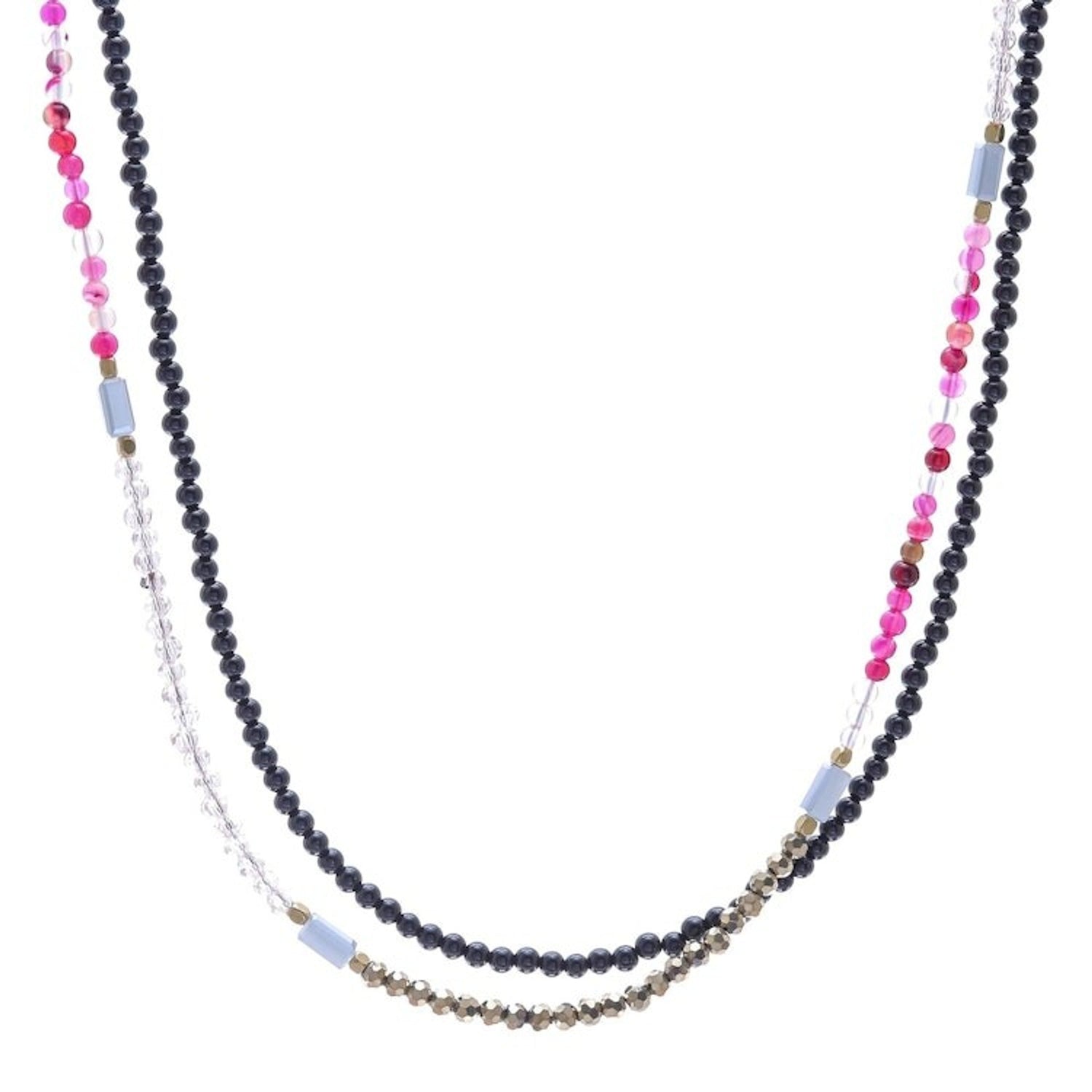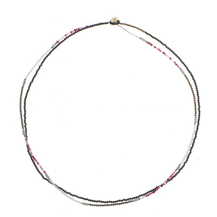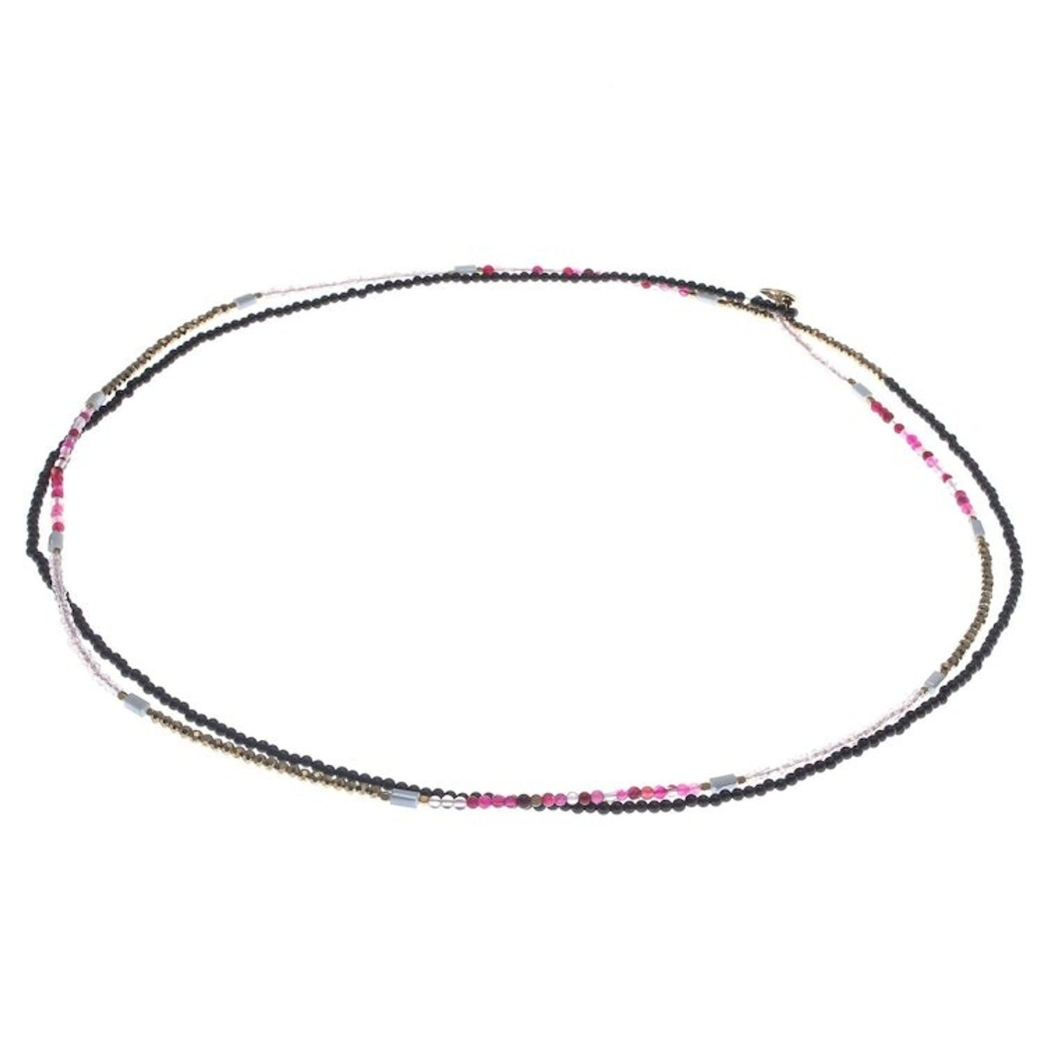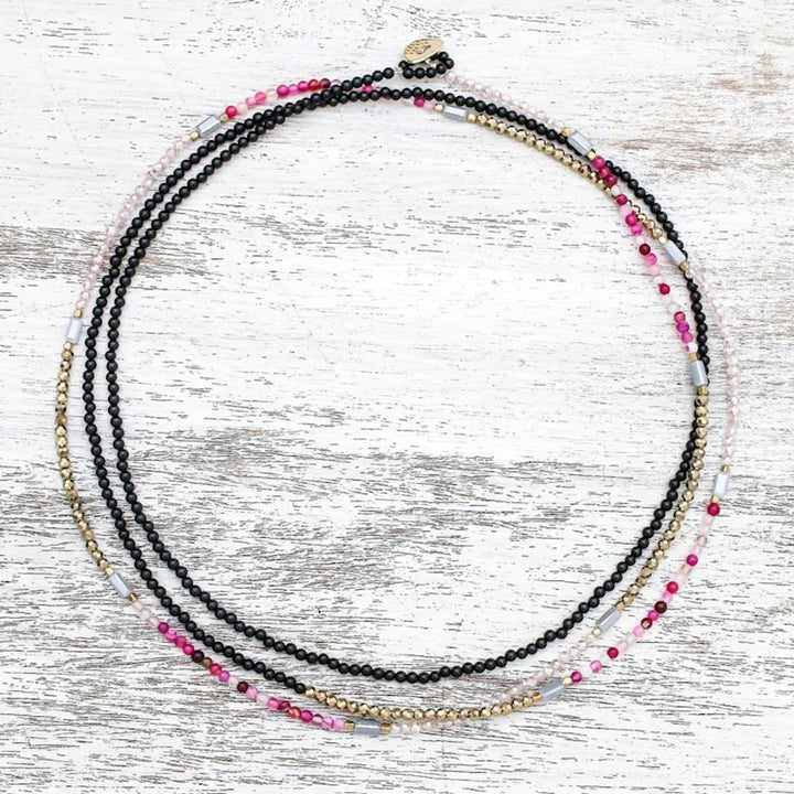 This 'Midnight Love in Pink' necklace by Independent Artisans is a captivating piece that captures the elegance and romance of the night. Designed by Thai artisan Nareerat, this extra-long beaded strand necklace combines the deep hue of black agate with the glimmering beauty of glass beads, pink agate, and gleaming brass. The various textures and tones are masterfully arranged to create a bohemian and enchanting design. The necklace is versatile, allowing it to be worn long for a dramatic statement or wrapped for a layered, choker-style look. This piece is a celebration of the artisan’s dedication to keeping the art of handmade jewelry alive in the digital age, a work of art that embodies skill, heritage, and community empowerment.