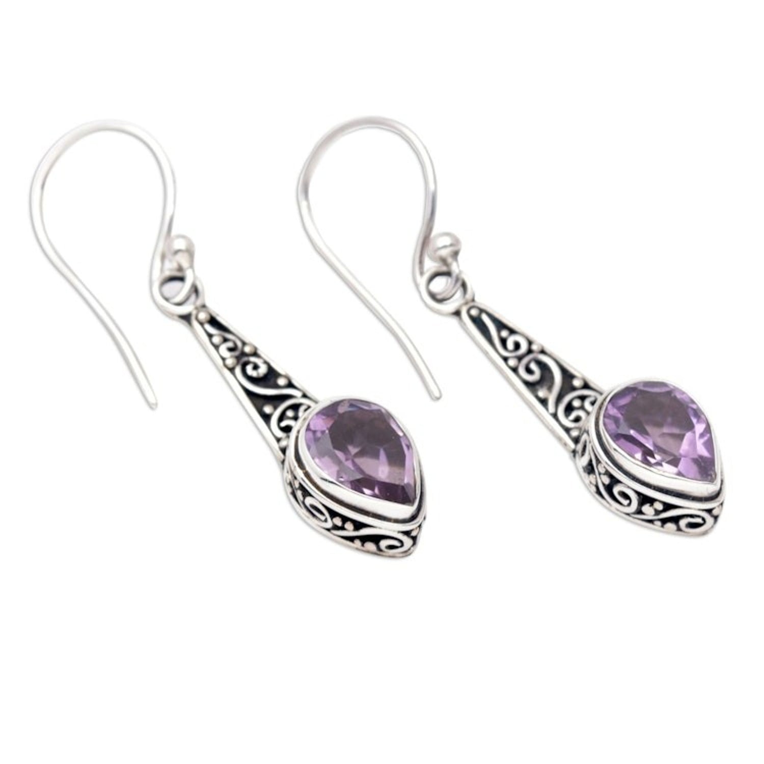 Handcrafted in 925 sterling silver with faceted amethyst totaling over 1 carat. Earrings measure 1.4 inches long x 0.3 inches wide x 0.2 inches deep. Weight 0.11 oz. Combination finish with hook fastening. Made in Indonesia.