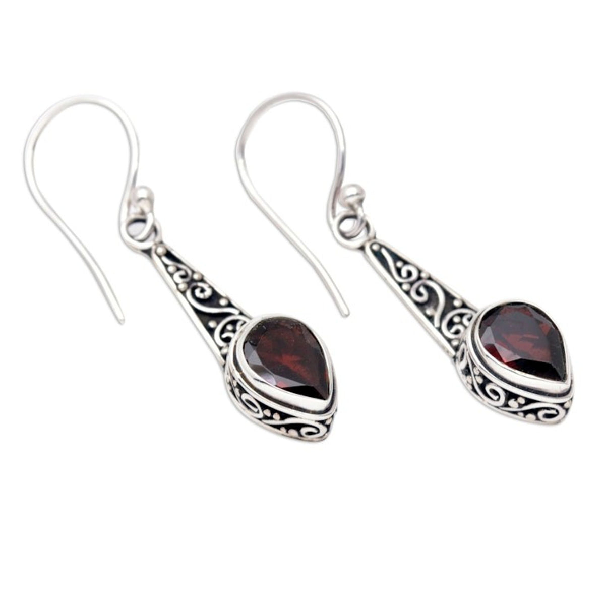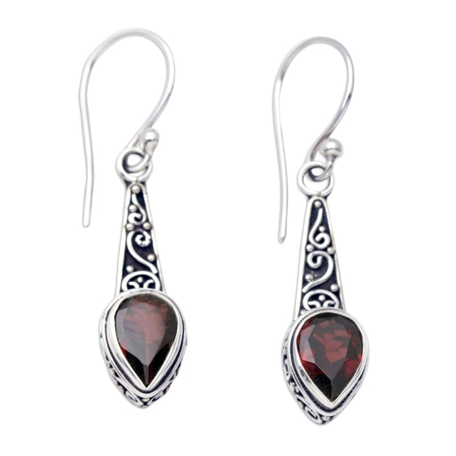 Handcrafted in Bali, these hook earrings feature a unique sterling silver structure with a combination finish and are embellished with faceted garnet stones. They measure 1.4 inches long by 0.3 inches wide by 0.2 inches deep and weigh 0.11 ounces.