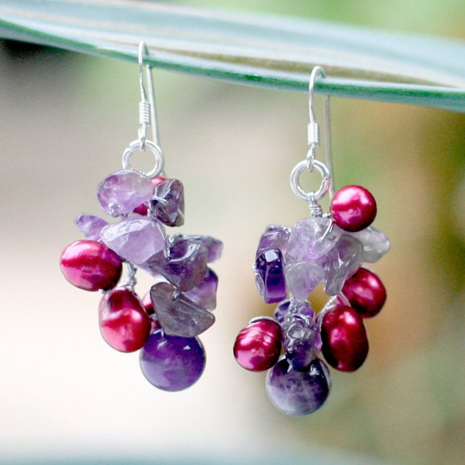 These hook earrings are crafted with sterling silver, amethyst, and dyed freshwater pearls, measuring 1.8 inches long by 0.8 inches wide.