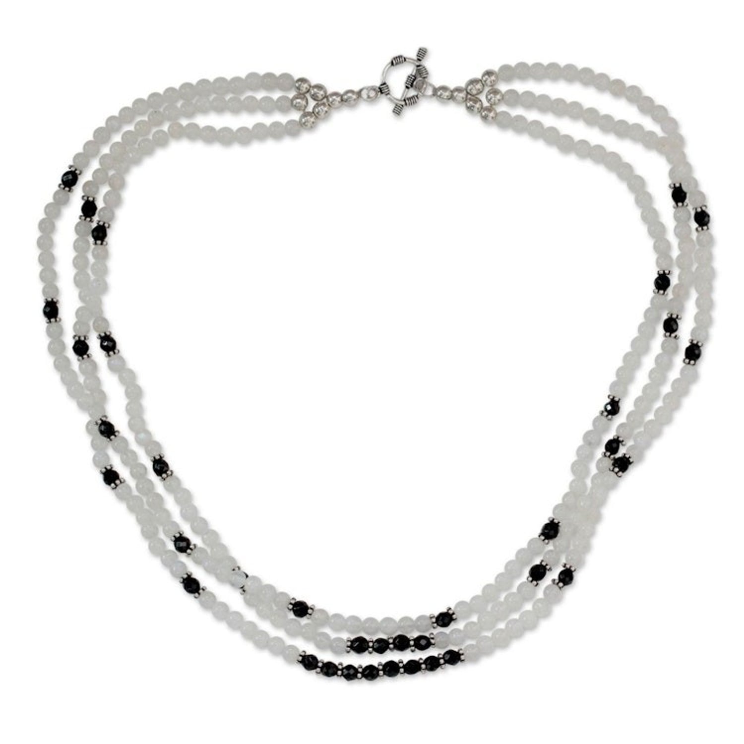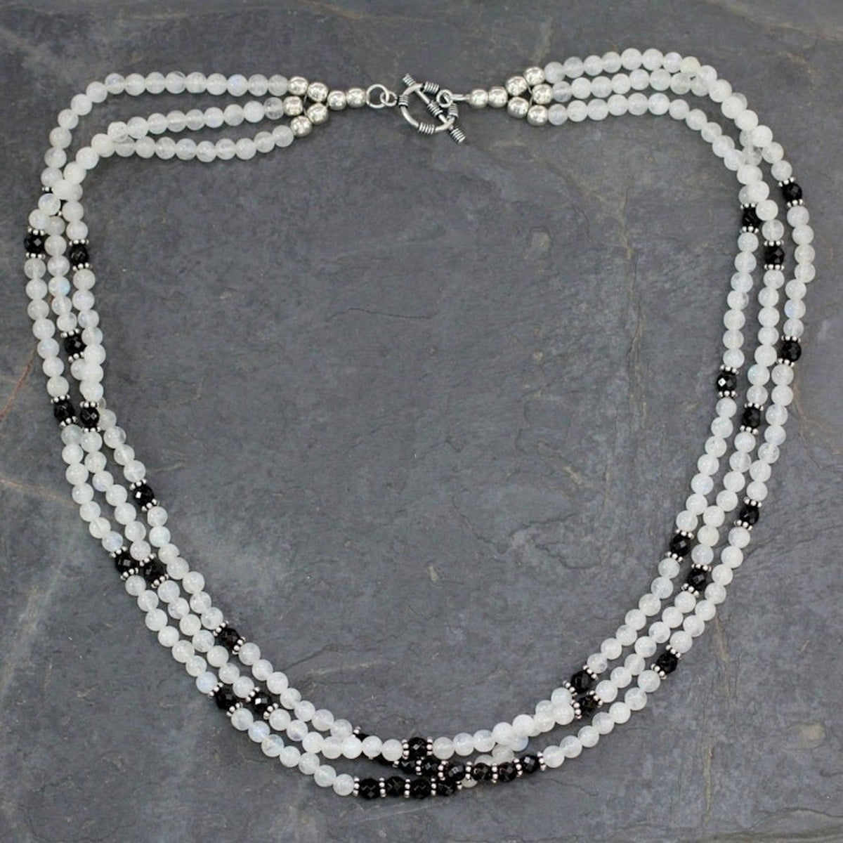 This three-strand necklace is crafted from rainbow moonstone, onyx, and sterling silver with a combination finish and a toggle clasp, measuring 18.5 inches long by 0.5 inches wide and weighing 1.52 ounces.