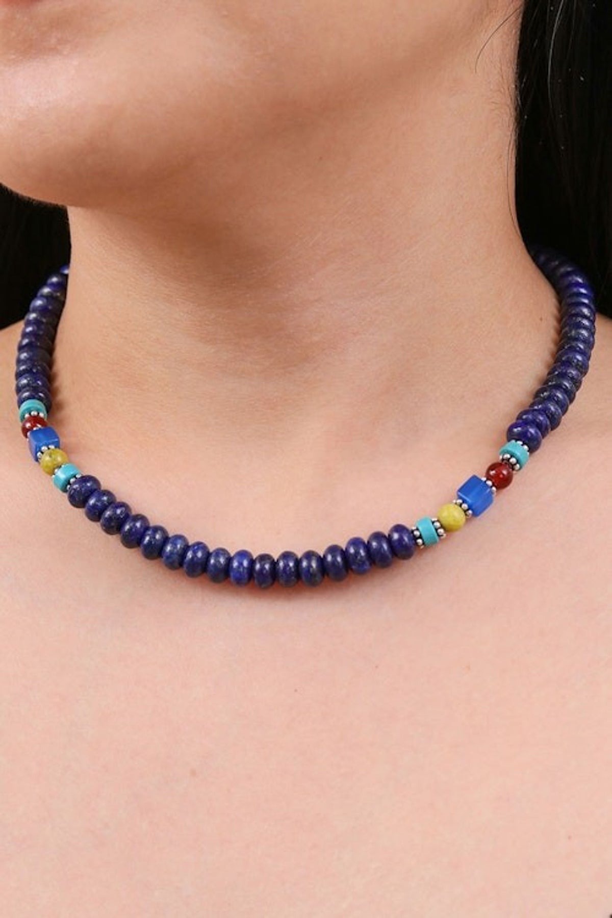 This necklace is crafted in Thailand from lapis lazuli, howlite, chalcedony, quartz, and 925 sterling silver with a combination finish and an S-hook or hook clasp. It measures 16.5 inches long and 5 mm wide with a 1.2-inch extender and weighs 0.10 pounds.