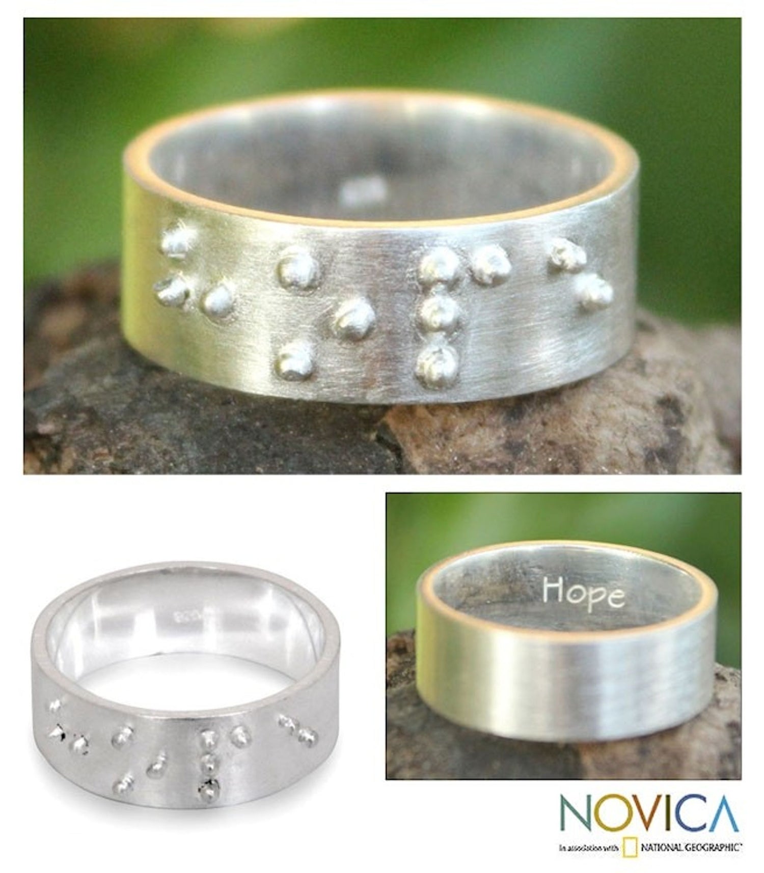 This Braille Hope band ring by Independent Artisans is an inspired and deeply personal design. Handcrafted from sterling silver, the ring is embossed with the Braille spelling for 'Hope' on the exterior and the English word for 'Hope' engraved on the inside. This design is a perfect example of a collection that balances delicacy and modern appeal with a commitment to community. This ring is more than a piece of jewelry; it is a way to share joy, beauty, and a powerful message of hope with the world, making it a truly unique and meaningful piece.