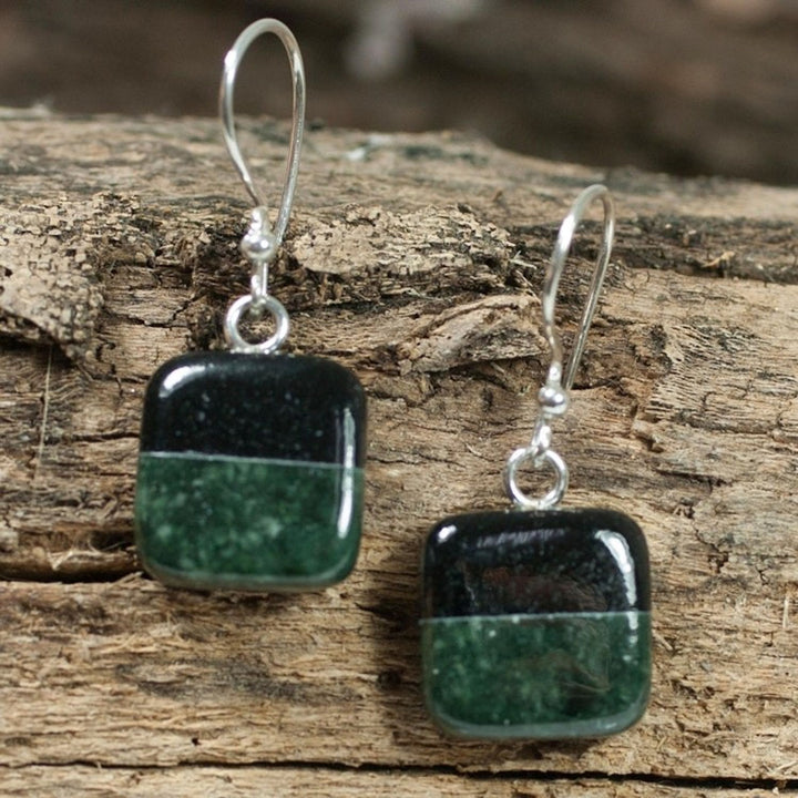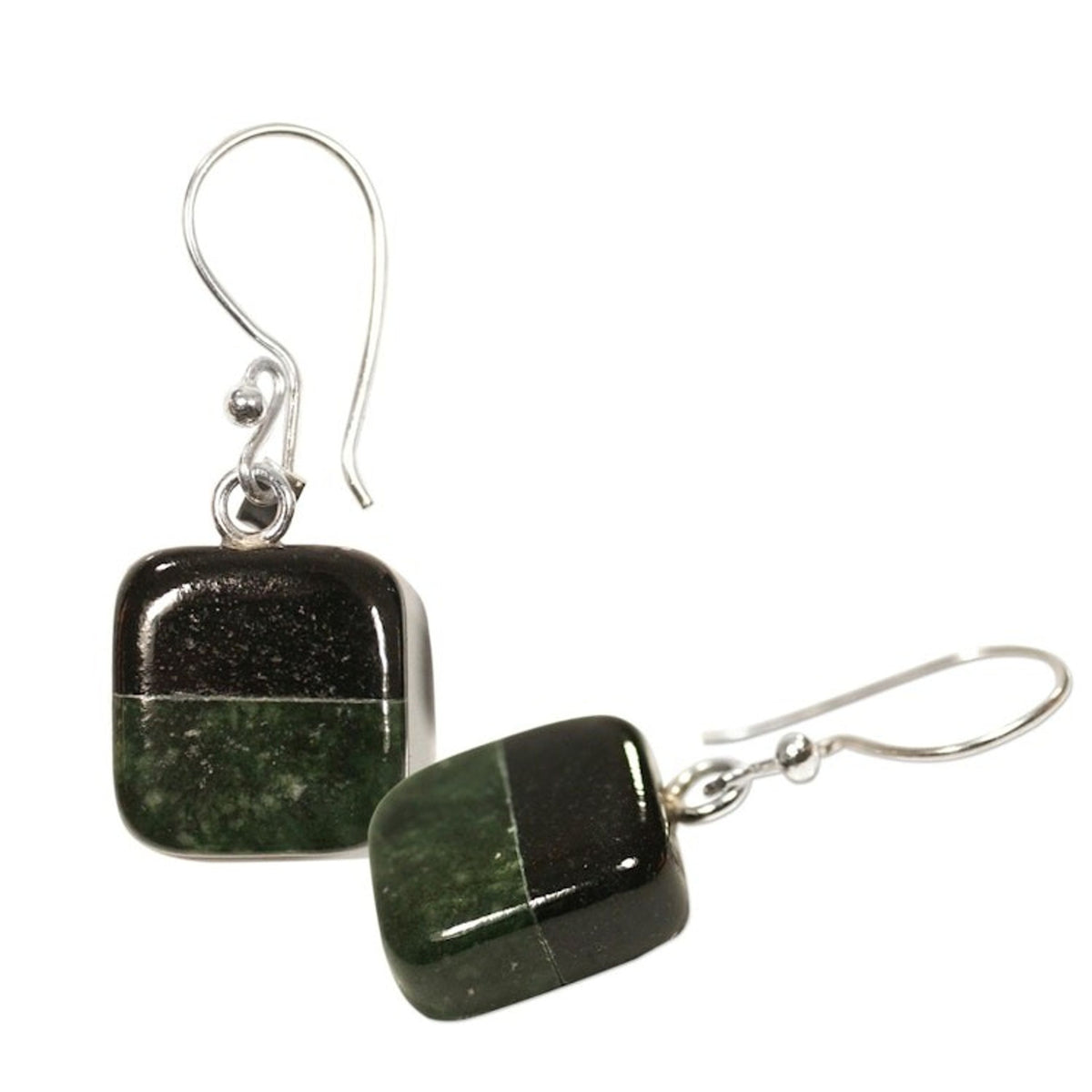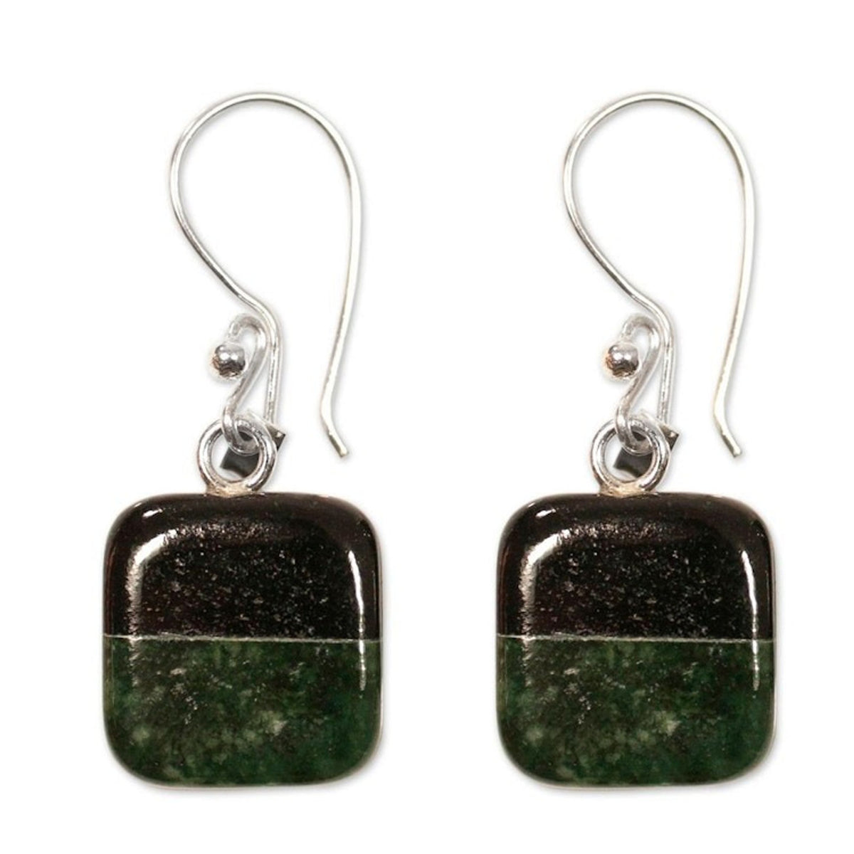 These Duality sterling silver jade dangle earrings by Independent Artisans showcase the natural beauty of black and green jade. Known to the Maya people as Ya'ax Chich, or "the source of life and fertility," jade was regarded as a sacred stone. This design is a perfect balance of color and form, crafted with high-polish sterling silver hooks. The earrings reflect a cultural heritage and a commitment to preserving traditions, all while drawing inspiration from the next generation. They are a powerful and meaningful accessory, deeply connected to Guatemala's spirit.