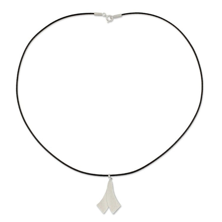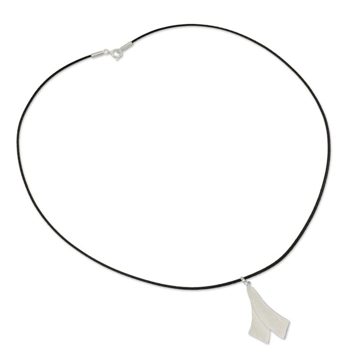 This Crossing Swords sterling silver necklace by Independent Artisans is an original and masculine design with a distinct character. The pendant, shaped like crossing swords, is crafted from sterling silver with a brushed-satin finish. It is worn on a dark brown braided waxed nylon cord, creating a refined balance of strength and artistry. This necklace embodies problem-solving, innovation, and a heartfelt wish to bring joy to those who wear it. It's a bold and meaningful piece, perfect for anyone who appreciates the combination of technical expertise and natural materials.