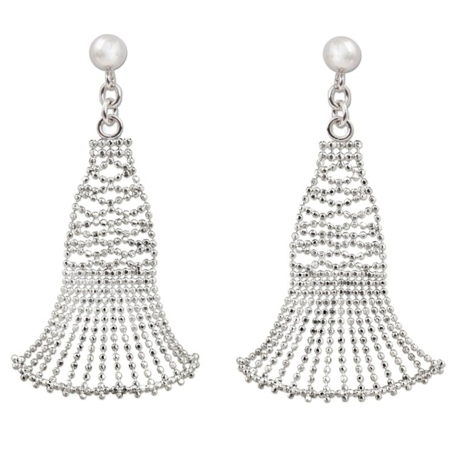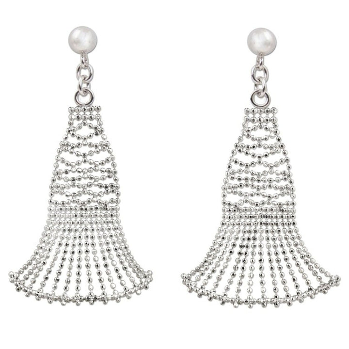 These Flowing Dresses fan-shaped sterling silver dangle earrings by Independent Artisans are a bold, complex, yet very feminine creation. Crafted from intricate sterling silver ball chains, the earrings are designed to look like charming, flowing dresses. This piece is a continuation of a family legacy, embodying both tradition and refinement. The graceful movement of the ball chains adds a touch of elegance and whimsy, making these earrings a luxurious and versatile accessory.