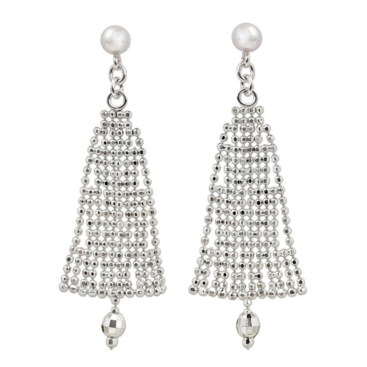 These Evergreen Trees festive sterling silver chandelier earrings by Independent Artisans are an elegant and festive accessory. Crafted from intricate silver ball chain, the earrings are shaped like evergreen trees and accented with dangling silver beads. This design is a continuation of a family legacy that preserves northern Thailand's heritage through fine silver. The luxurious yet versatile design embodies both tradition and refinement, making these earrings perfect for holiday parties or a touch of daily glamour.