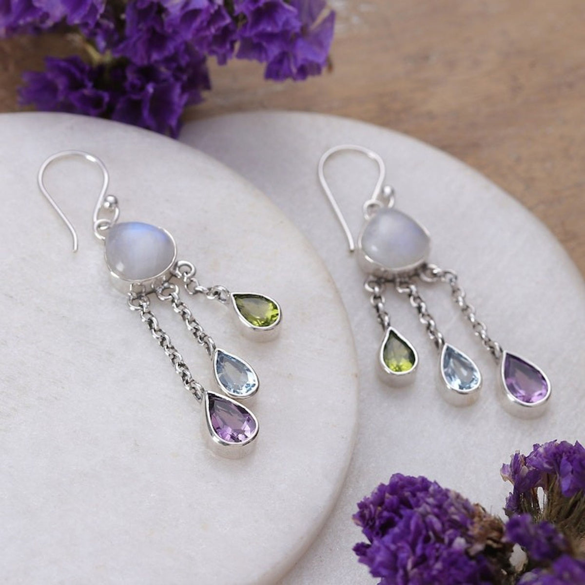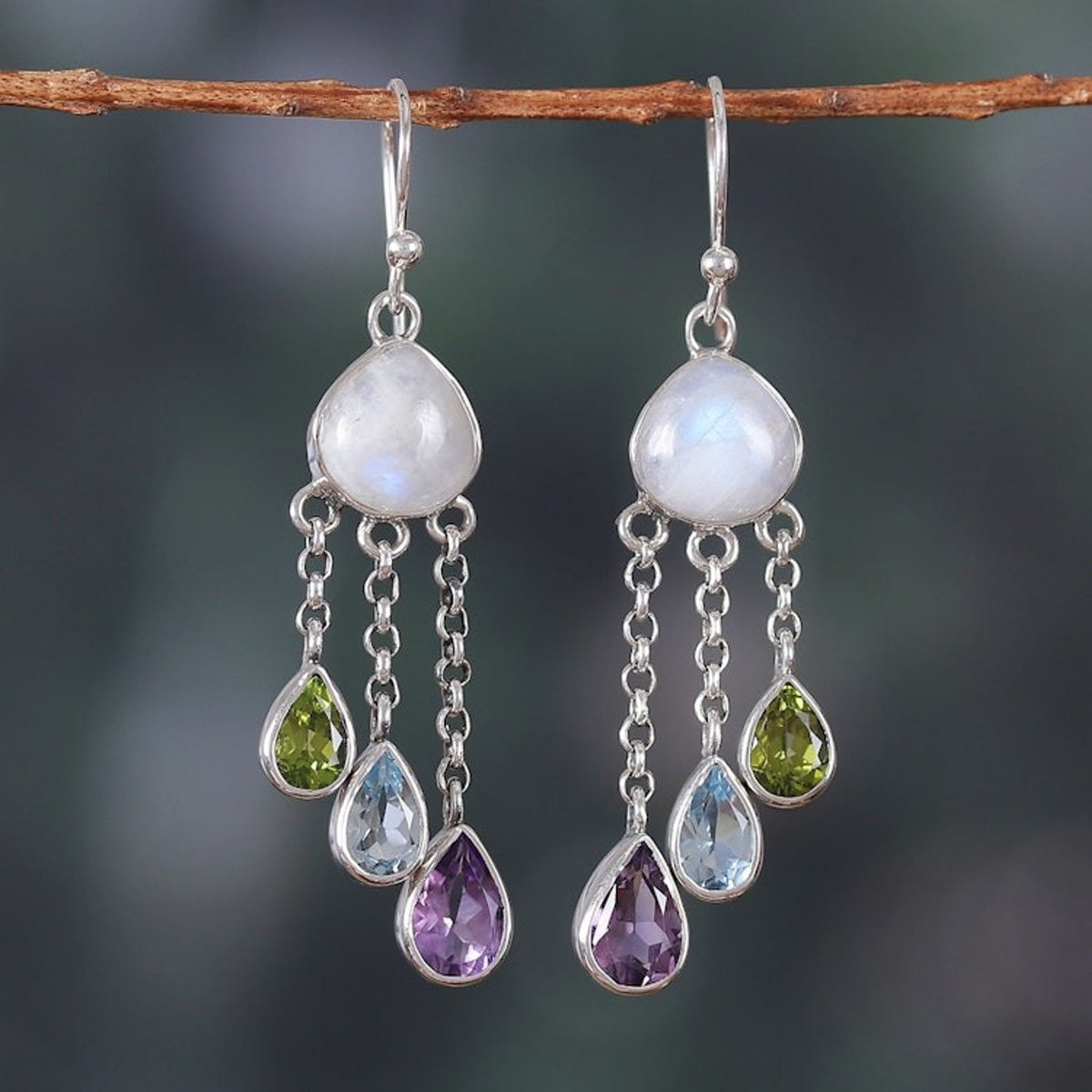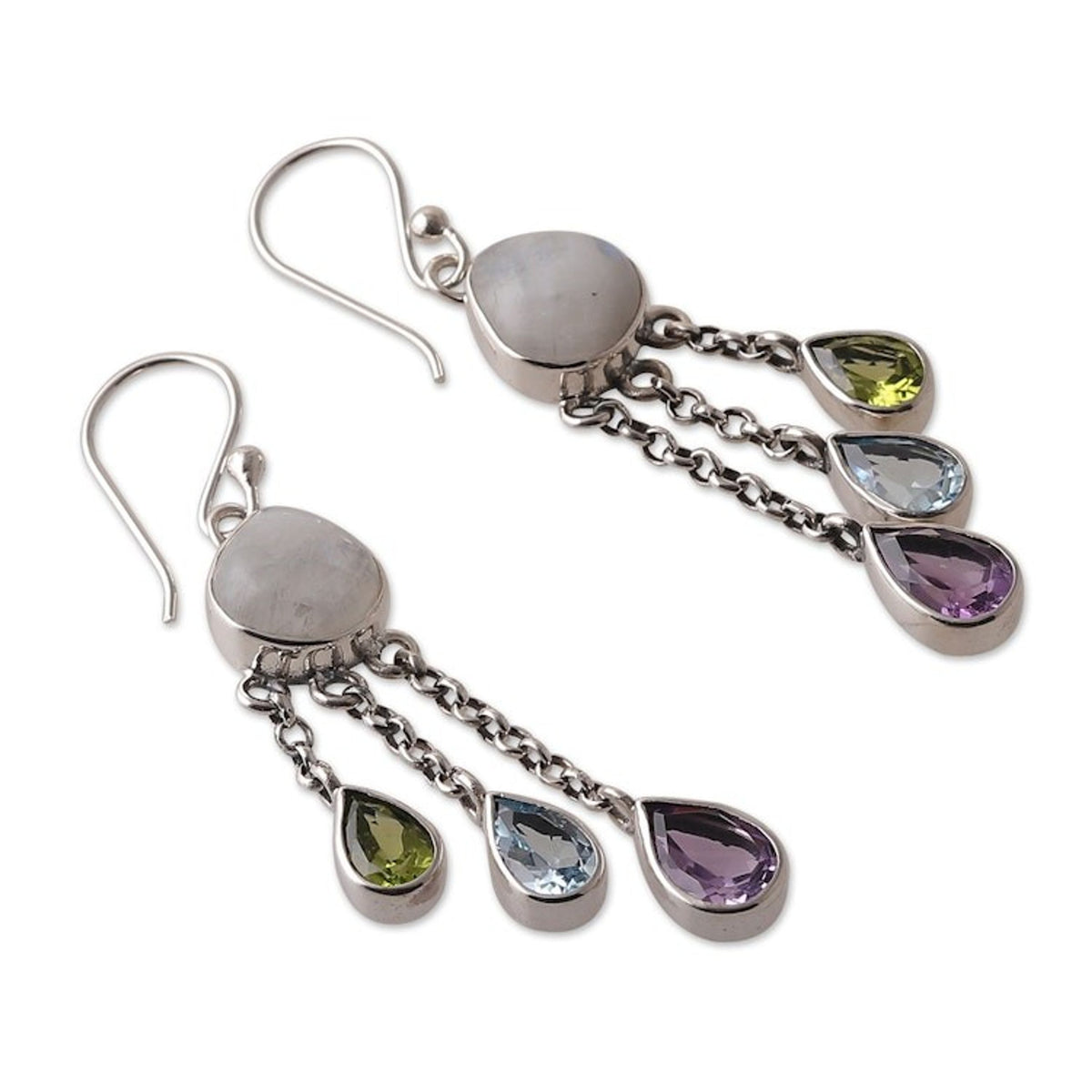 Handcrafted in India from 925 sterling silver, rainbow moonstone, amethyst, blue topaz, and peridot with a combination finish. The hook earrings measure 2.1 inches long by 0.6 inches wide by 0.3 inches deep and weigh 0.30 ounces.