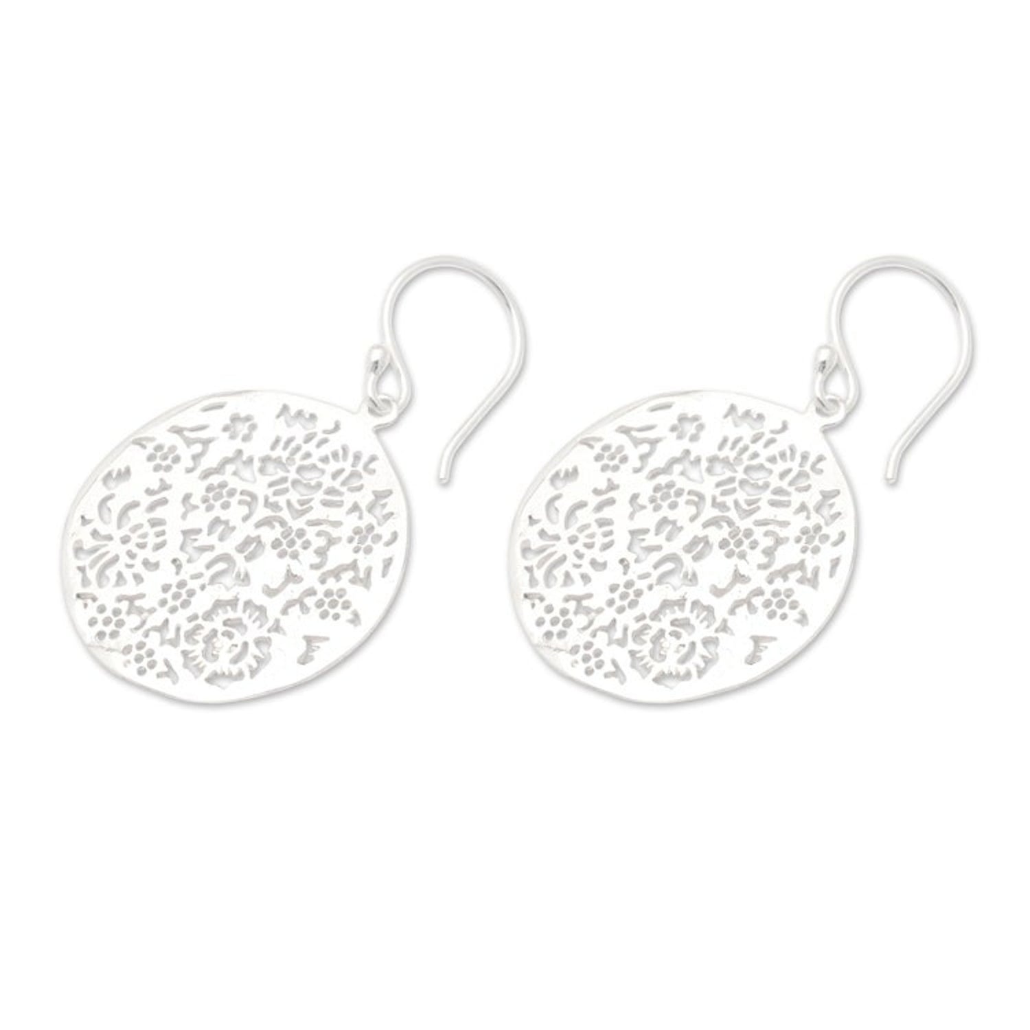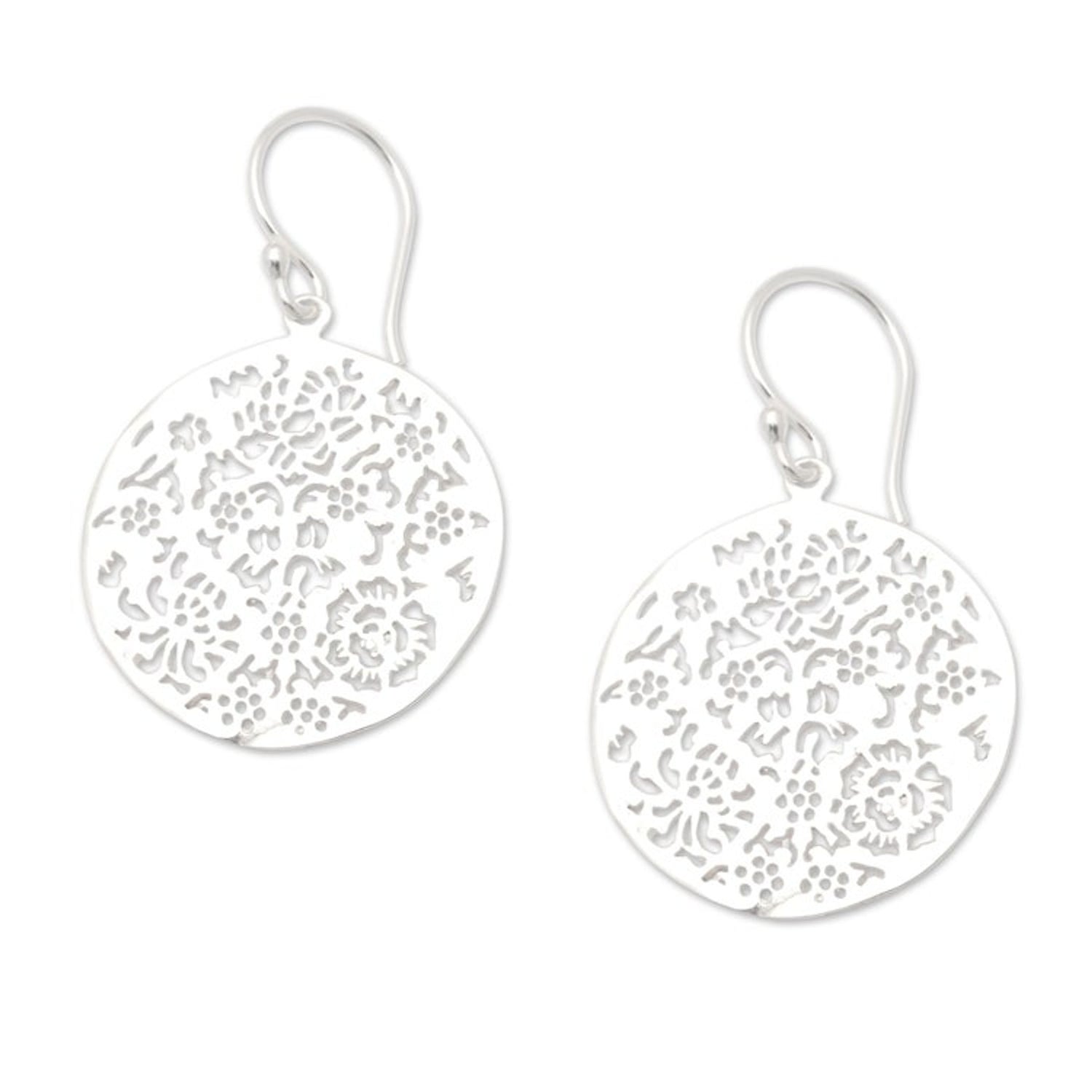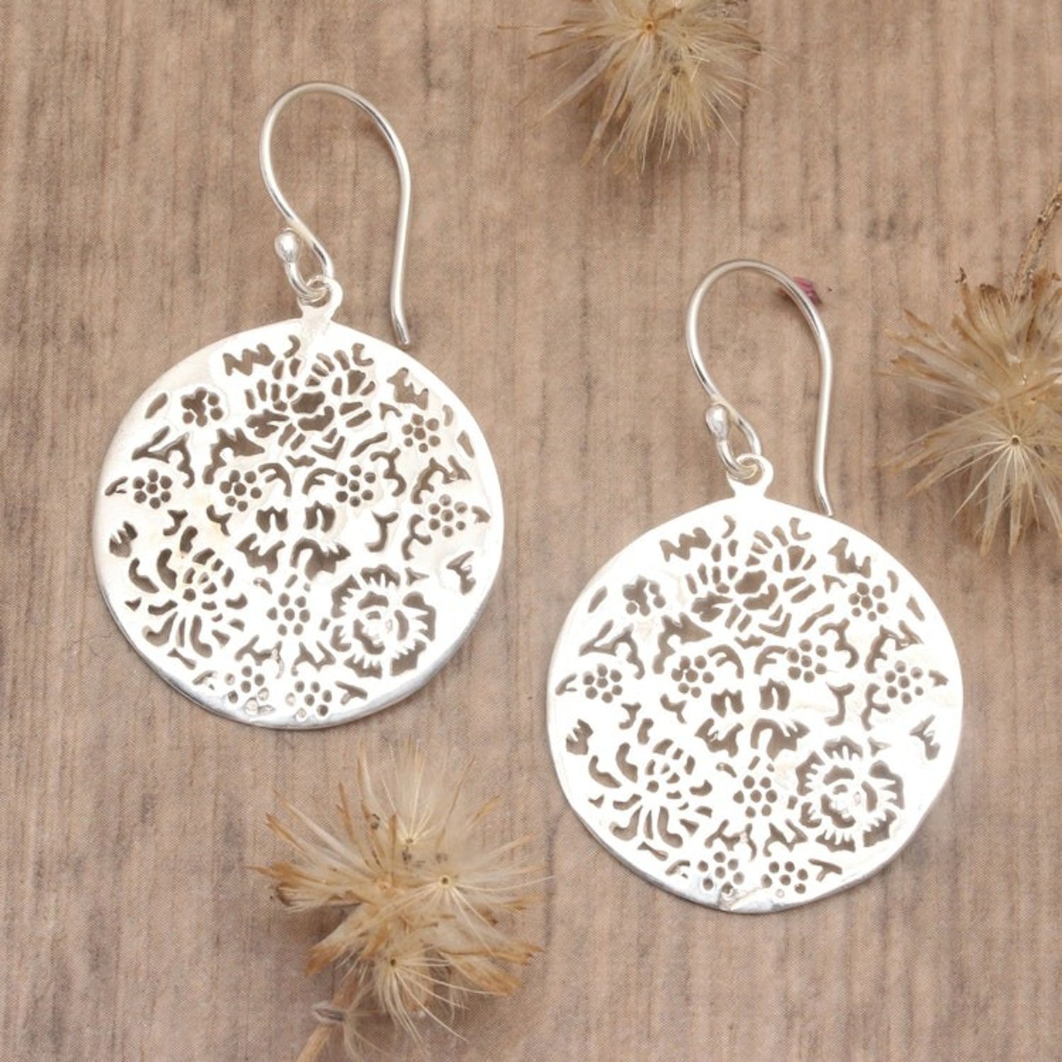 Floral and Leafy Round Sterling Silver Dangle Earrings 'Blooming Summer'