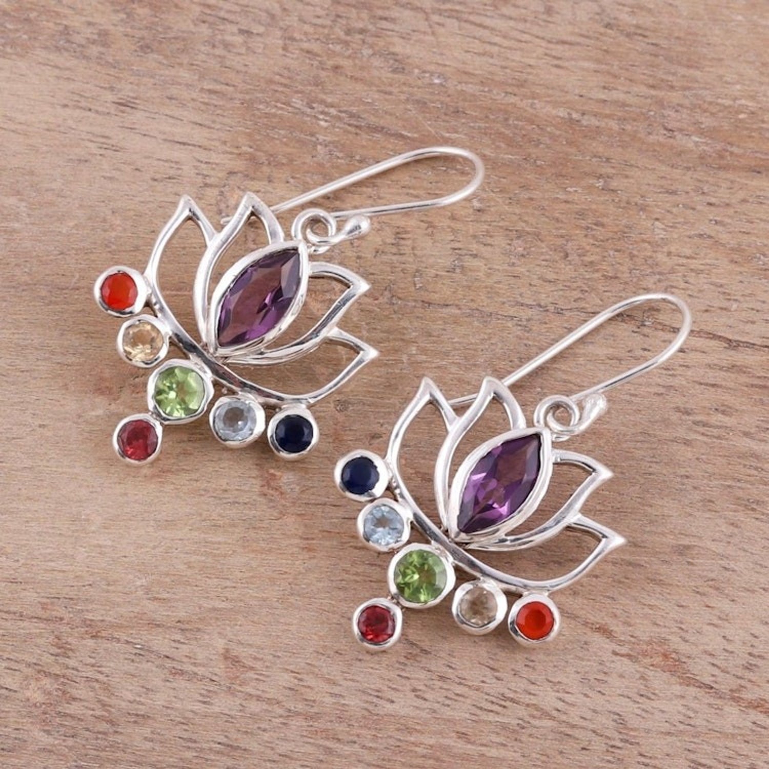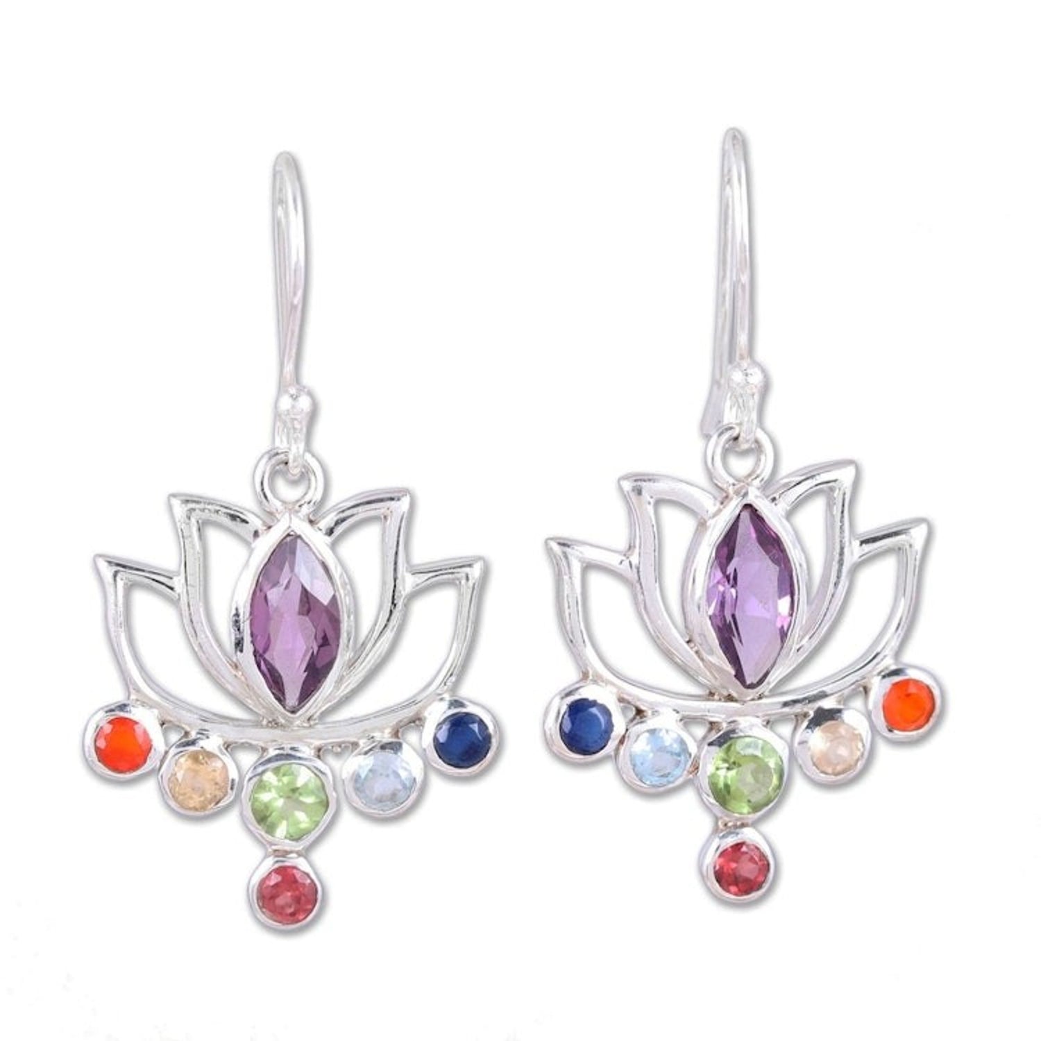 These Floral Multi-Gemstone Chakra Dangle Earrings from India 'Lotus Chakra' by Chintan represent the seven chakras, or energies of the body, bringing harmony and balance to the wearer. The high-polish sterling silver openwork, crafted in the shape of lovely lotus flowers, symbolizes purity and spiritual awakening. Faceted gemstones of carnelian, citrine, peridot, blue topaz, sapphire, and garnet accentuate marquise amethysts, totaling 4.5 carats. These earrings elegantly fuse contemporary style with timeless Indian craftsmanship, appealing to both modern sensibilities and a deep sense of cultural heritage.