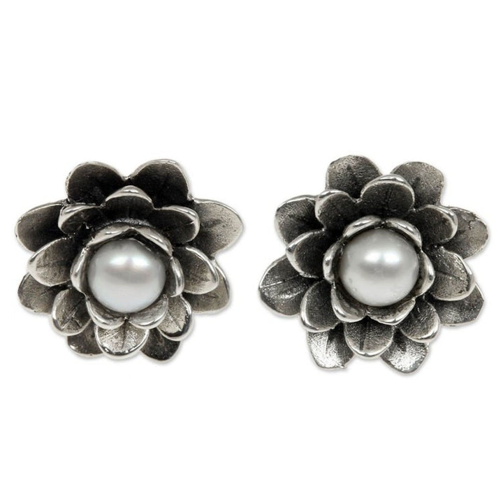 Floral Pearl and Sterling Silver Button Earrings 'White-Eyed Lotus'