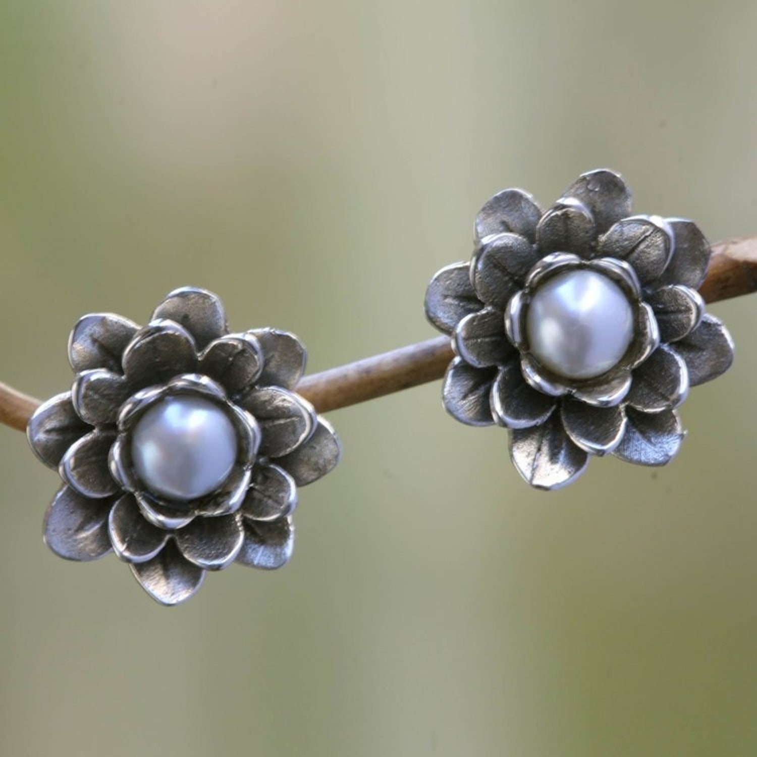 These Floral Pearl and Sterling Silver Button Earrings 'White-Eyed Lotus' by Nyoman Rena are a serene and elegant adornment. Symbols of holiness and divinity, lotus flowers unfold their petals with glistening elegance, each holding a lustrous cultured freshwater pearl. This design is a testament to Rena's ability to blend his carving skills with metalwork, creating a distinctive style that captures both Balinese heritage and contemporary design. The antique finish gives the earrings a timeless feel, making them a cherished and sophisticated accessory.