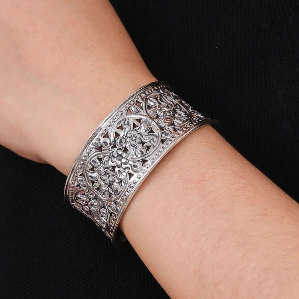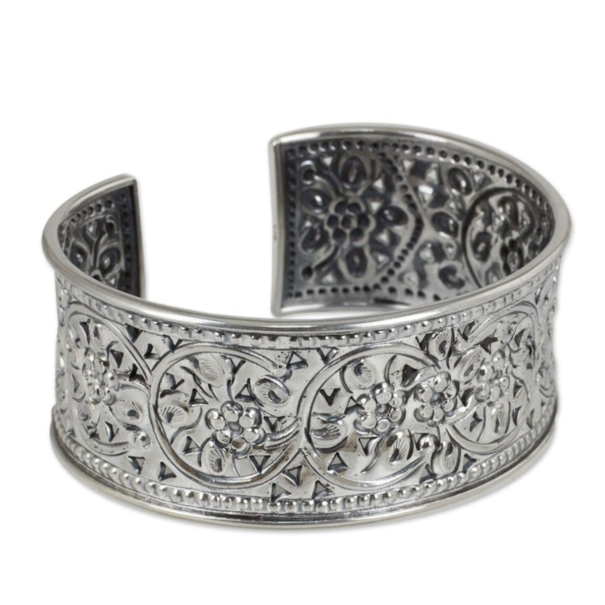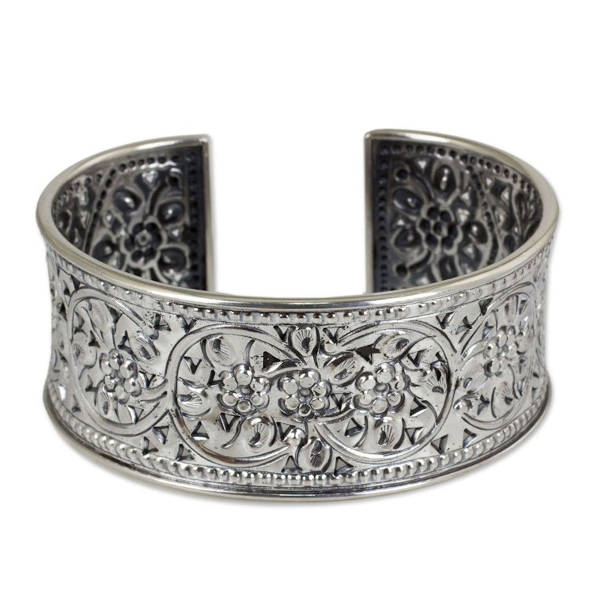 This Floral Silver Cuff Bracelet 'Renewal' by Achara is an elegant piece that reflects a mission of cultural preservation and support for local artisans. The concave cuff is adorned with lavish arabesques that encircle the wrist, while graceful silver tendrils are topped with delicate jasmine blossoms. The combination finish highlights the intricate details and the remarkable craftsmanship of the hill tribe silversmiths whose traditions Achara is dedicated to uplifting. This bracelet is an invitation to join an extended family of artistry and purpose, making it a truly meaningful accessory.