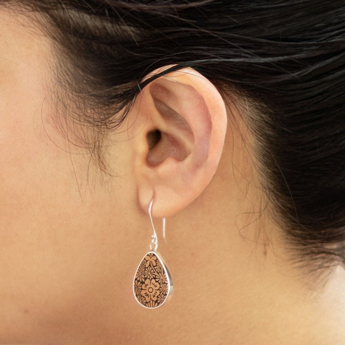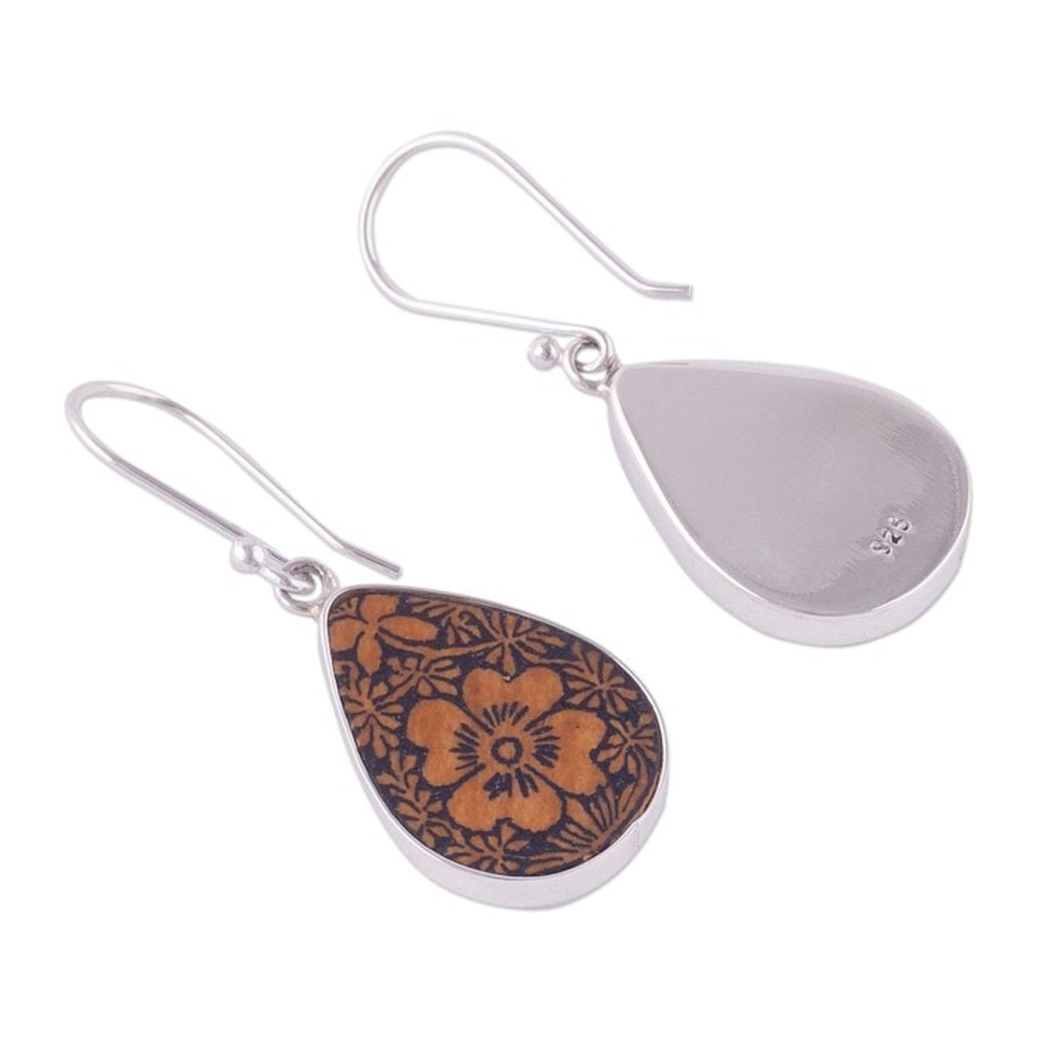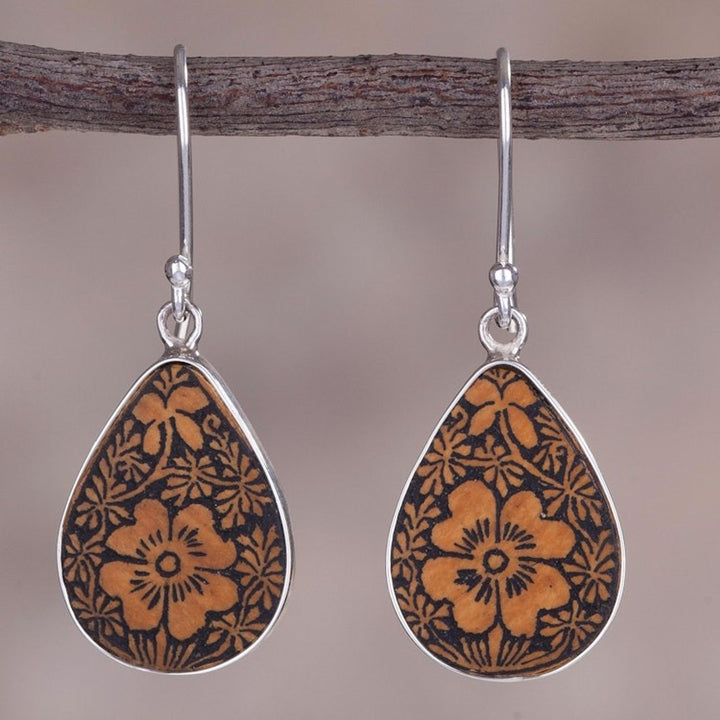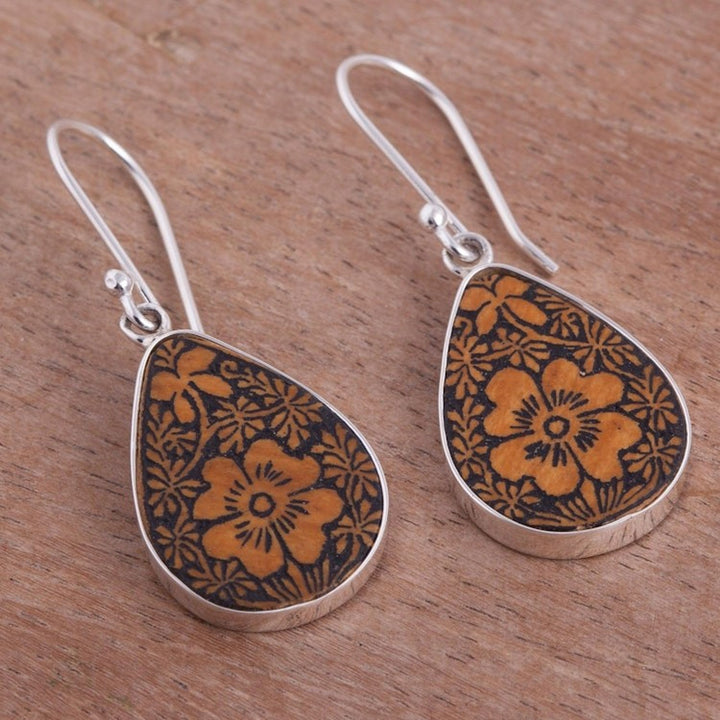 These Floral Sterling Silver and Pumpkin Shell Earrings from Peru 'Margarita Garden' by Jose Luis Pariona are a unique and charming accessory. The teardrop pendants are made from carved pumpkin shell, with beautiful margarita flowers engraved into them, a nod to the natural artistry found in Peru. The pumpkin shell is gracefully framed by high-polish sterling silver, which adds a refined touch to the organic material. This design captures a beautiful blend of heritage and personal expression, sharing a piece of Peru's rich history and culture with the world.