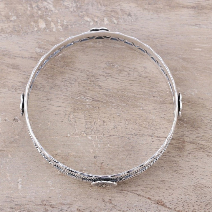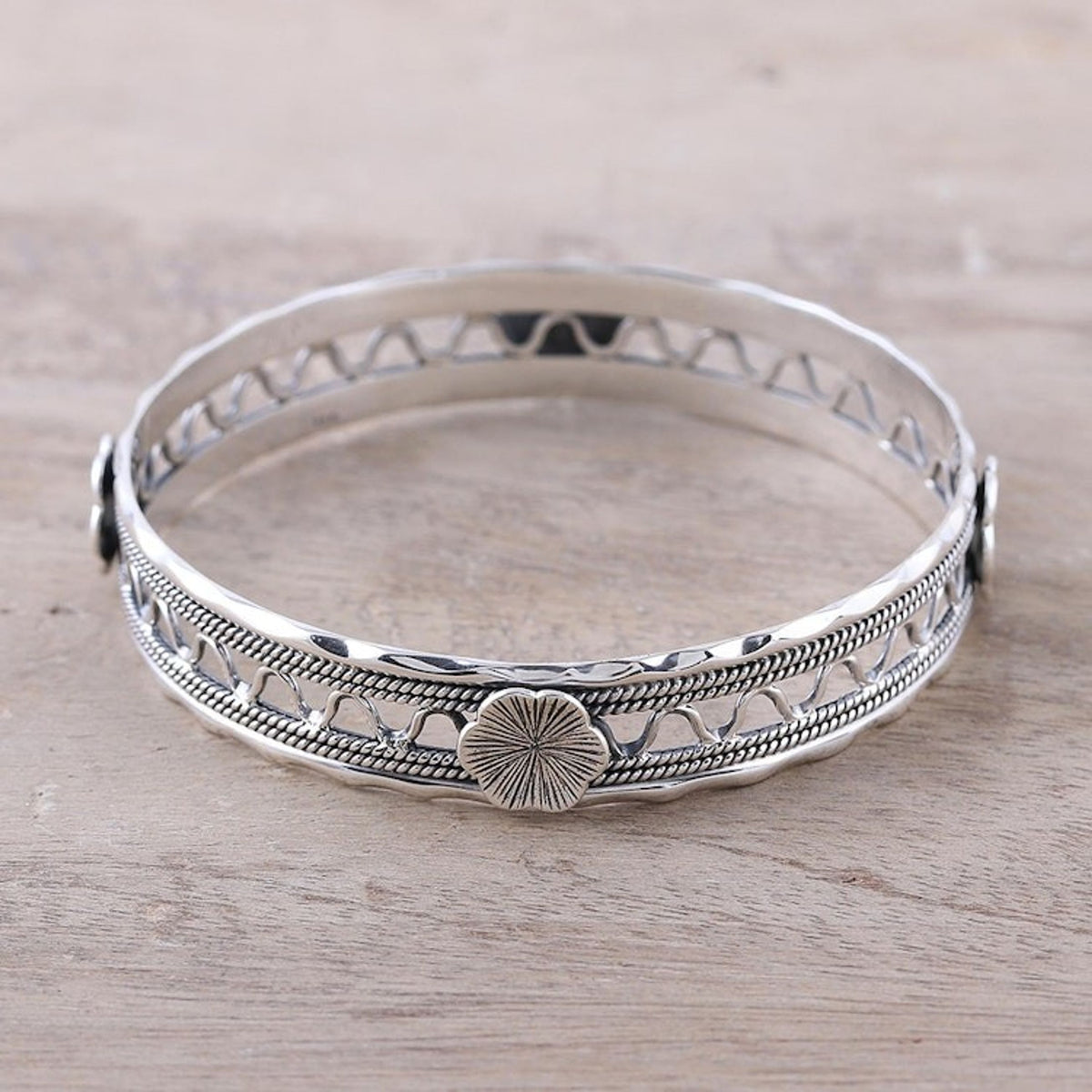 This Floral Sterling Silver Bangle Bracelet from India 'Floral Wave' by Bhavesh is a stunning piece that blends elegant patterns with traditional Indian artistry. The bangle features a graceful wave pattern flanked by rope and hammered motifs, which gives the bracelet a unique texture and dimension. Four oxidized flowers punctuate the design, adding a vintage feel and a touch of nature's beauty. This piece is a testament to Jaipur’s renowned jewelry traditions and the artisan's commitment to preserving cultural essence while connecting with a global audience.