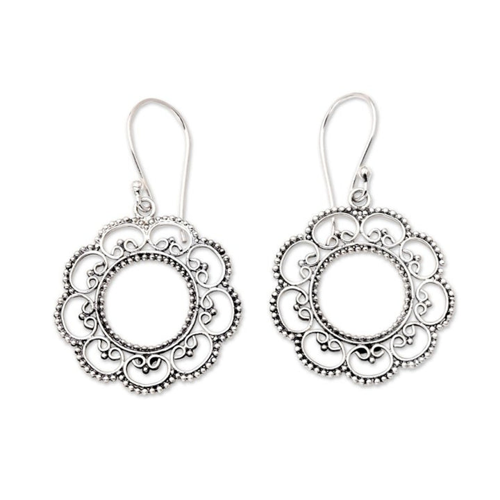These Floral Sterling Silver Dangle Earrings 'Lacy Sunflower' by Kadek Wijanegara are a spectacular accessory that evokes a lacy, dreamlike illusion. The shining sunflowers are framed with delicate petals, appearing as if they are dancing in the sun. This design reflects the artisan's philosophy of combining technical skill with soulful intention, resulting in a piece that is both simple and refined. These earrings are perfect for adding a touch of soulful artistry to any look, all while honoring Balinese traditions.
