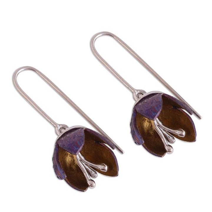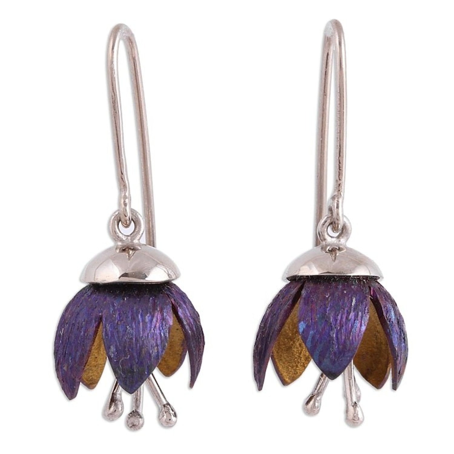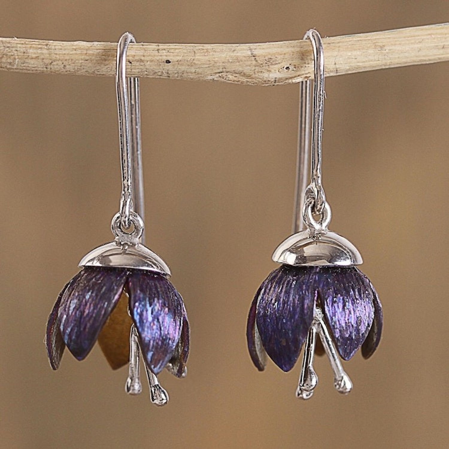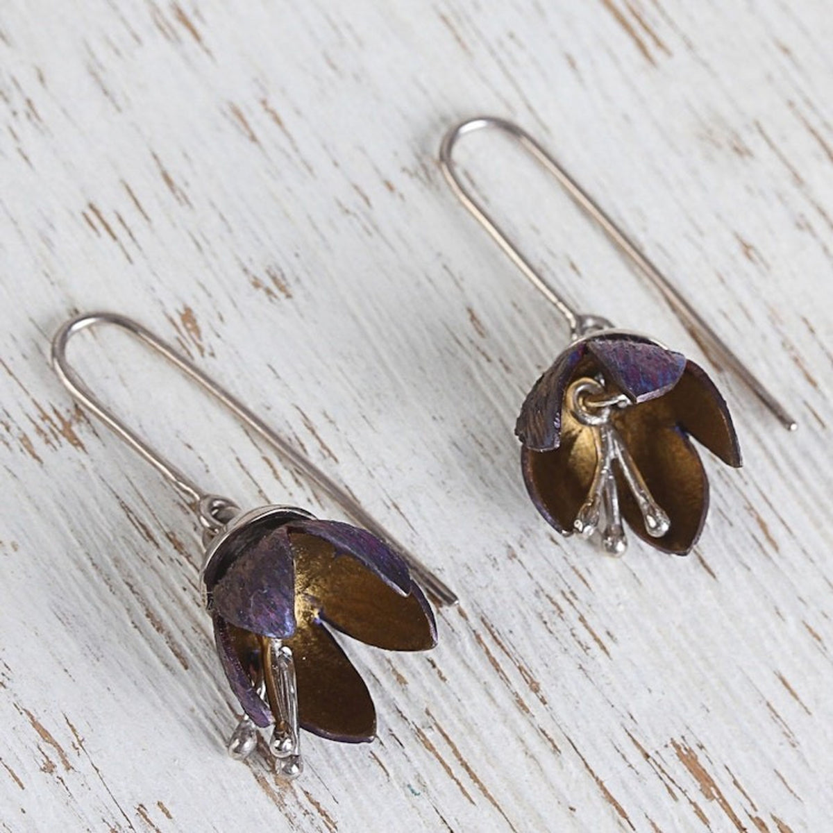 These Floral Titanium Plated Sterling Silver Dangle Earrings 'Button Flowers' by Diana Solis are as charming as buttons, with a modern twist. Two gleaming purple flowers are handcrafted from sterling silver and finished with a unique titanium plating, which gives them a distinct color and shine. This contemporary design is also enhanced with sterling silver accents, highlighting the artisan's motto to "keep tradition alive, but modernize for the young." These earrings offer a unique and elegant expression of cultural heritage and innovation.